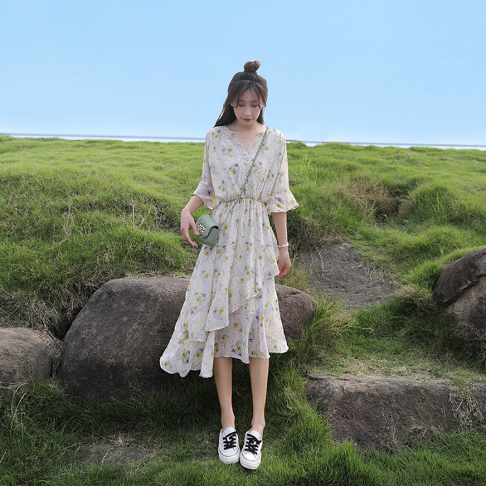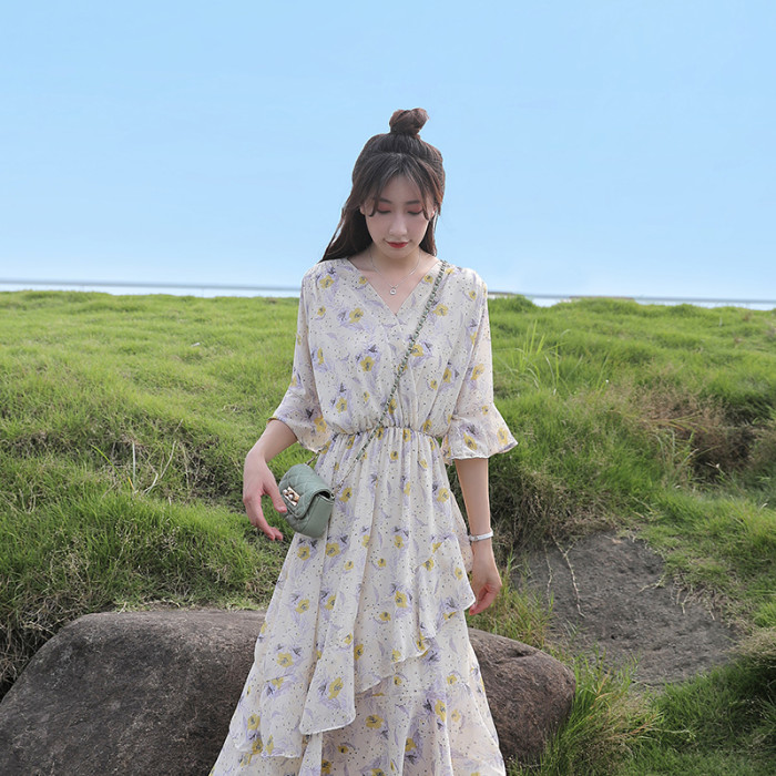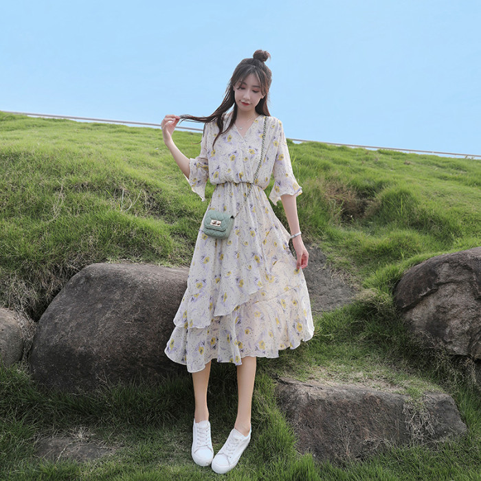 碎花雪紡連衣裙女夏2025新款收腰顯瘦氣質小清新仙女a字蛋糕裙子