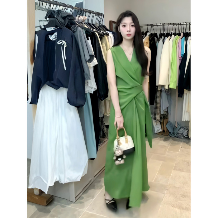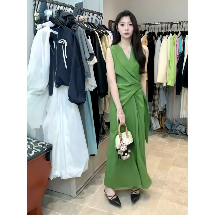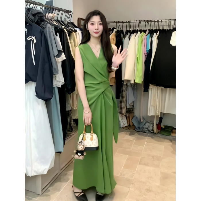 法式V領一片式連衣裙女2025夏季新款高級感氣質收腰顯瘦無袖長裙