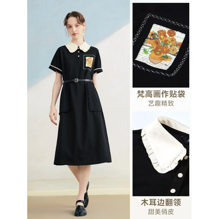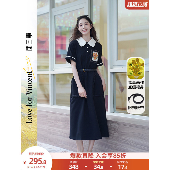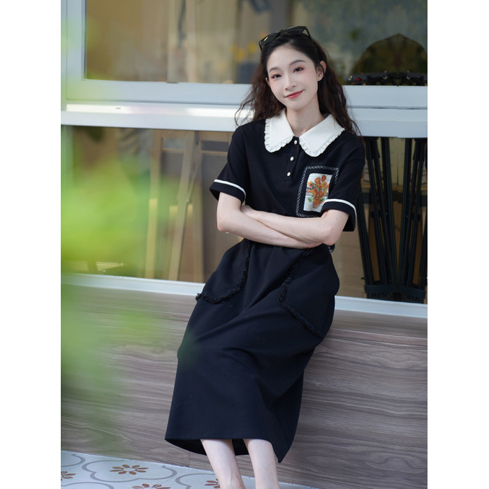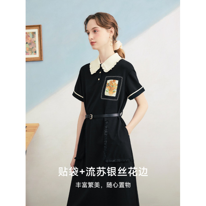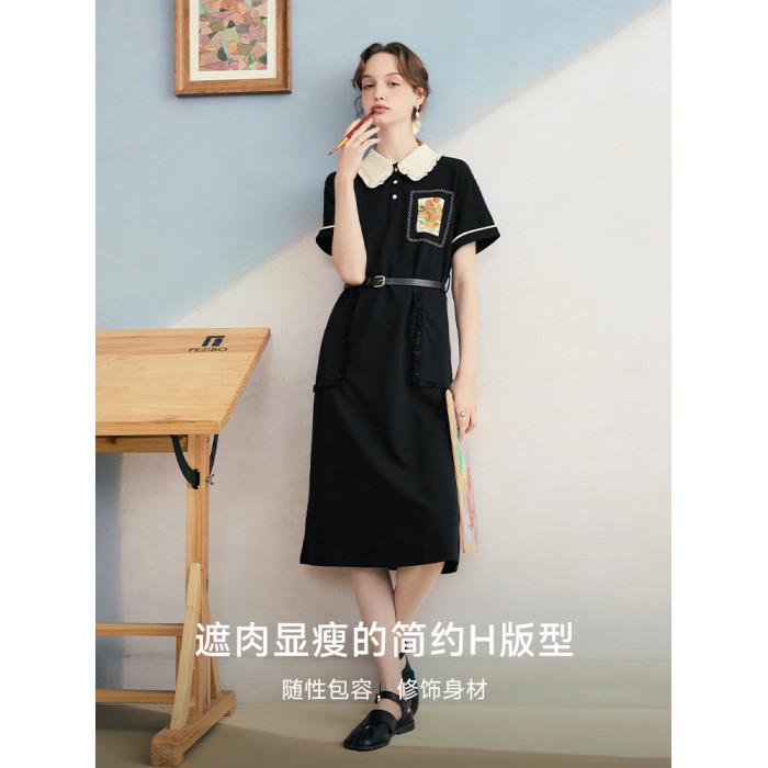 兩三事黑色連衣裙新款polo長裙休閒顯瘦通勤漂亮裙子梵花遺夢