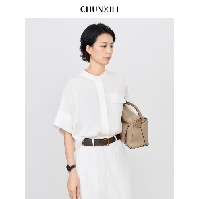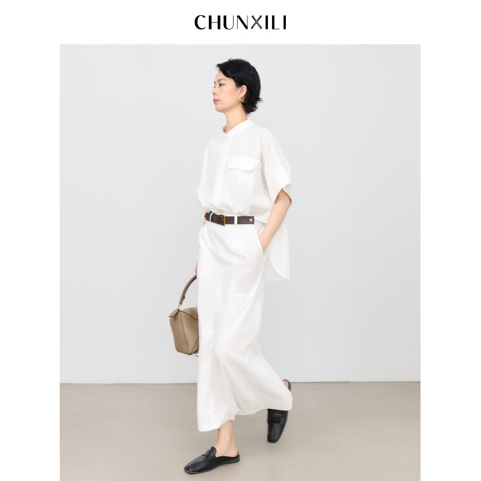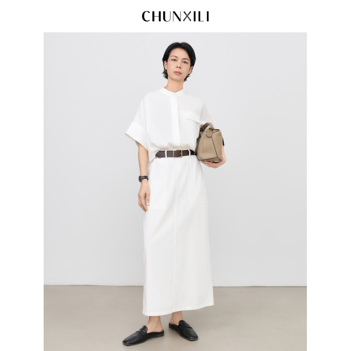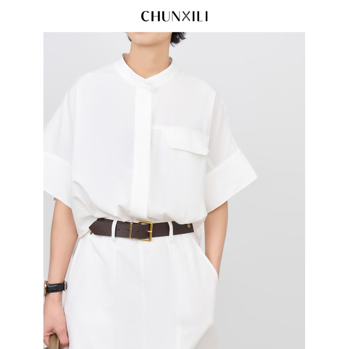 chunxili/春熙裡 短袖襯衣裙 帶腰帶 落肩氣質束腰套頭白色連衣裙