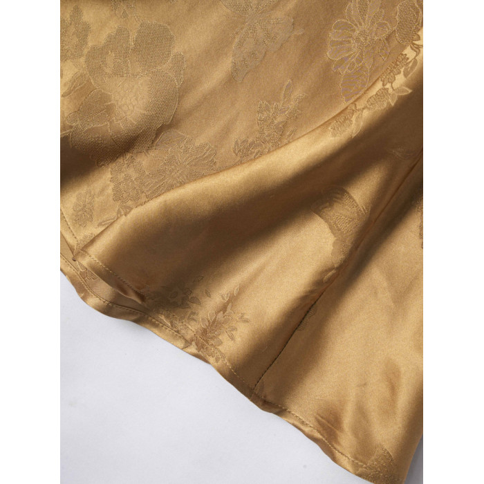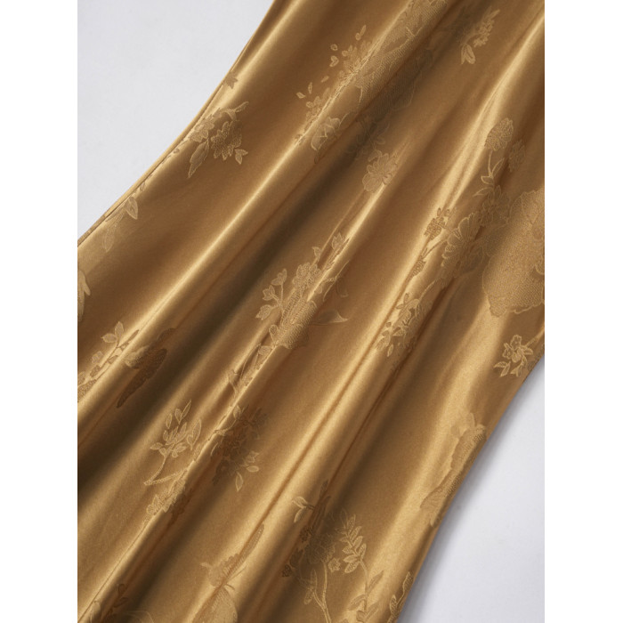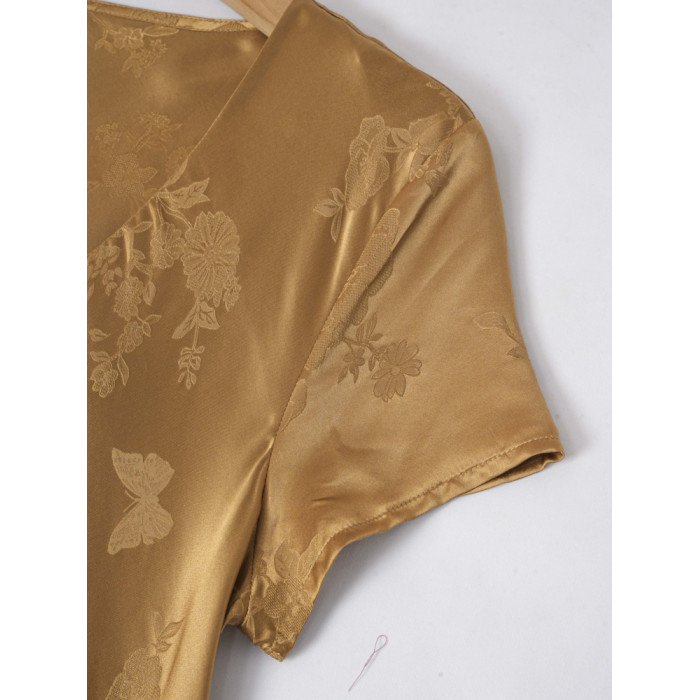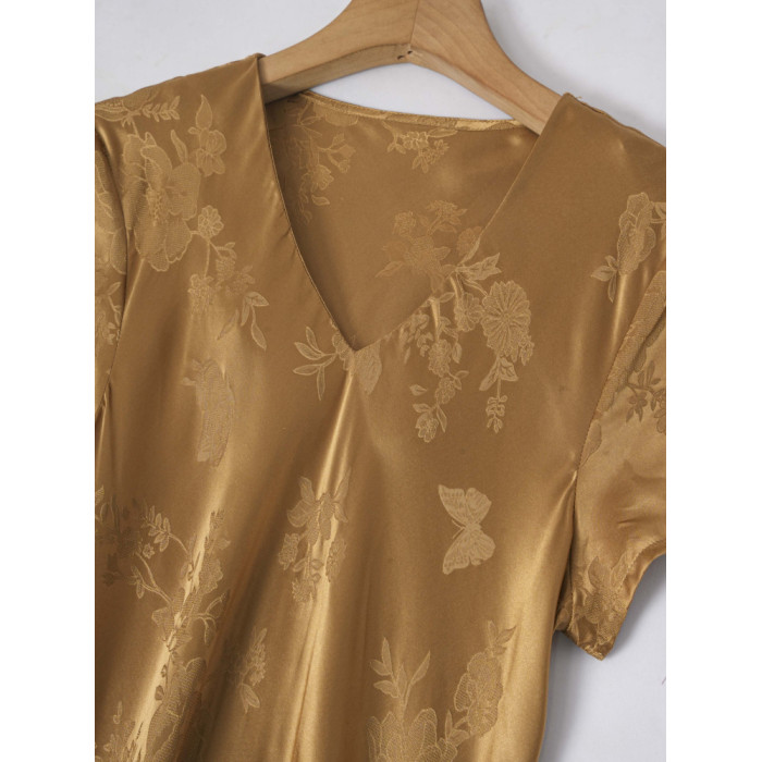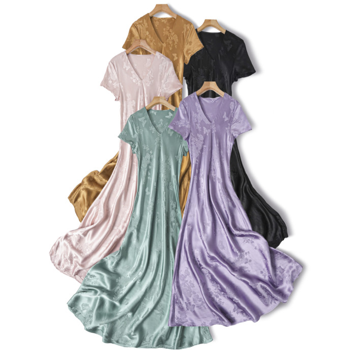 高階品質!精美花蘿真絲連衣裙女斜裁修身桑蠶絲V領禮服裙短袖新