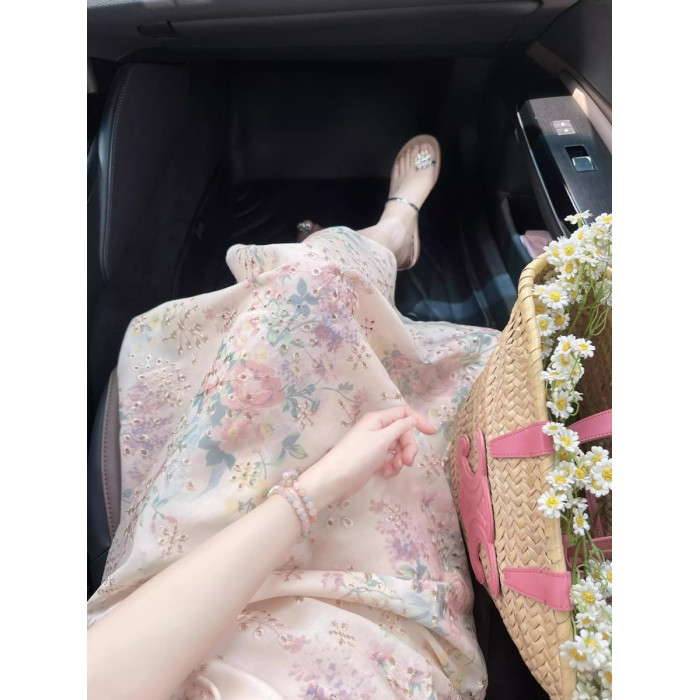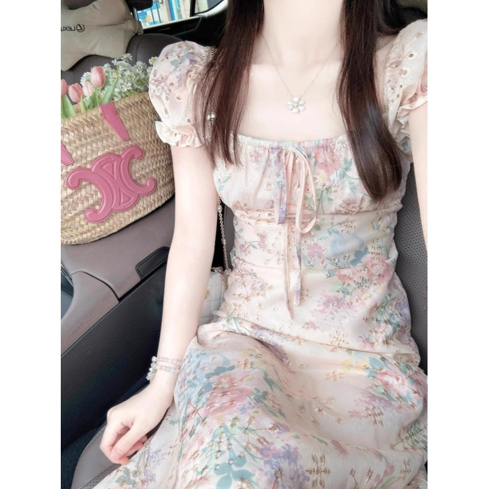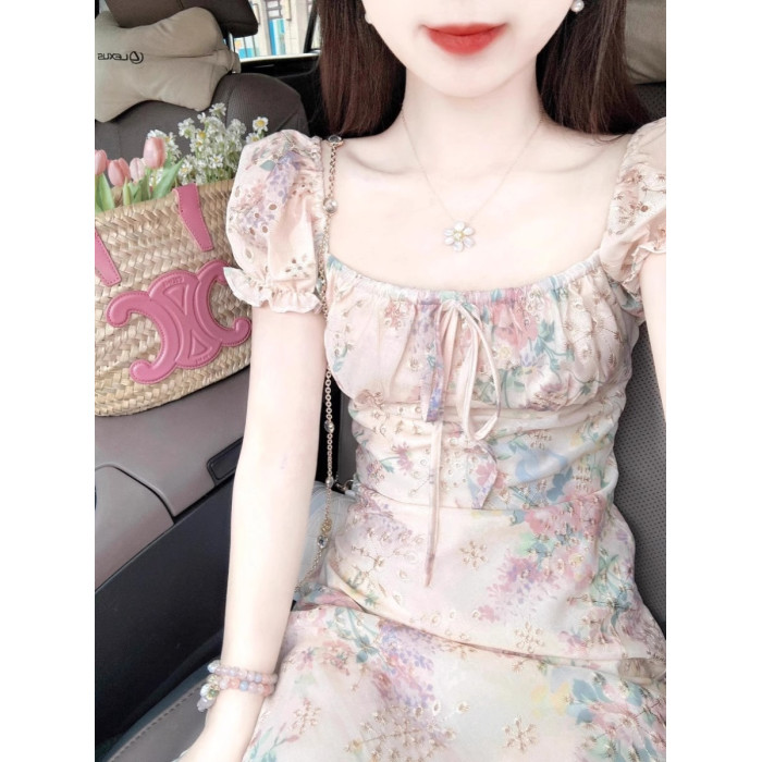 歐洲站2025新款茶歇法式絕美碎花長裙高級感泡泡袖方領連衣裙女夏