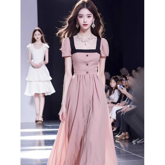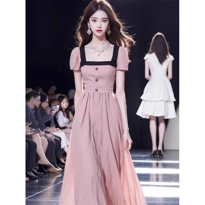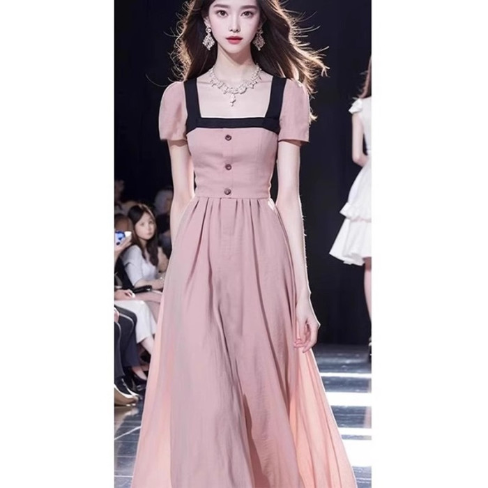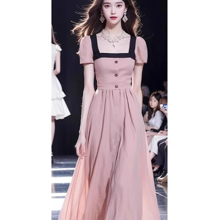 歐洲站夏季2025新款法式高級感粉色長裙子收腰顯瘦方領氣質連衣裙