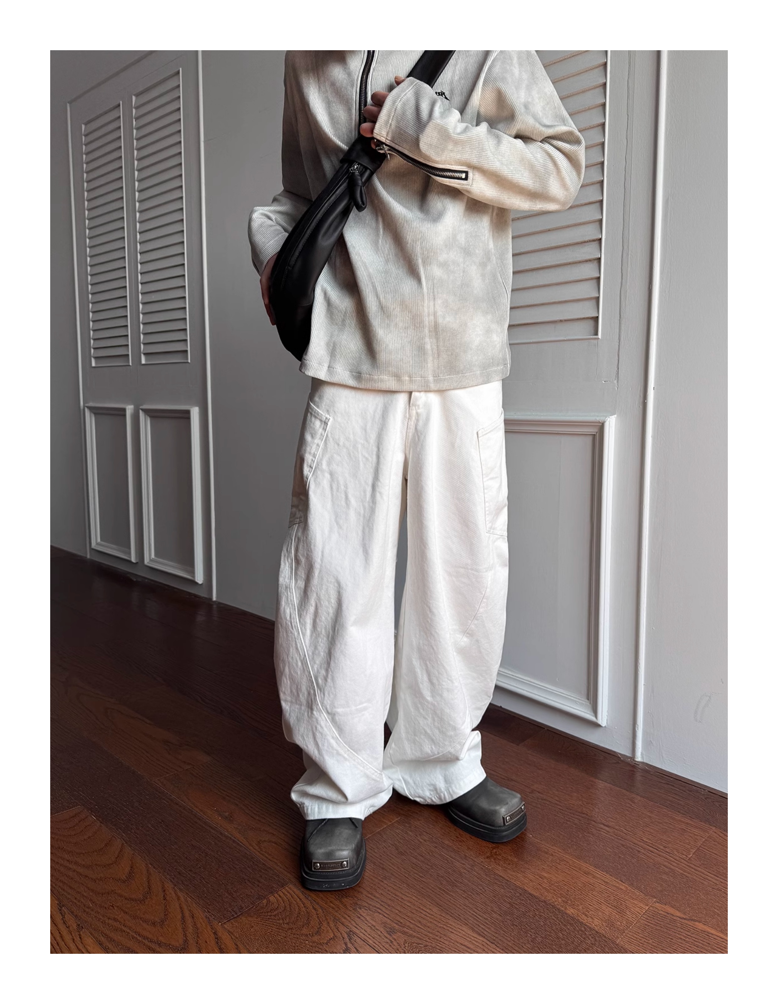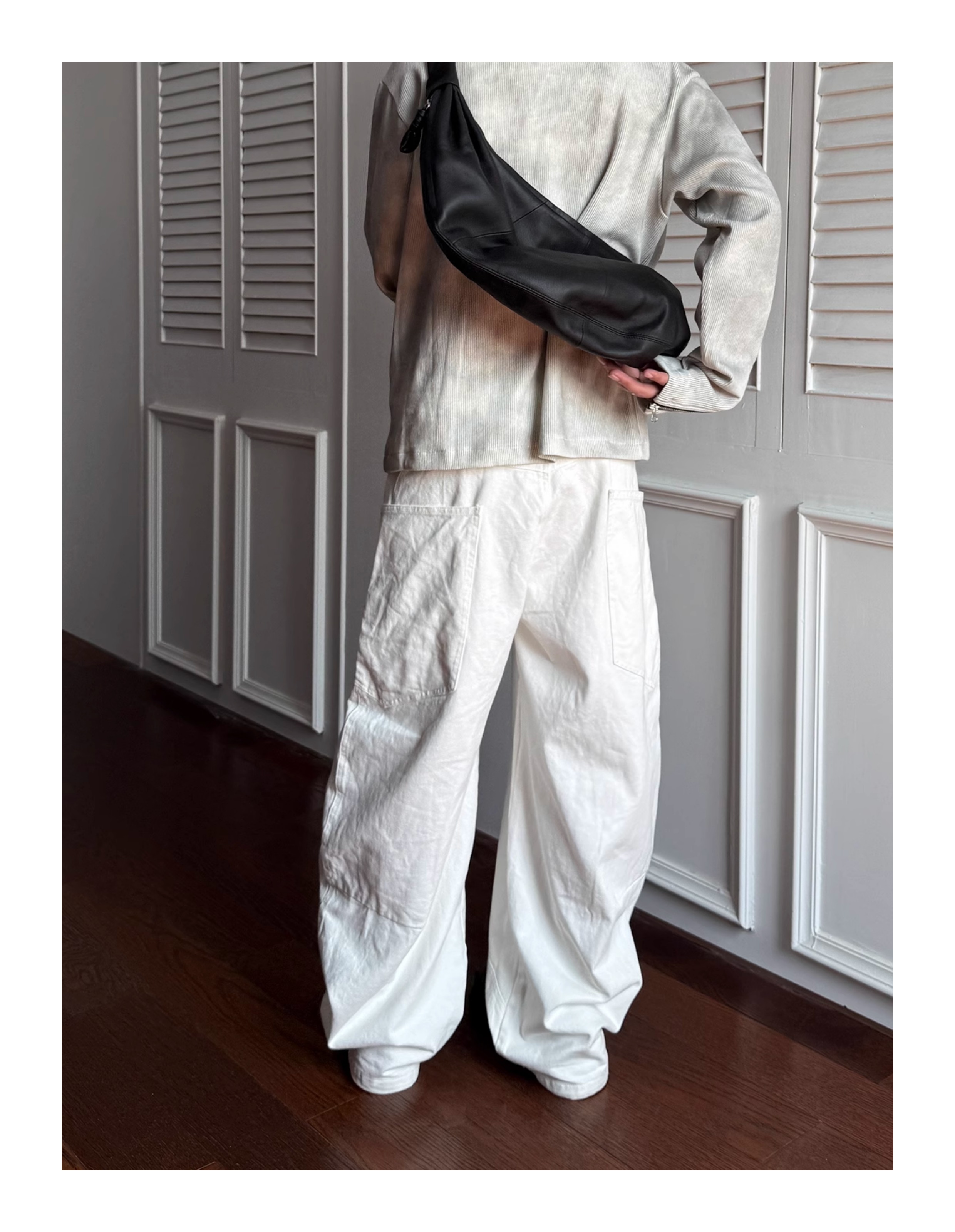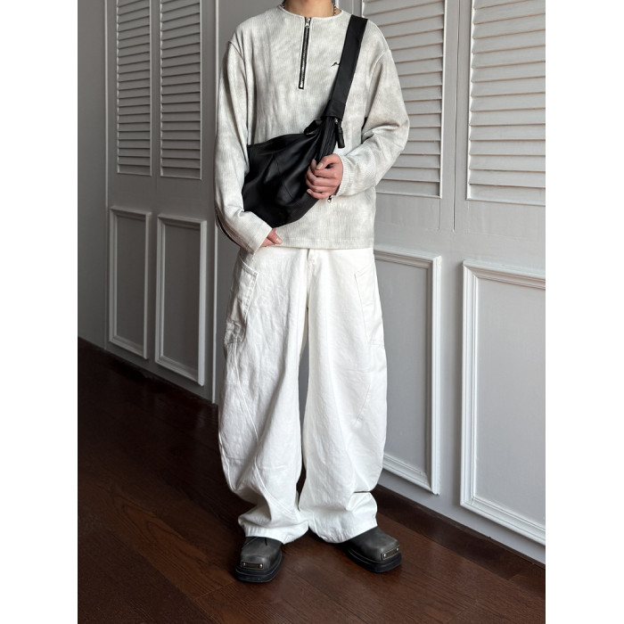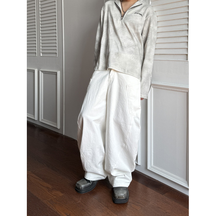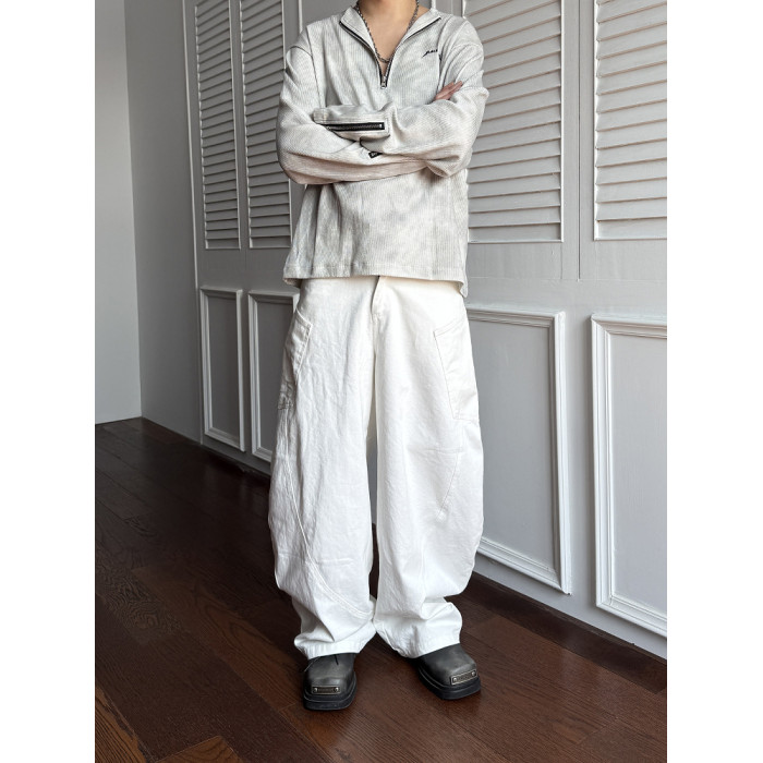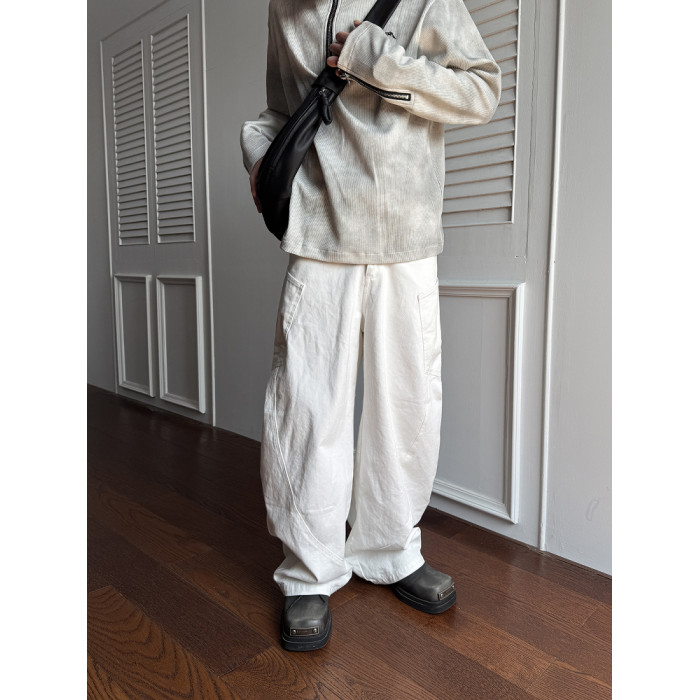 KUBU美式復古大口袋彎刀褲男痞帥高級感白色褲子寬松直筒濶腿褲潮