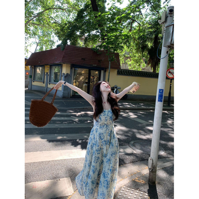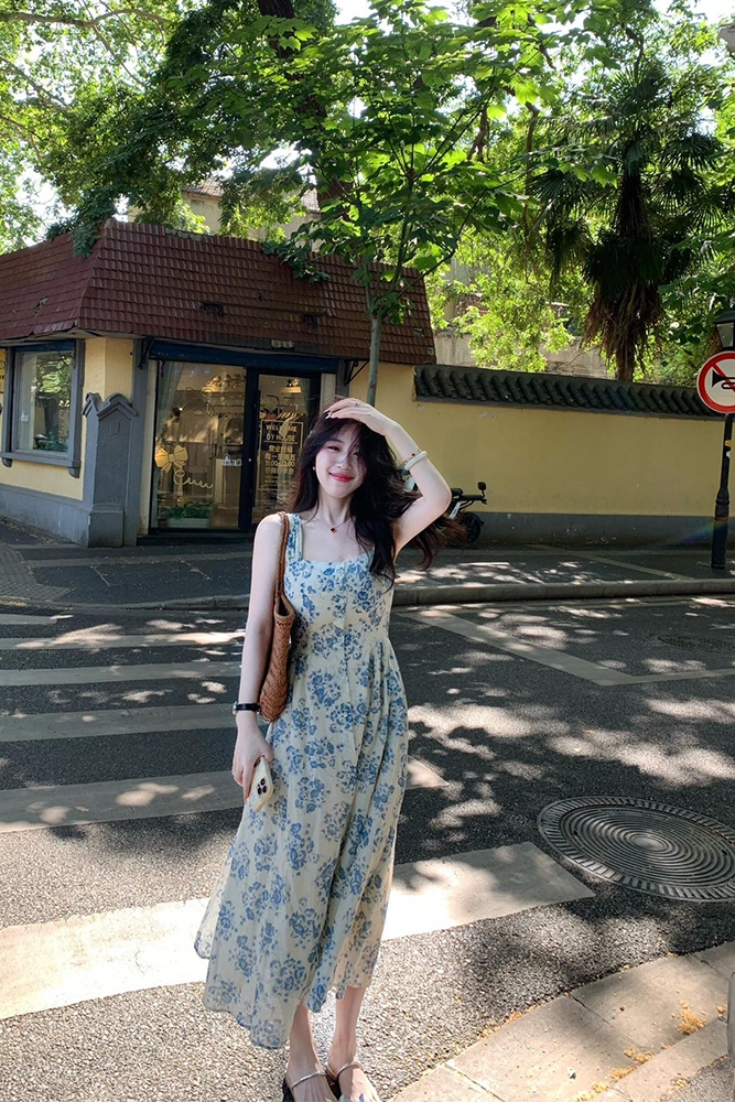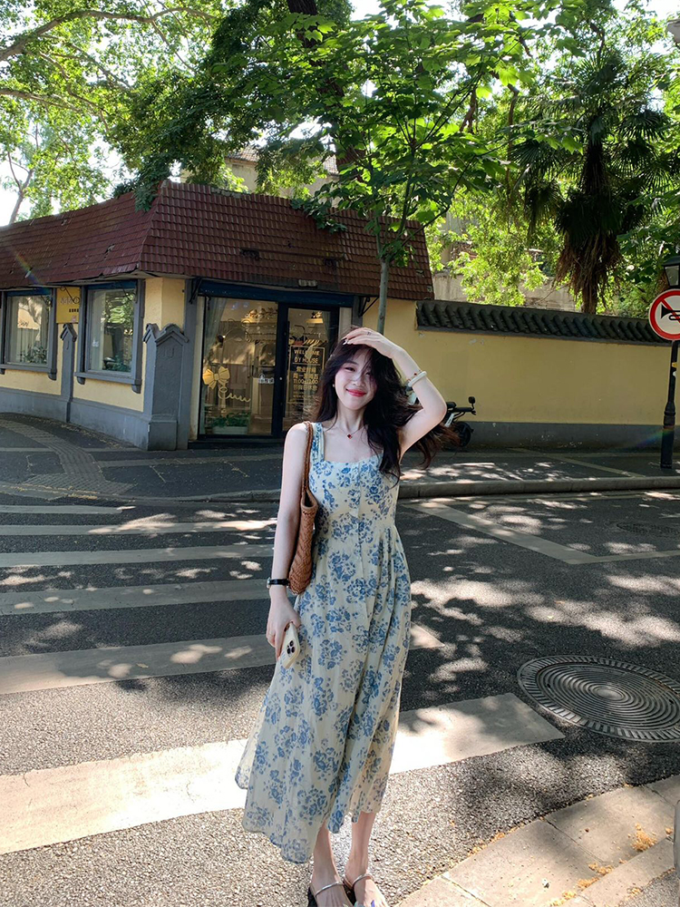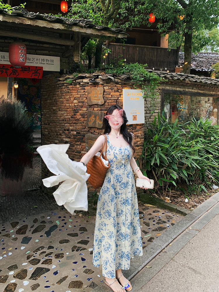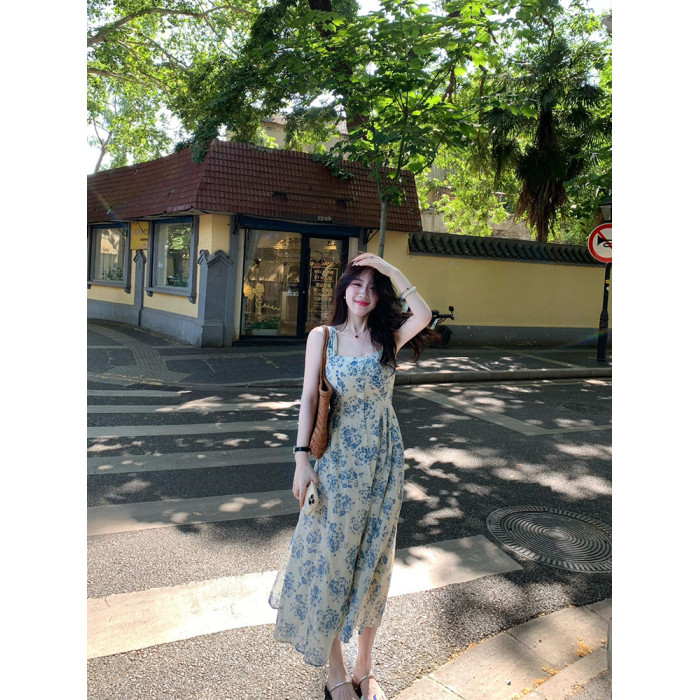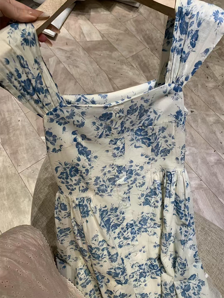 法式田園風藍色碎花方領背心連衣裙女2025新款收腰長裙子