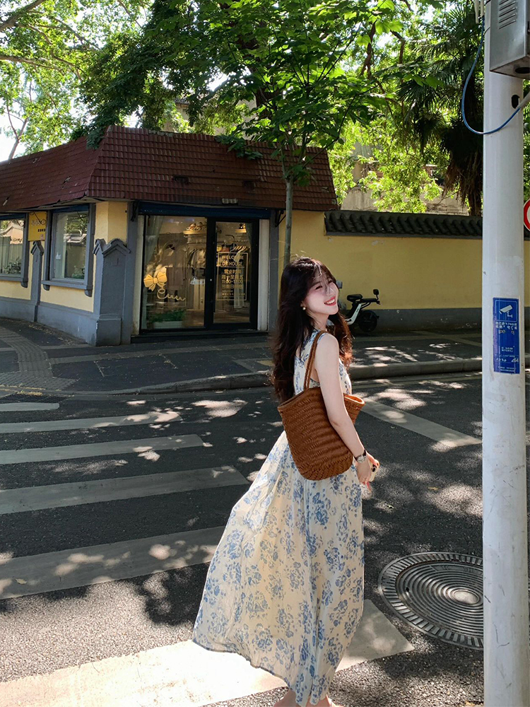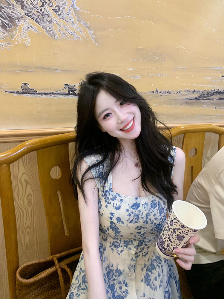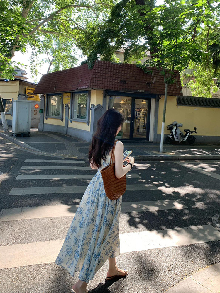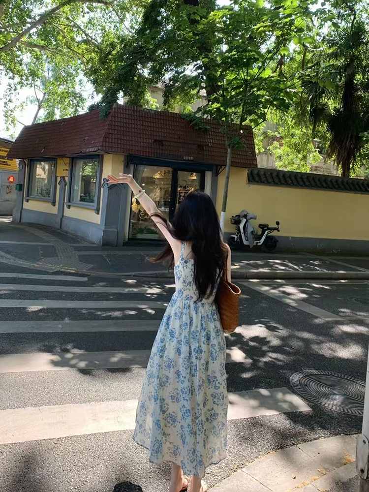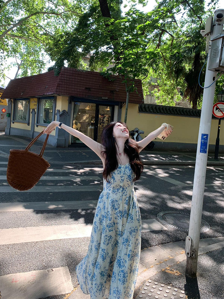 法式田園風藍色碎花方領背心連衣裙女2025新款收腰長裙子