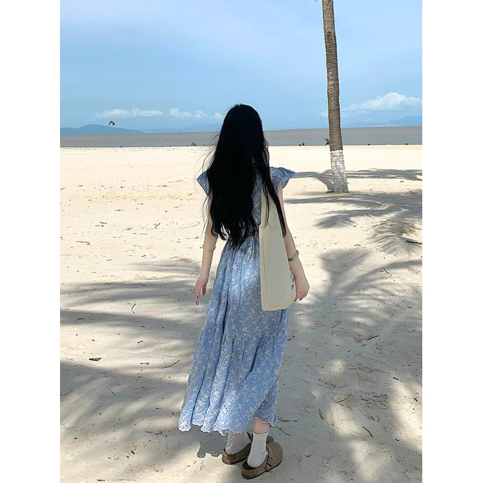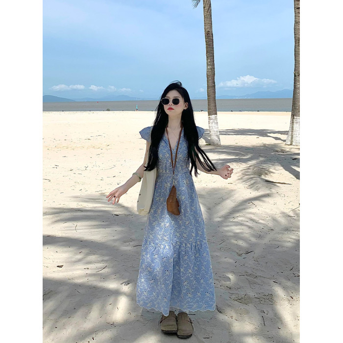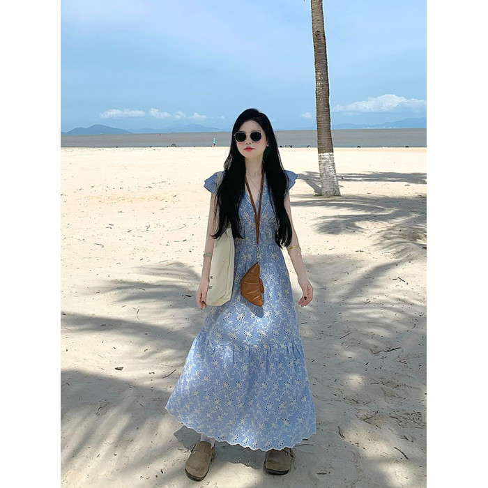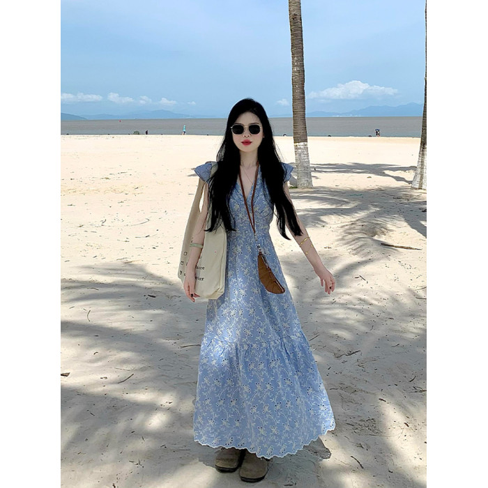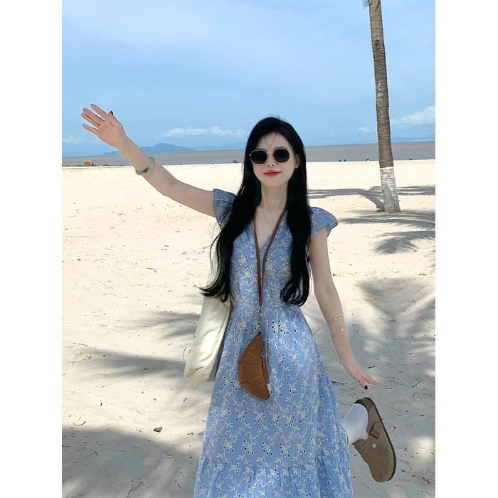 藍色法式碎花連衣裙2025夏季新款小個子今年流行海邊度假風長裙子