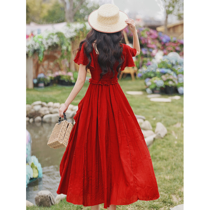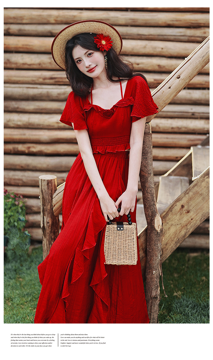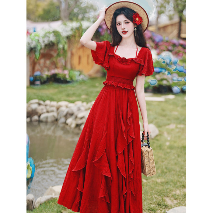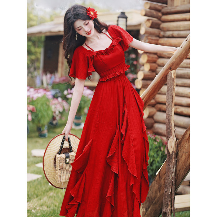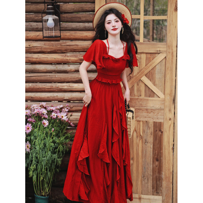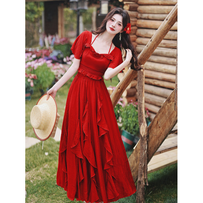 法式復古紅色吊帶連衣裙夏日絕美仙女海邊度假沙灘長裙子新疆沙漠