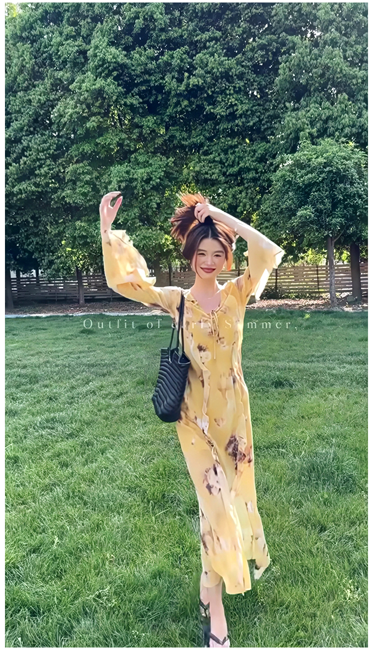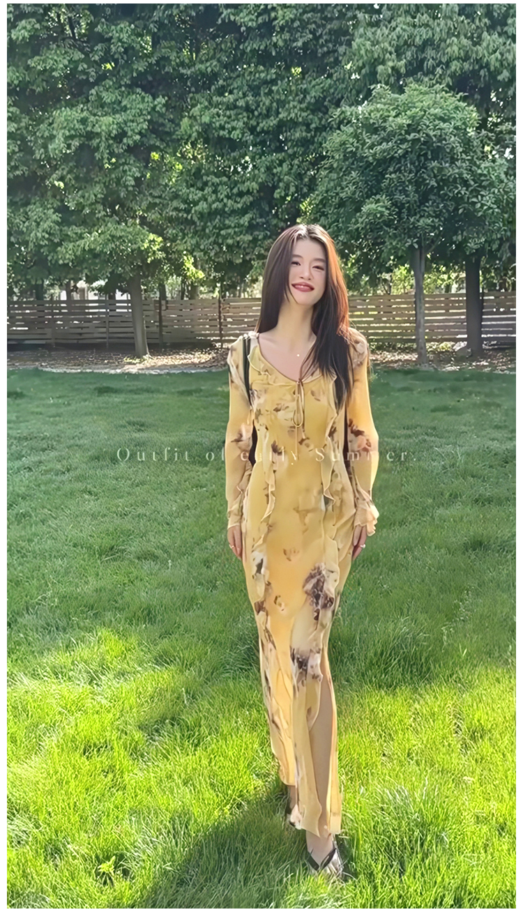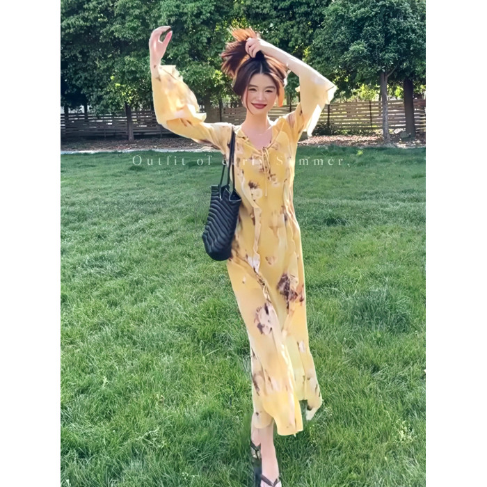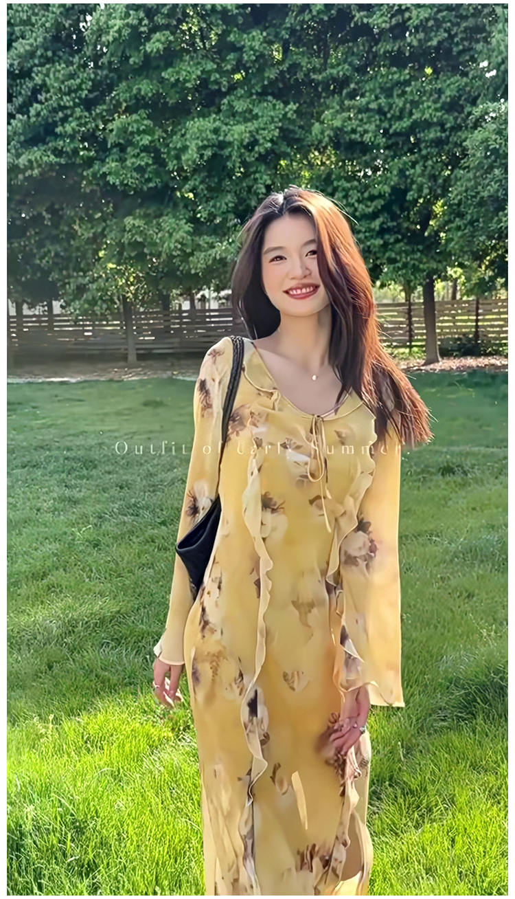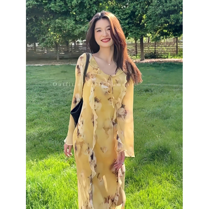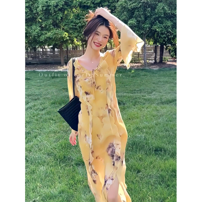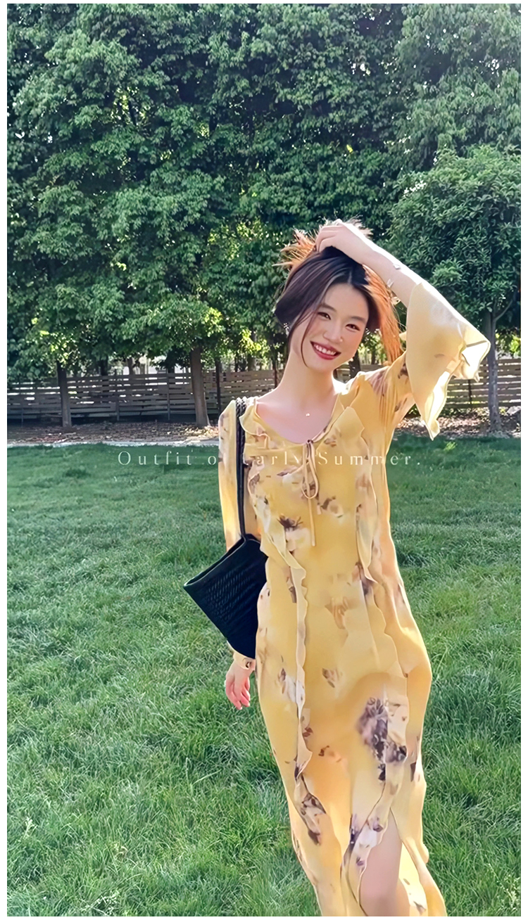 法式復古荷葉邊碎花連衣裙女夏季新款度假風收腰顯瘦絕美開叉長裙