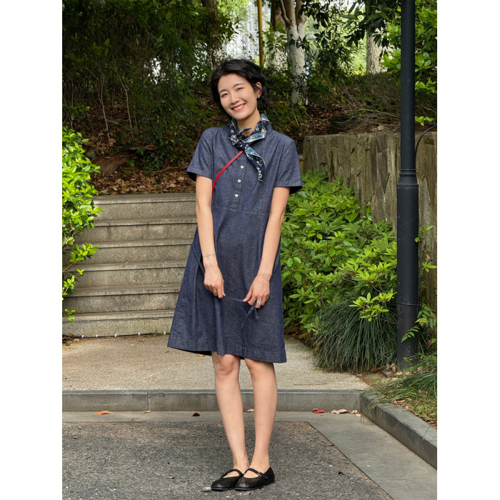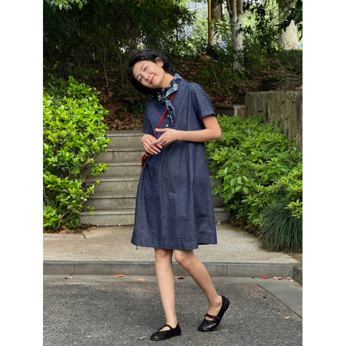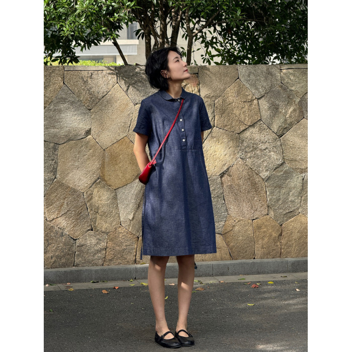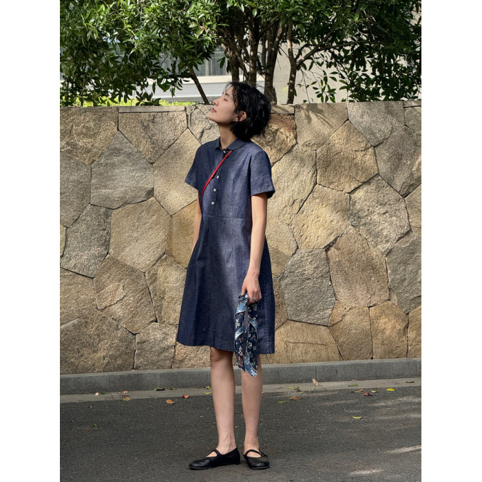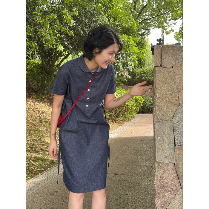 浪清 Polo領襯衫連衣裙夏季新款寬松短袖藍色牛仔裙直筒中長裙子