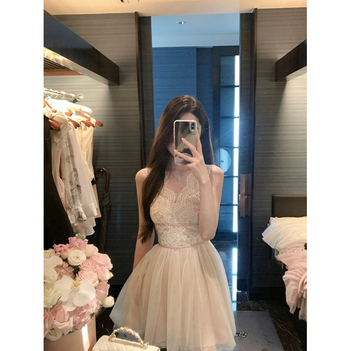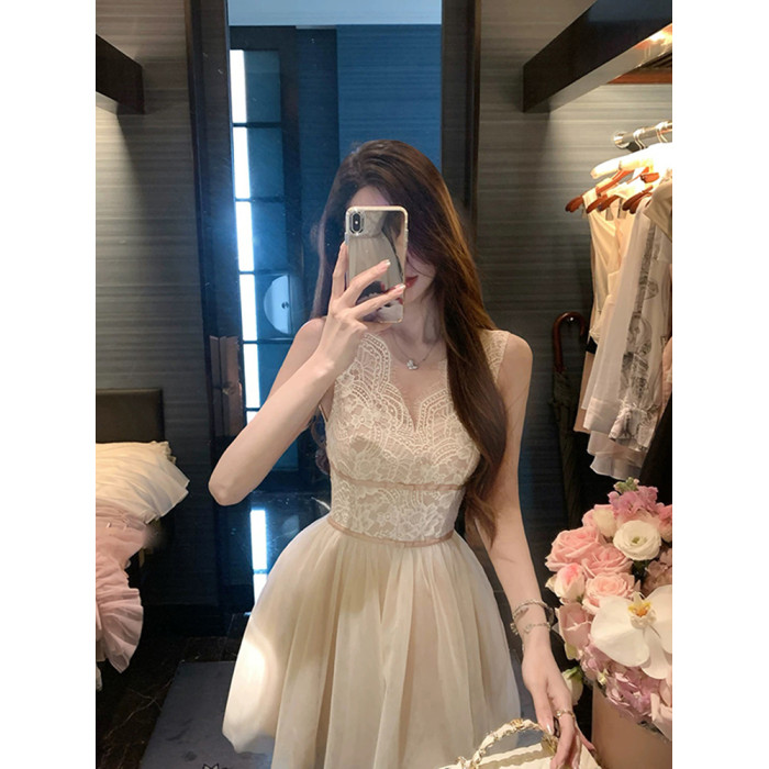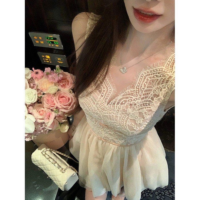 純欲性感蕾絲連衣裙女夏裝高級感氣質收腰溫柔風杏色無袖短裙