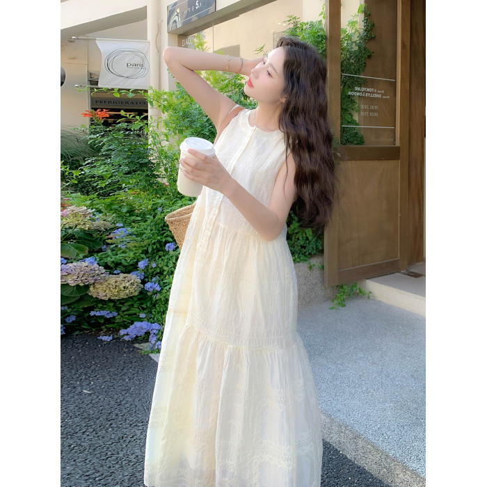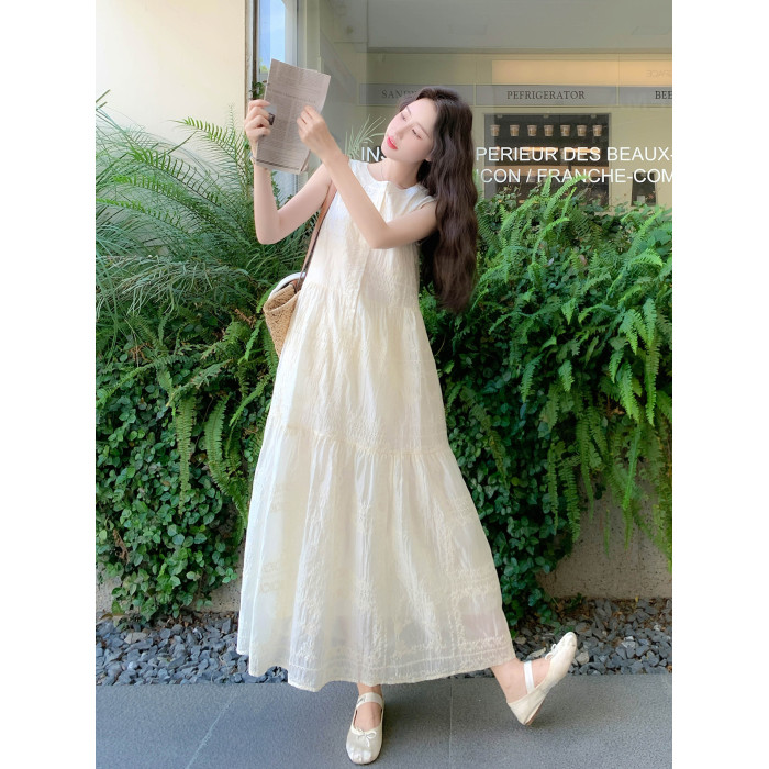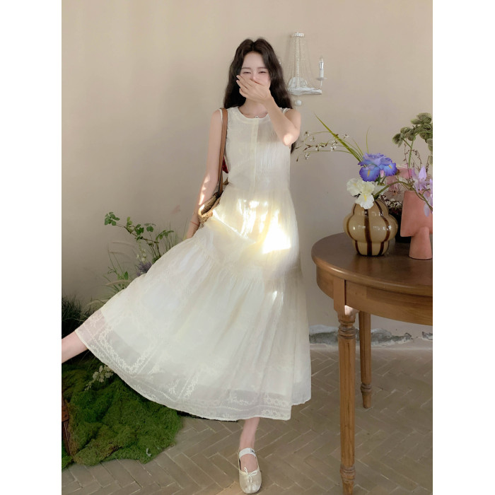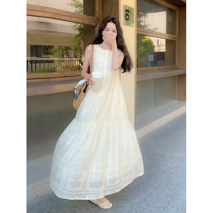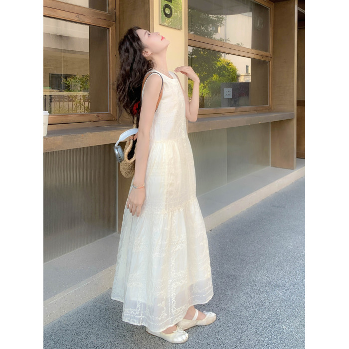 米白色刺綉無袖連衣裙女2025夏季新款法式溫柔風甜美減齡背心長裙