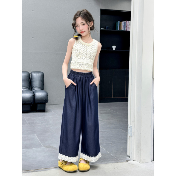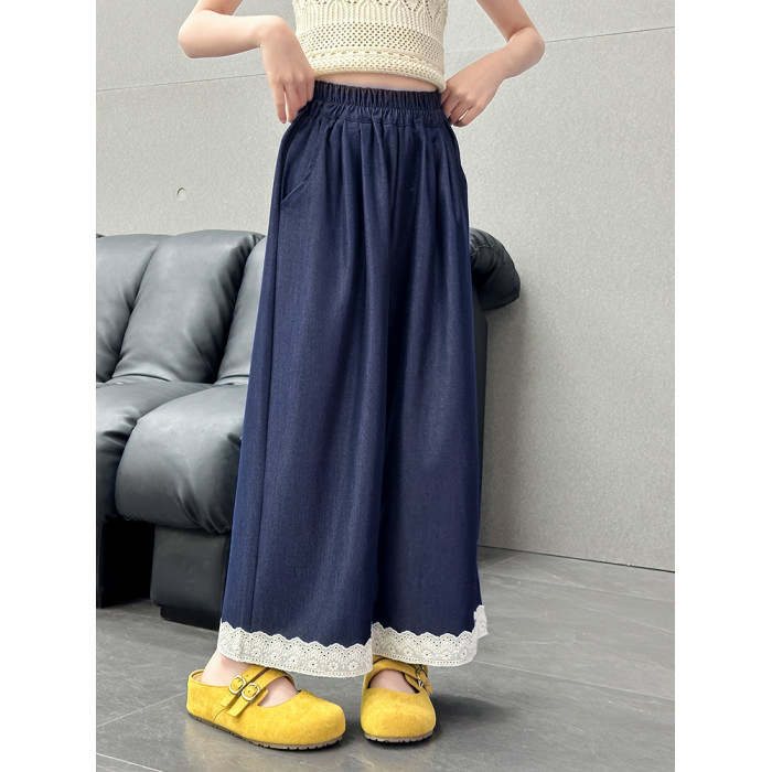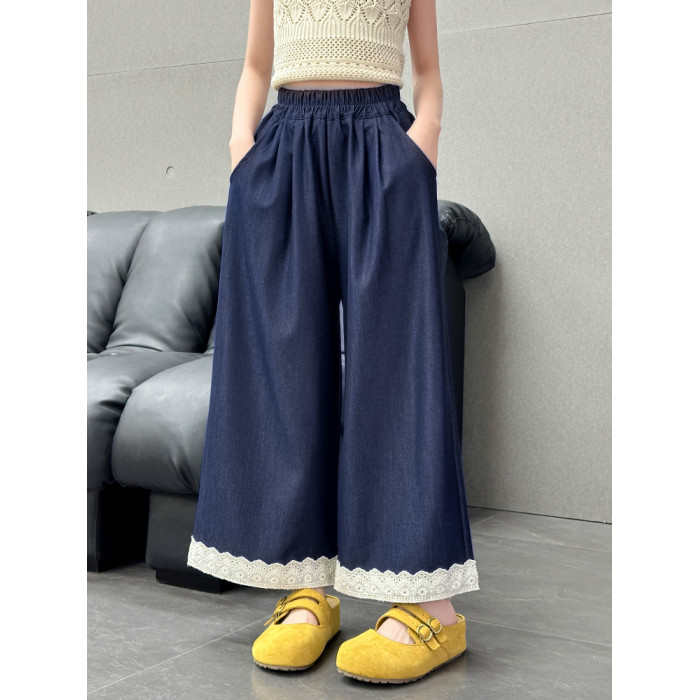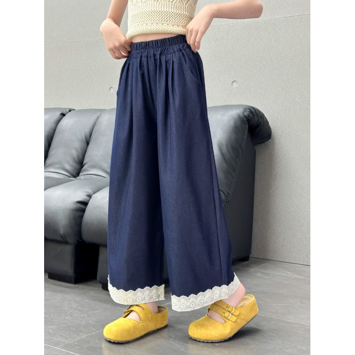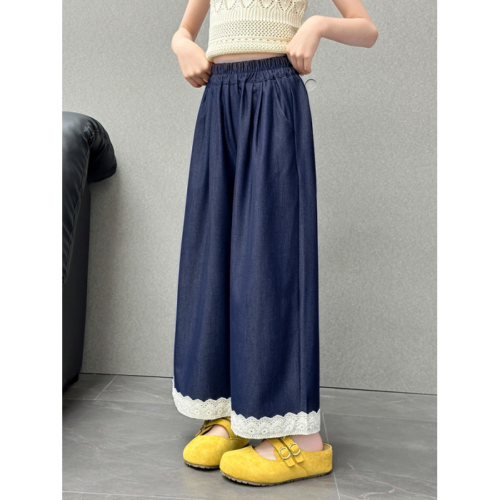 女童天絲牛仔褲薄款2025夏季新款大童蕾絲拼接九分褲子兒童濶腿褲