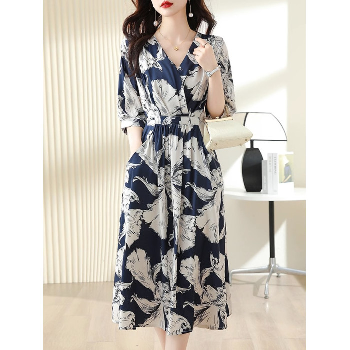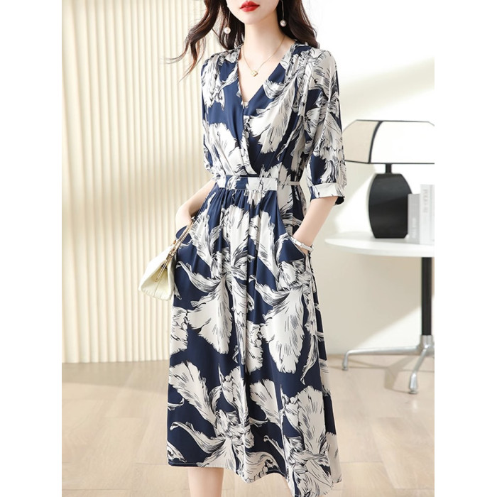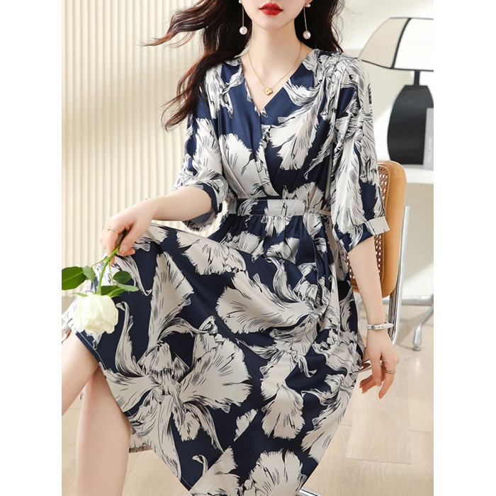 歐洲站真絲連衣裙女桑蠶絲中長款過膝大碼夏新款氣質輕奢法式夏裝