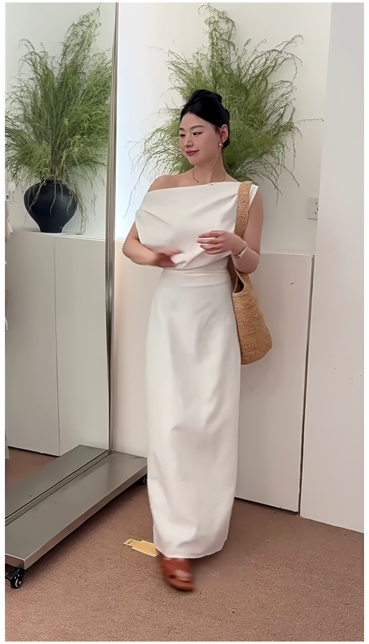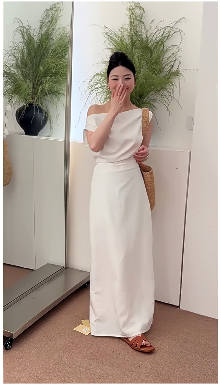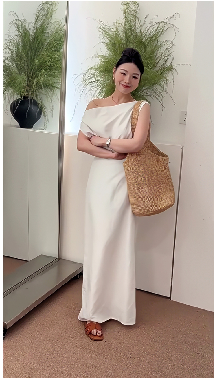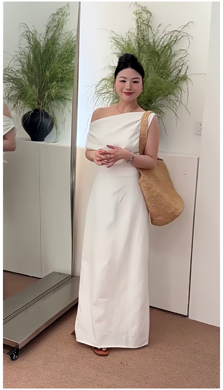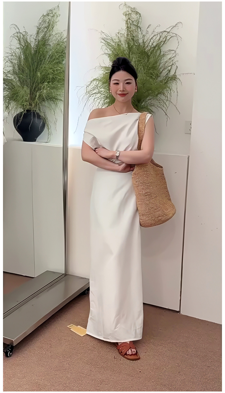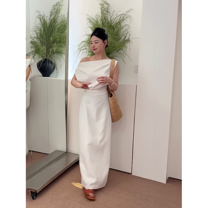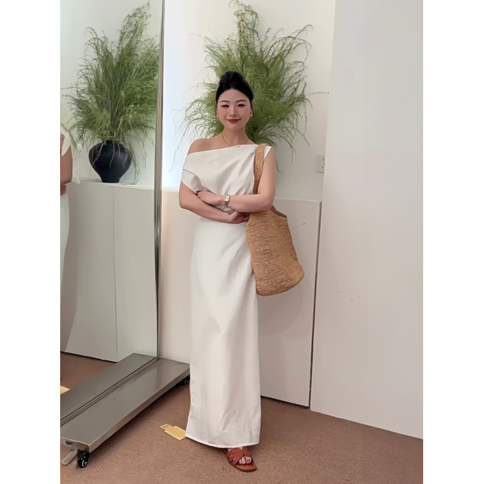 法式高級感氣質亞麻斜肩連衣裙女夏季極簡風設計感度假露肩長裙子