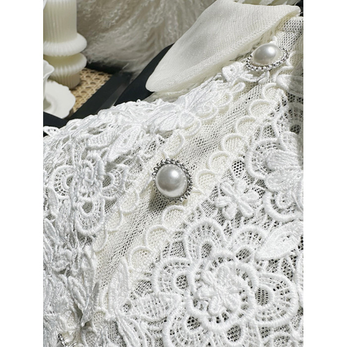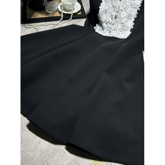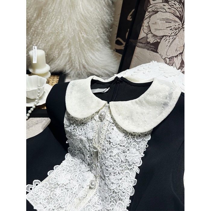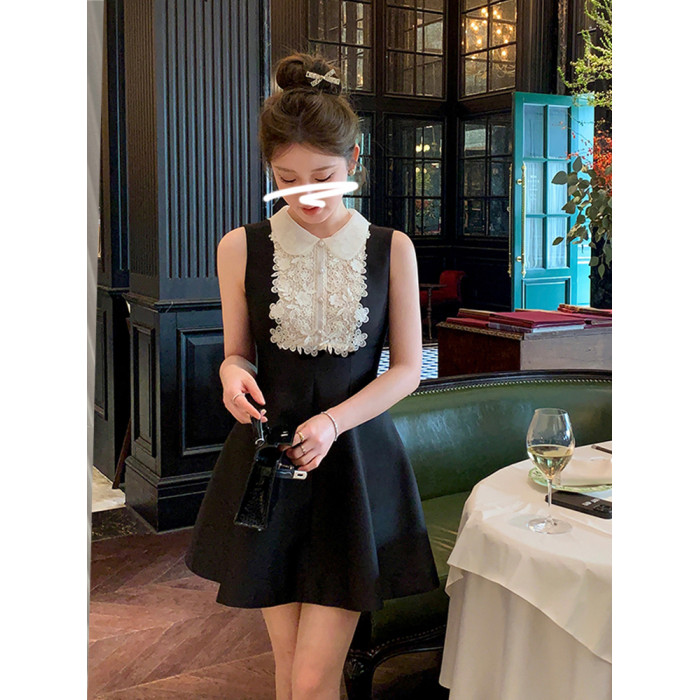 FFmiss◆法式娃娃領撞色蕾絲收腰連衣裙女重工釘珠無袖聚會小黑裙