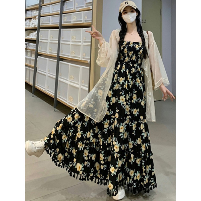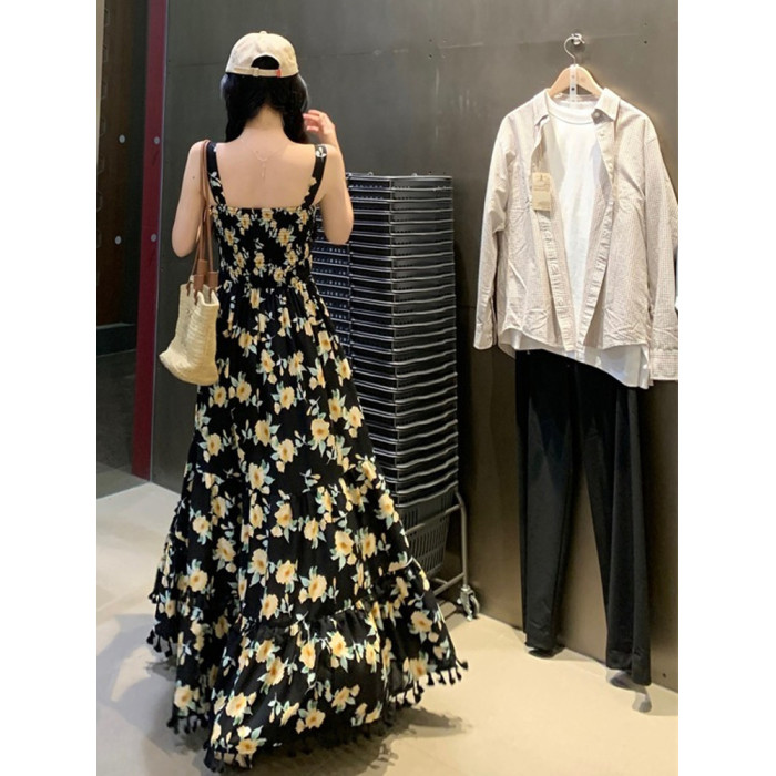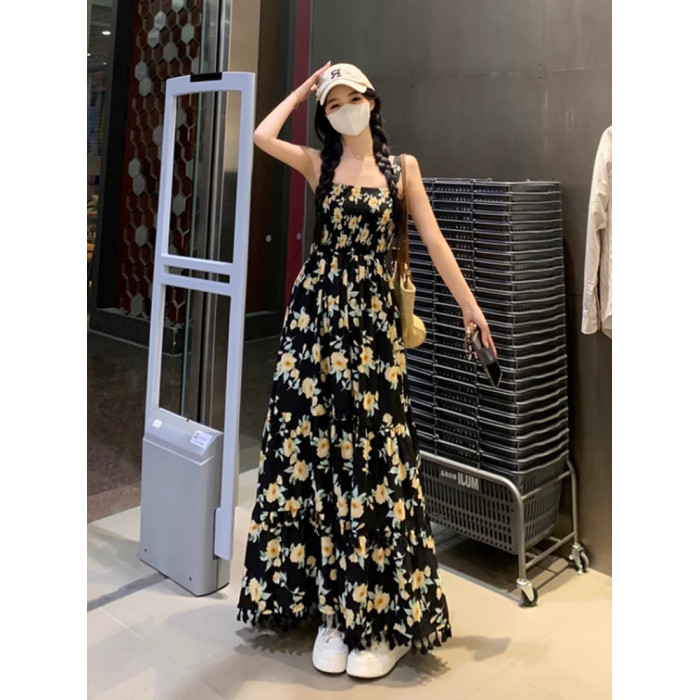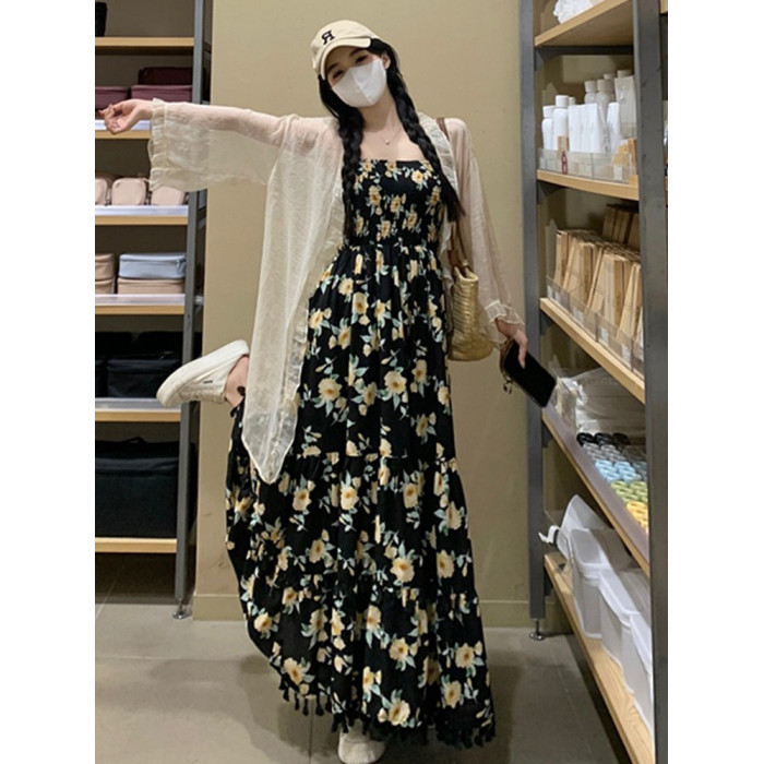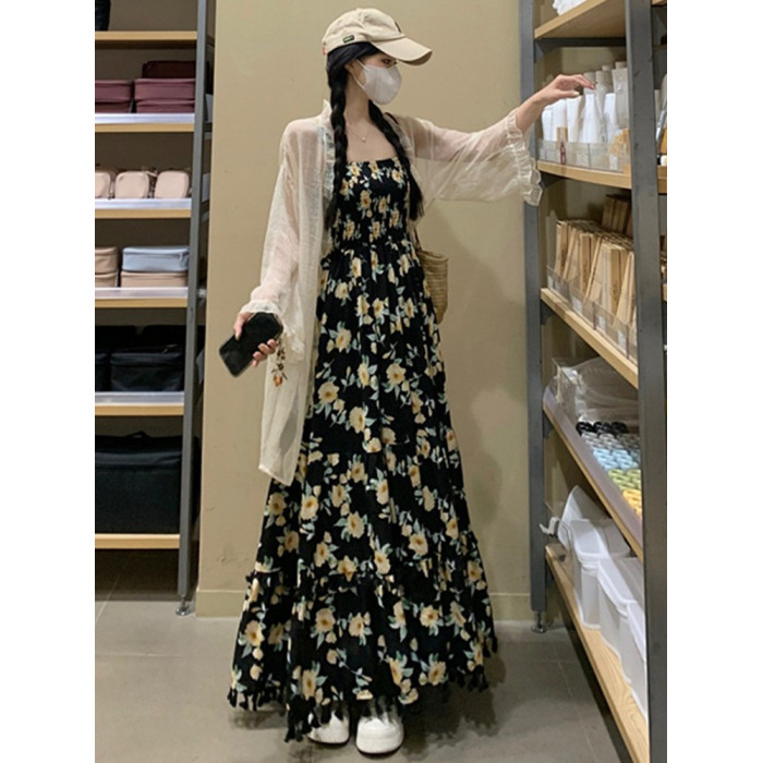 170高個子絕美吊帶連衣裙加長版到腳踝超長2025氣質碎花裙子套裝