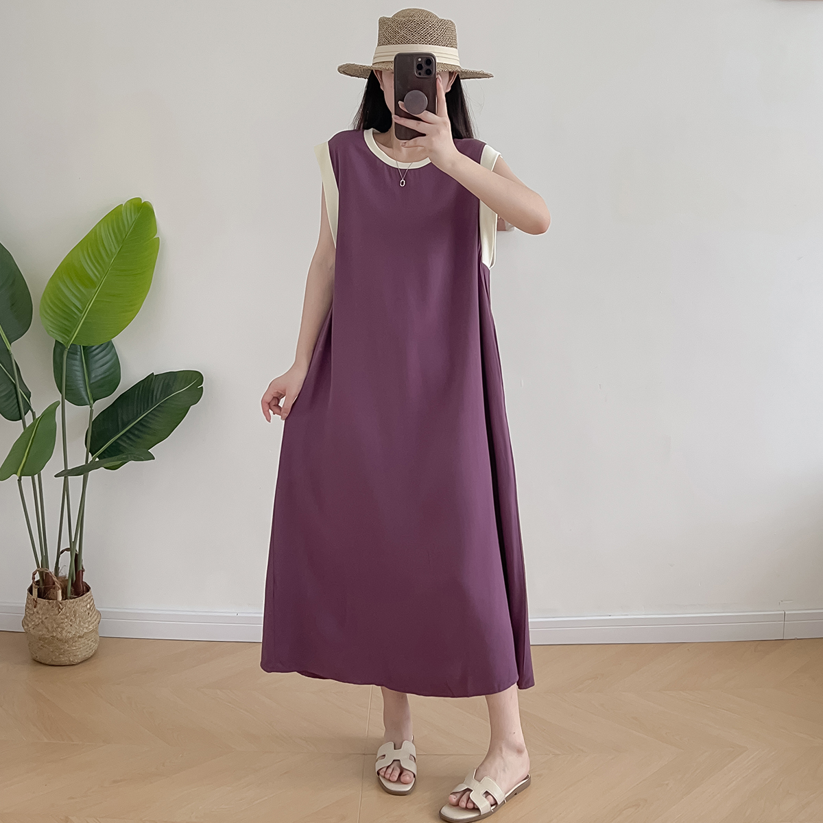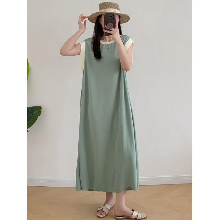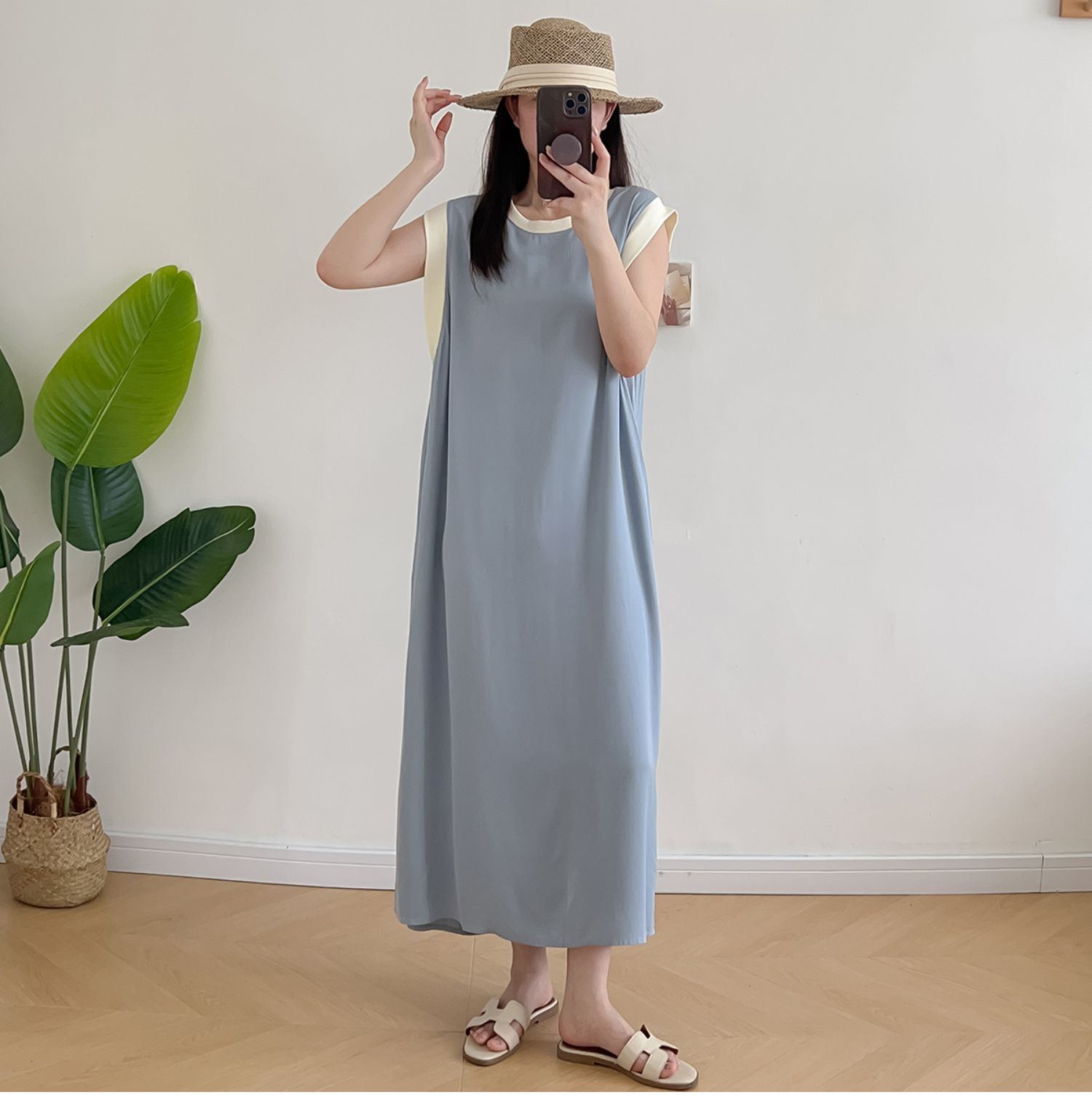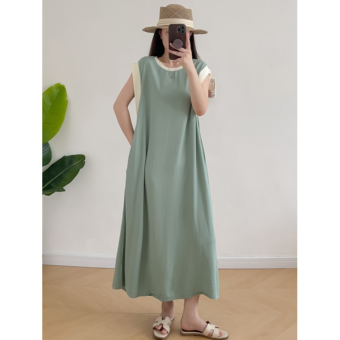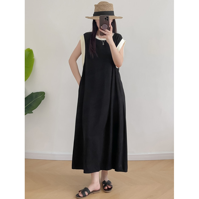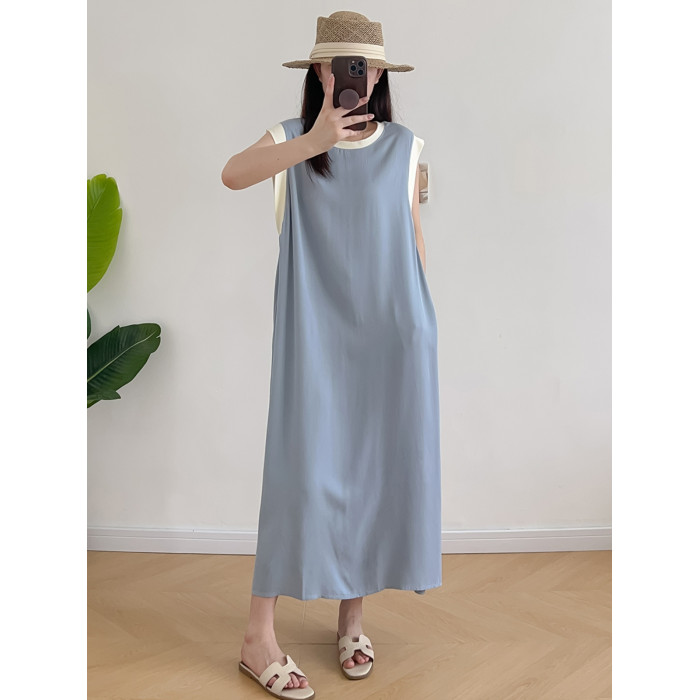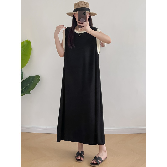 棉綢無袖連衣裙女2024年夏季寬松大碼顯瘦背心裙純色人造棉大擺裙