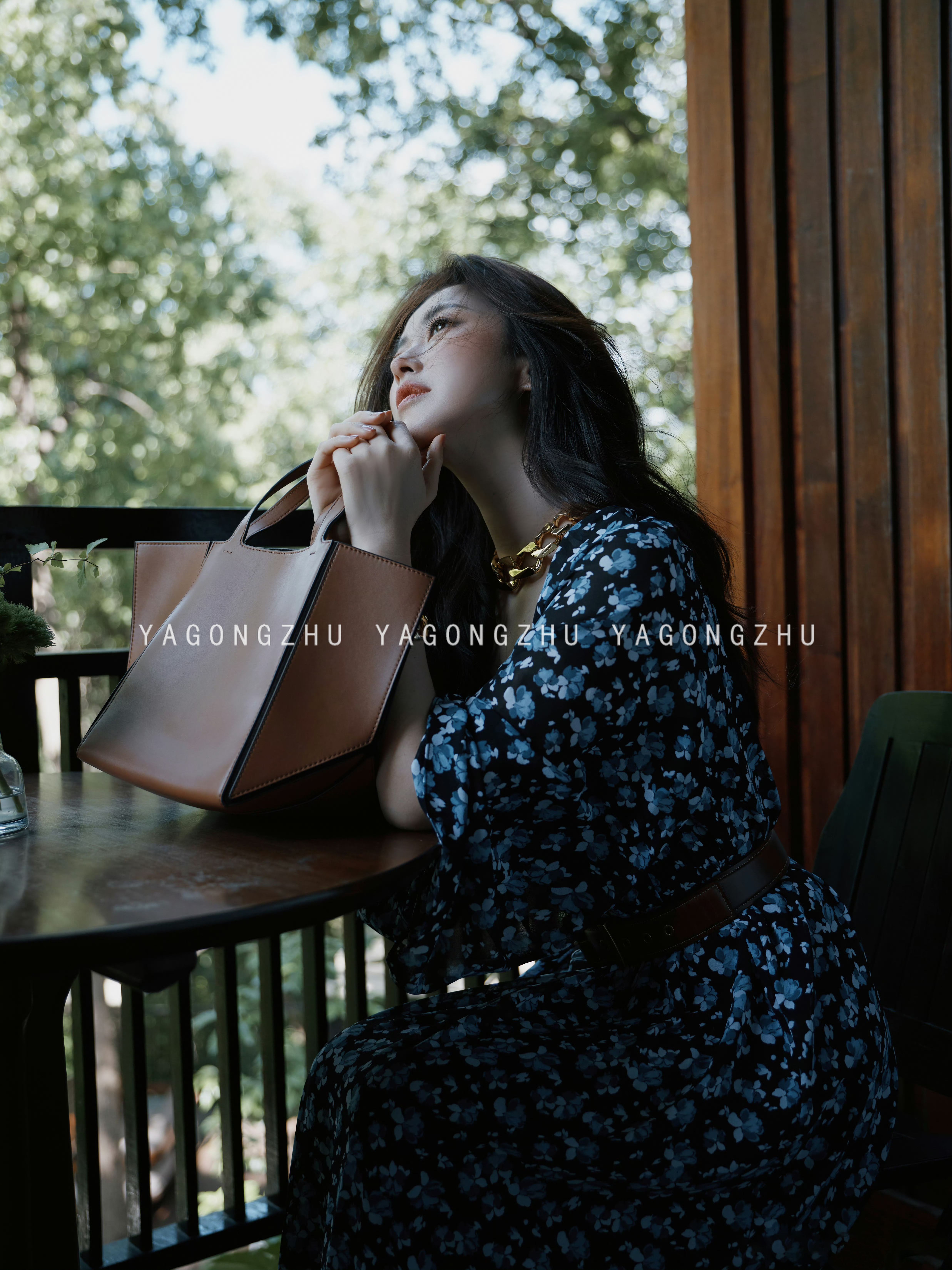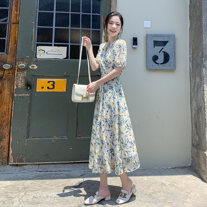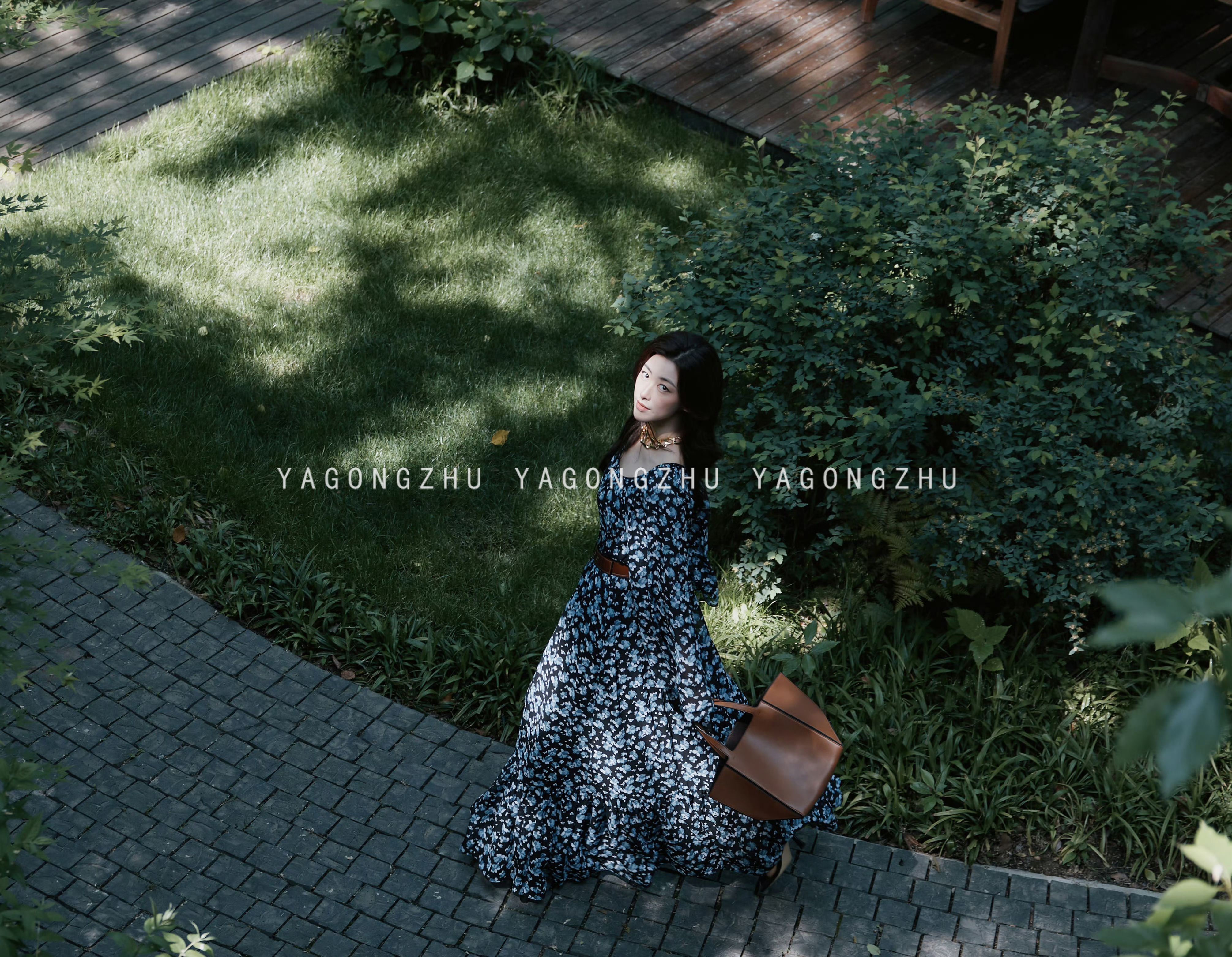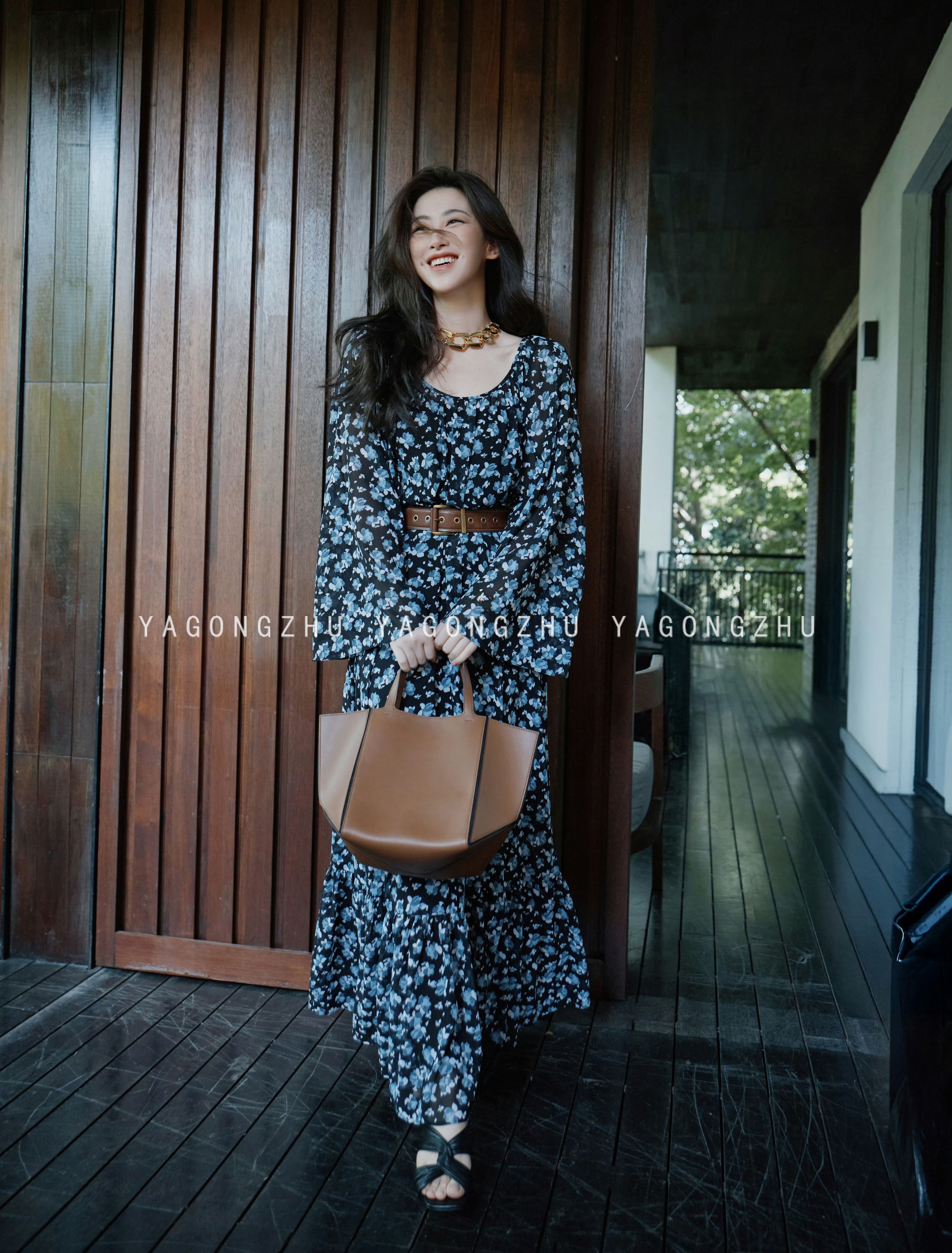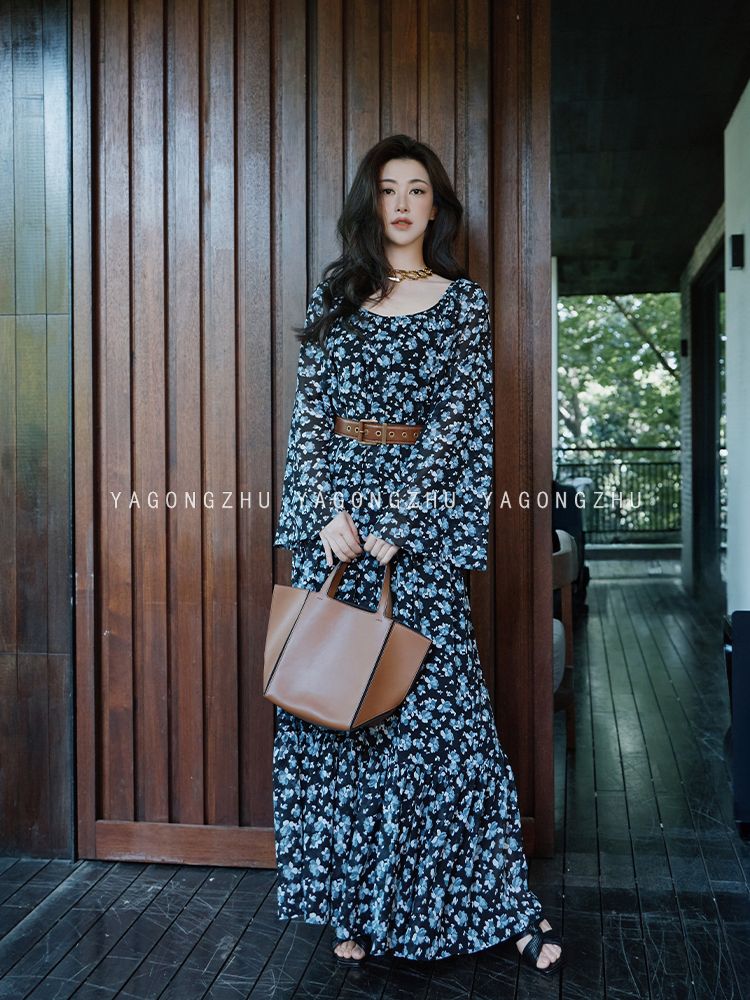 【硃珠同款】YAGONGZHU 藍色碎花連衣裙喇叭袖氣質裙子到腳踝長裙