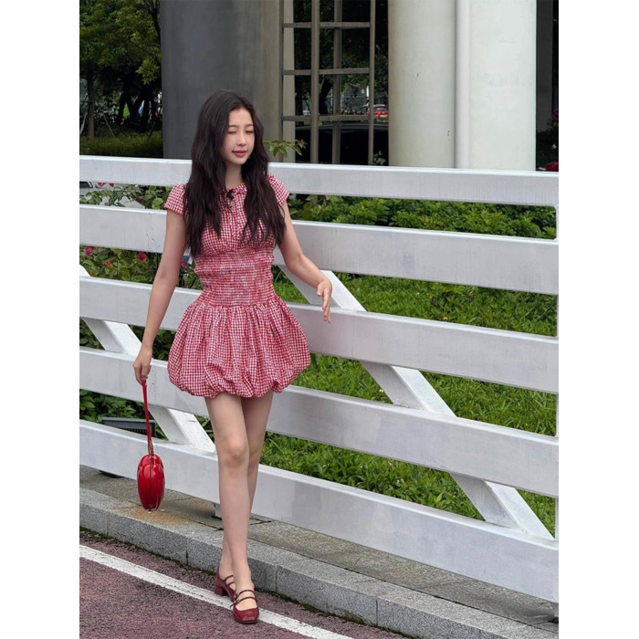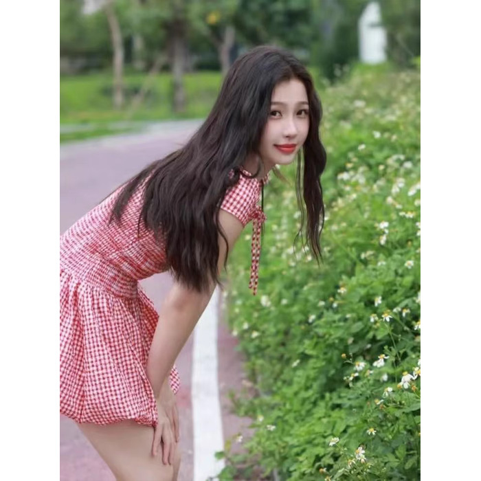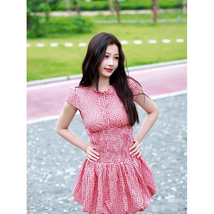 虞書訢同款2025新款紅色格子松緊收腰花苞小個子連衣裙女夏季短裙