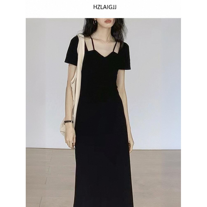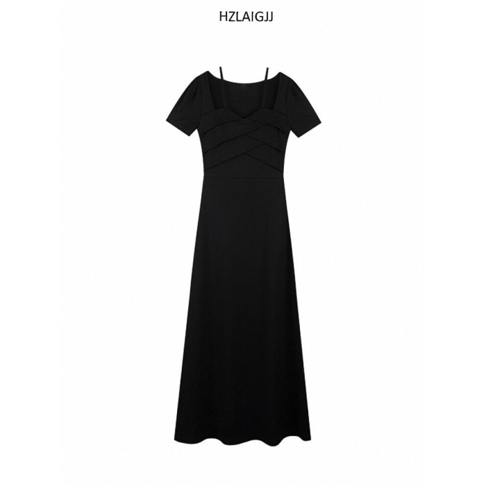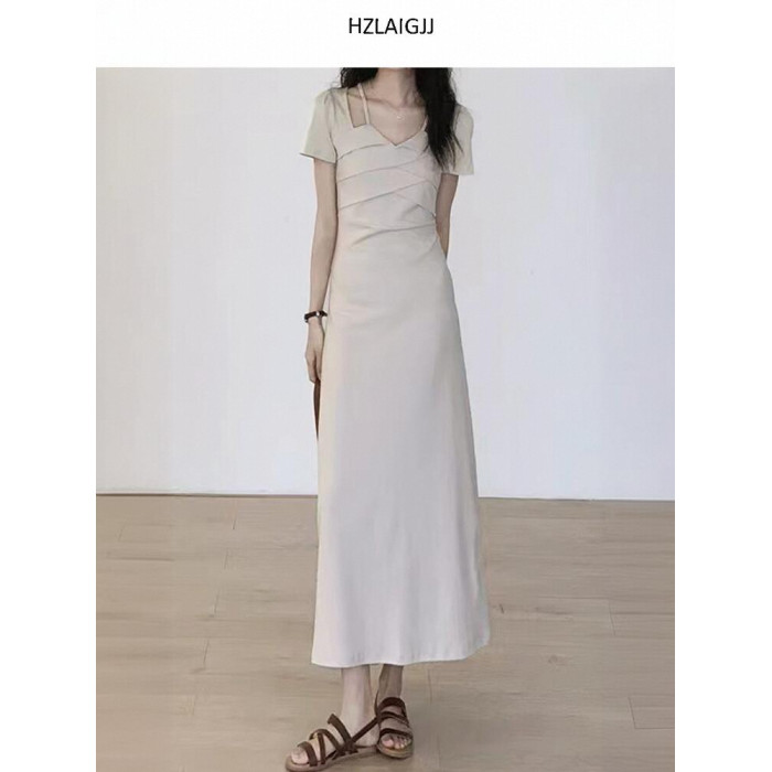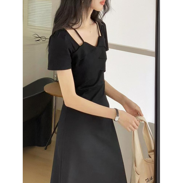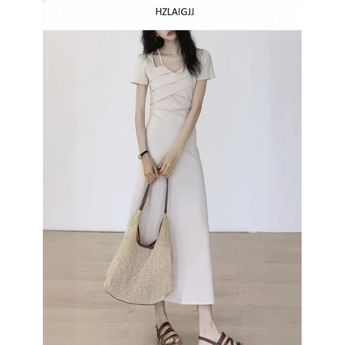 2025夏季新款法式赫本風收腰小衆別致連衣裙掛脖氣質通勤a字裙子