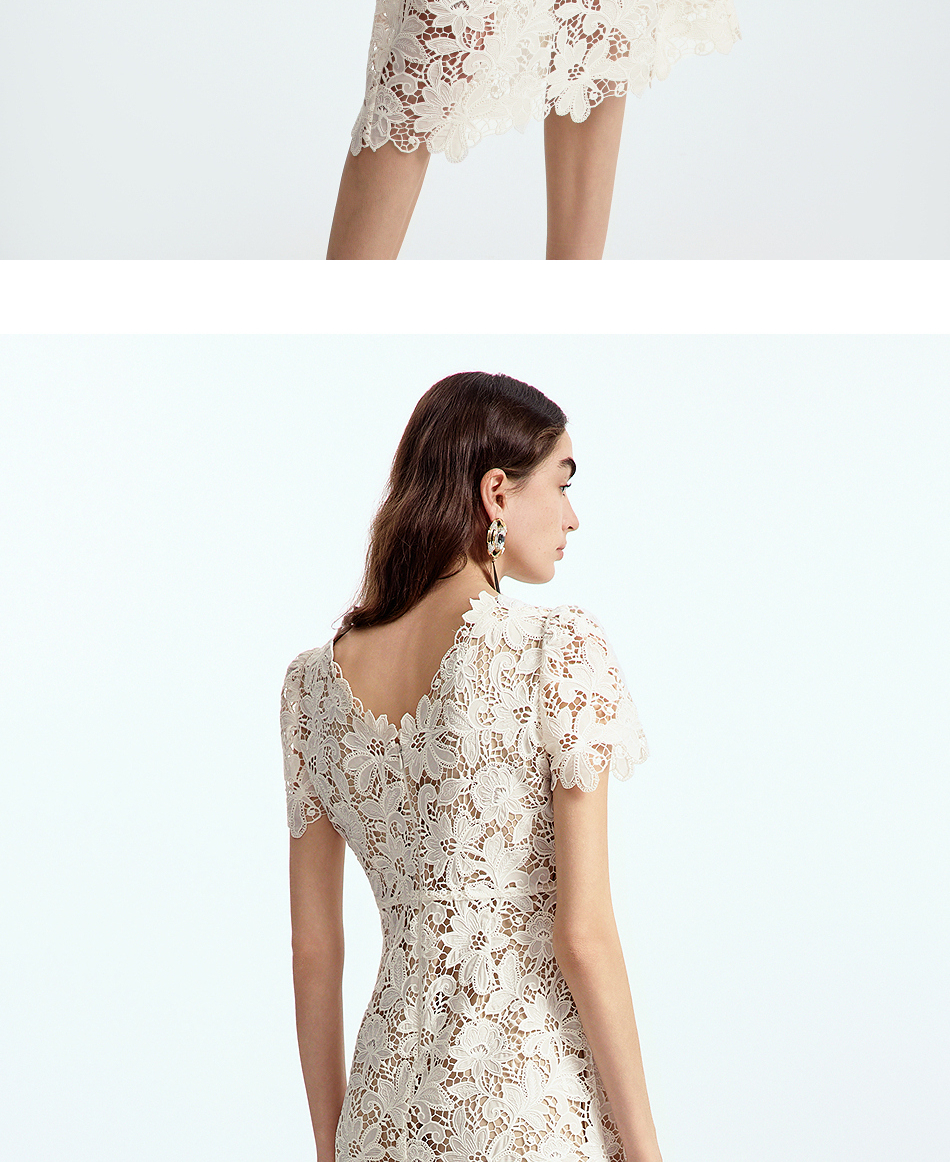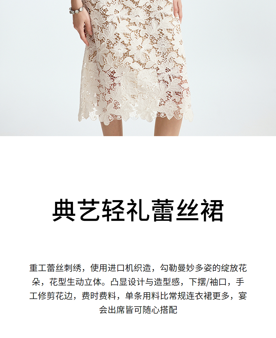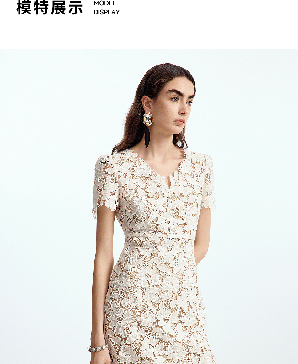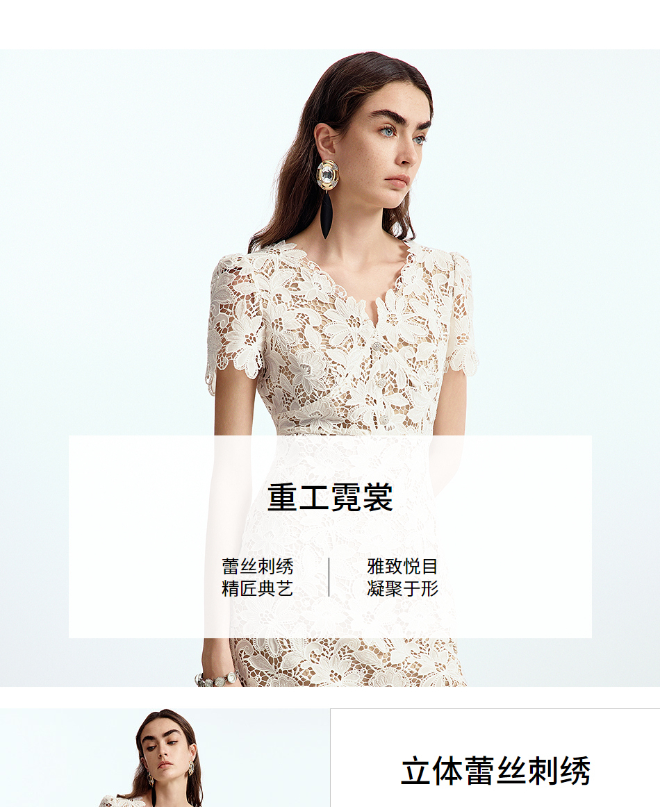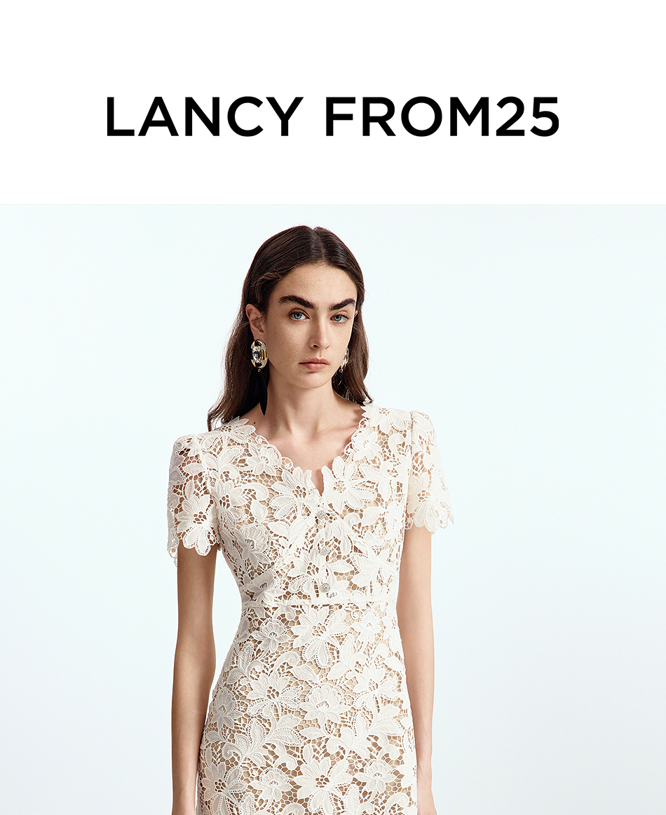 朗姿V領氣質修身蕾絲收腰鏤空高級感輕禮服2025年秋季新款連衣裙