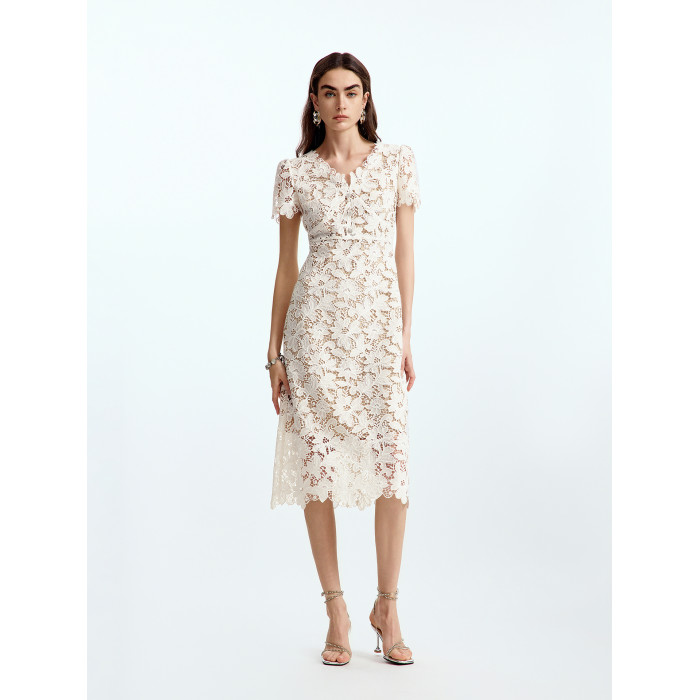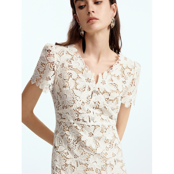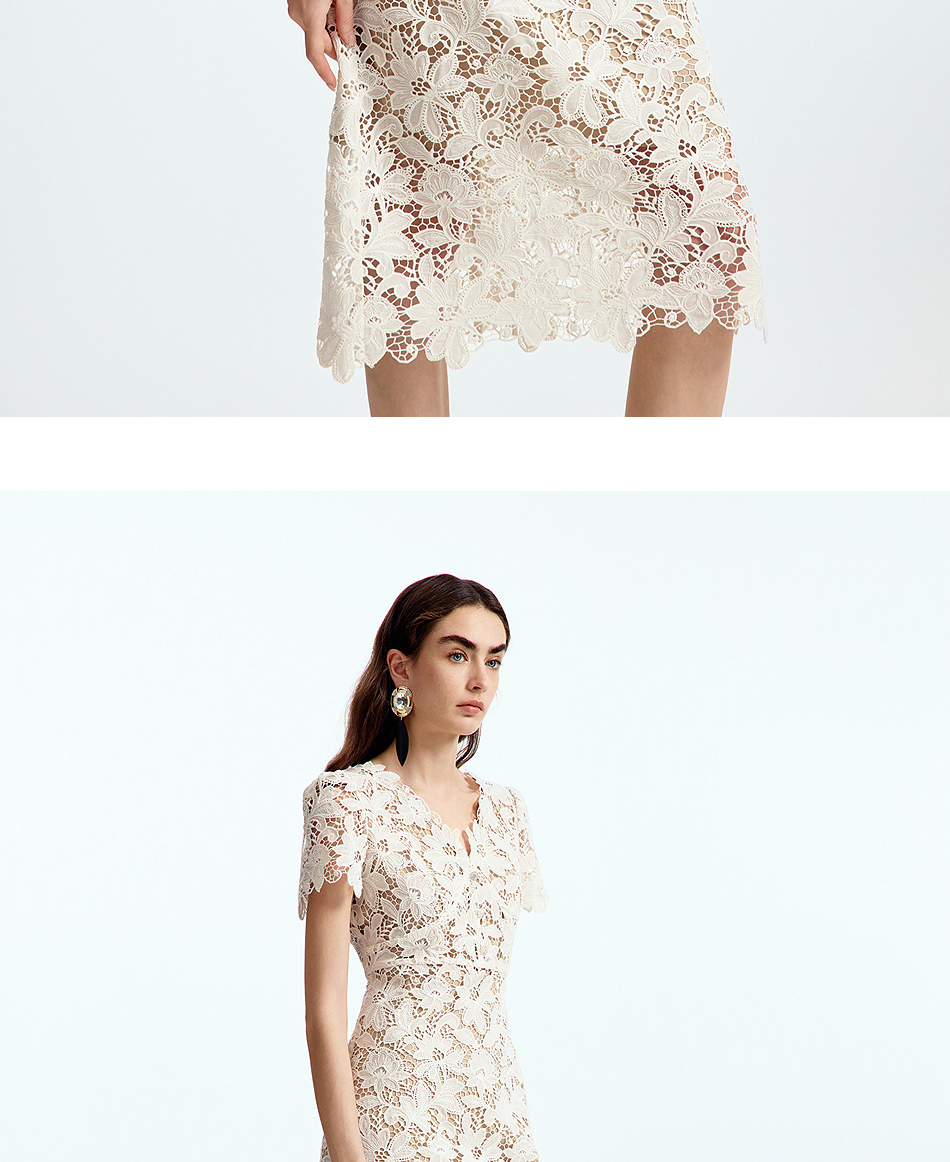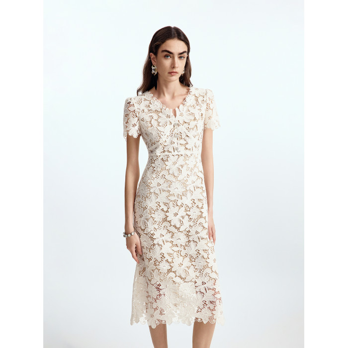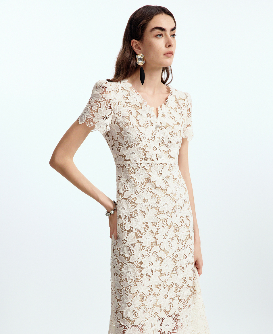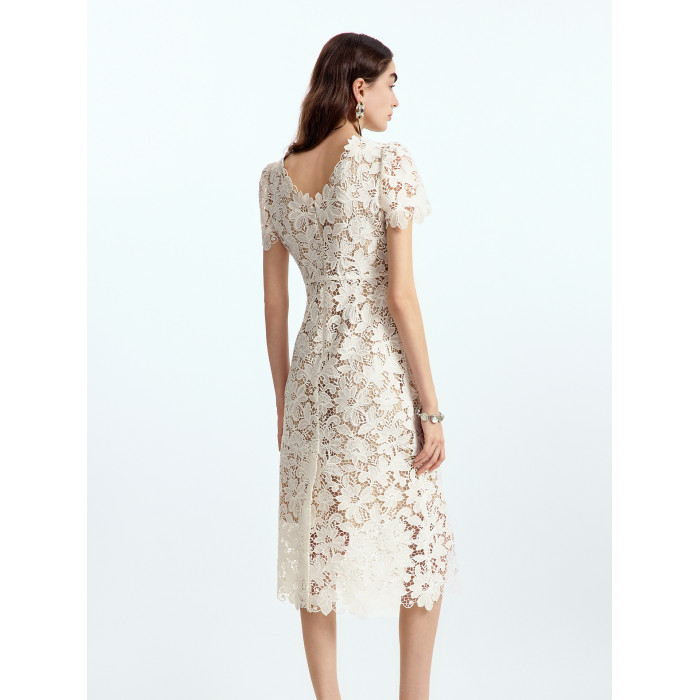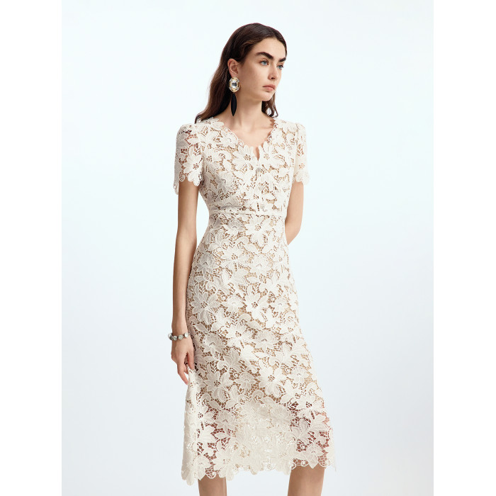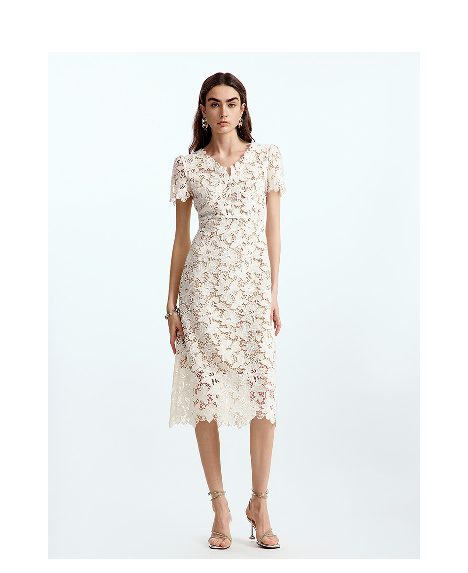 朗姿V領氣質修身蕾絲收腰鏤空高級感輕禮服2025年秋季新款連衣裙