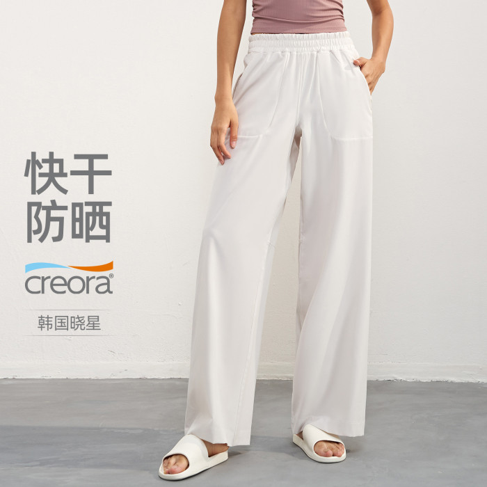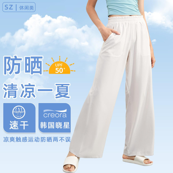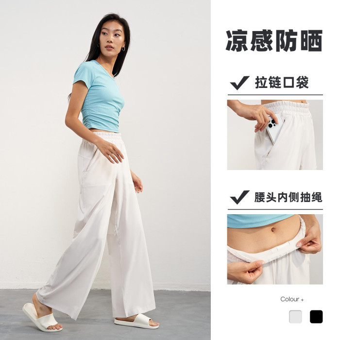 SZ春夏新款防曬寬松長褲女口袋拉鍊收腰直筒濶腿褲涼感速乾運動褲