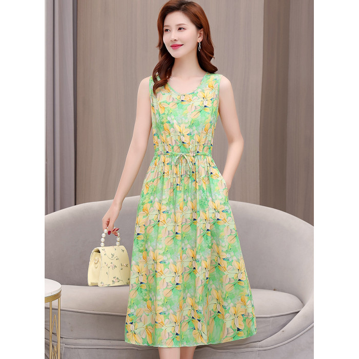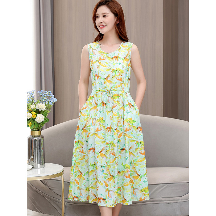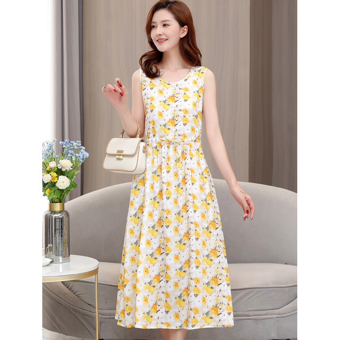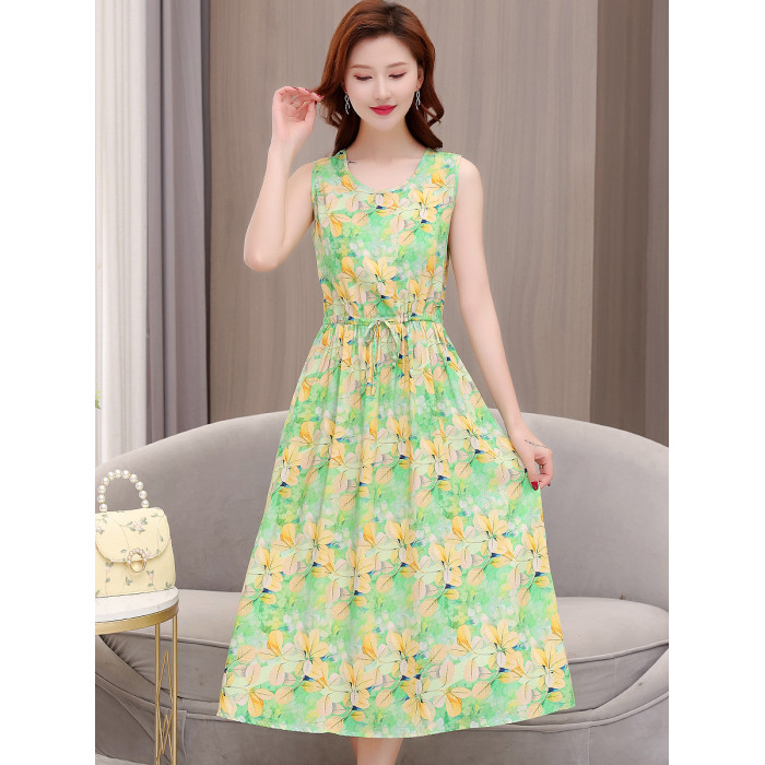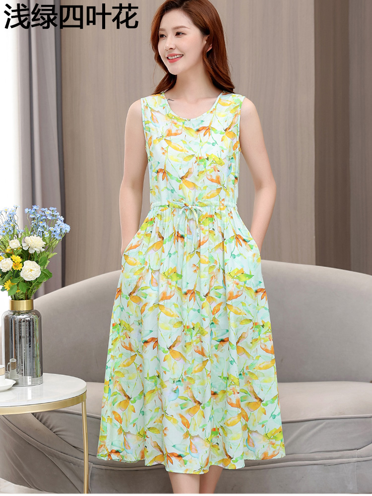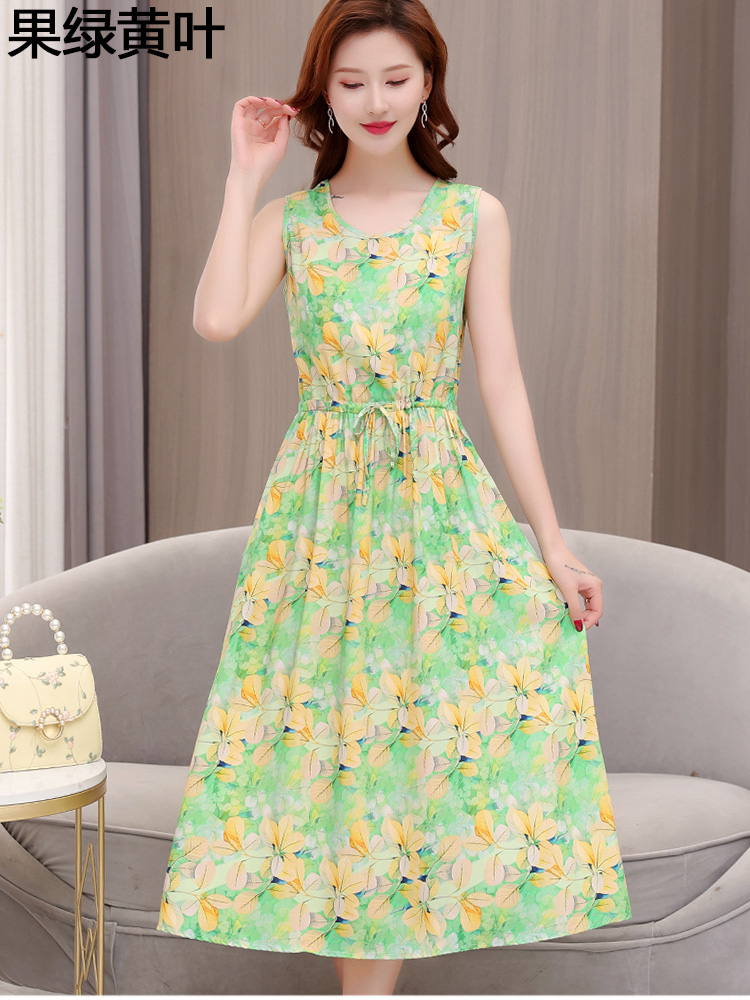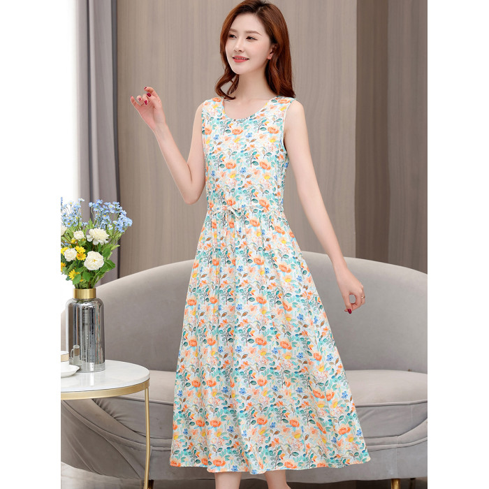 新款高級夏季棉綢連衣裙女無袖碎花吊帶背心長裙外穿綿綢大擺裙子
