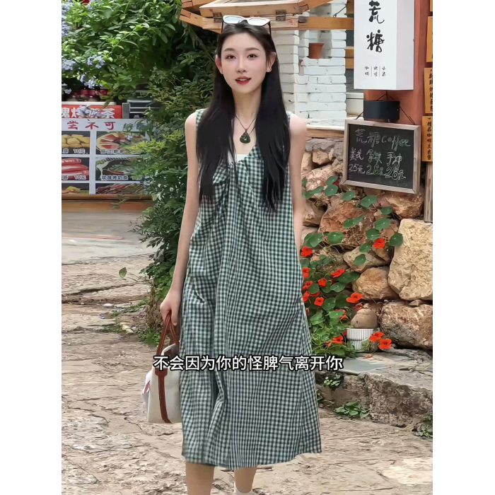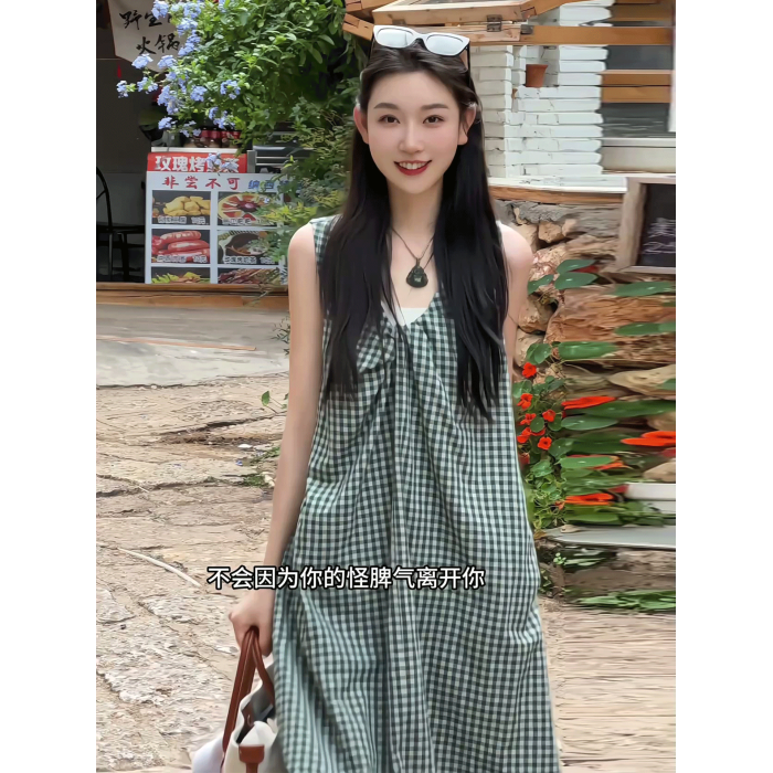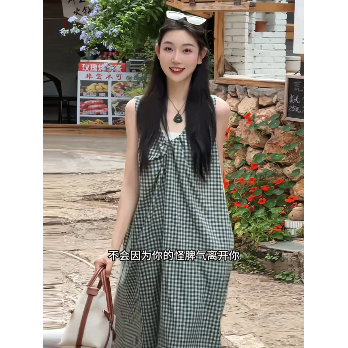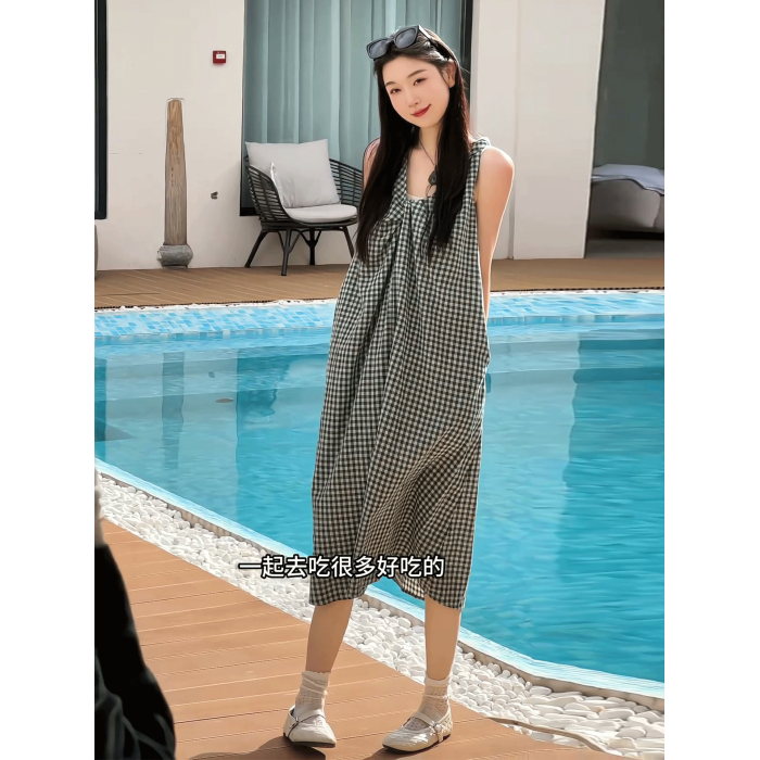 韓系慵懶風格子無袖背心連衣裙女2025年夏季新款氣質寬松顯瘦長裙
