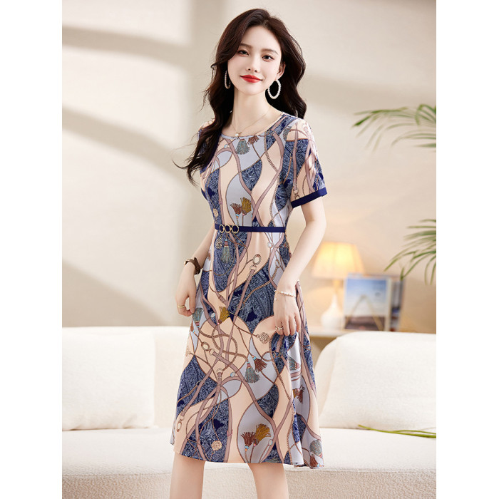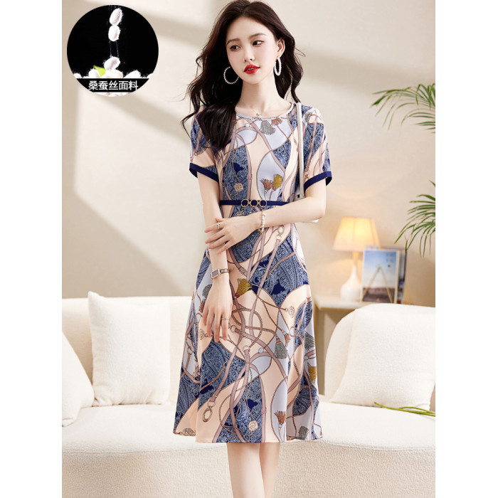 高檔時尚桑蠶絲套頭圓領連衣裙今年新款中長款奢華氣質真絲裙子夏
