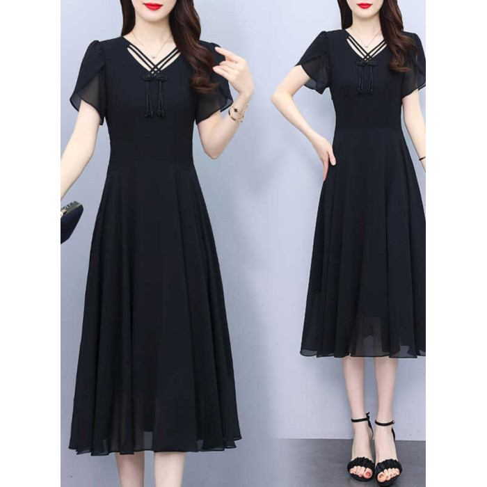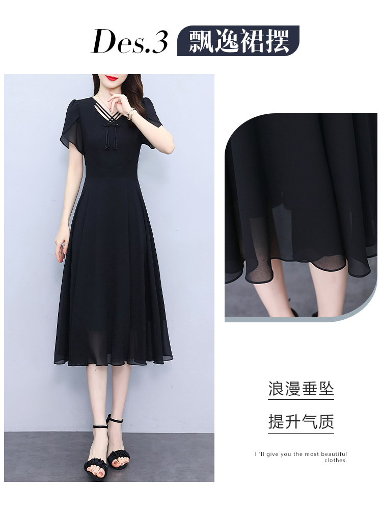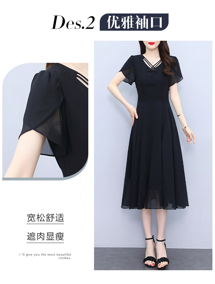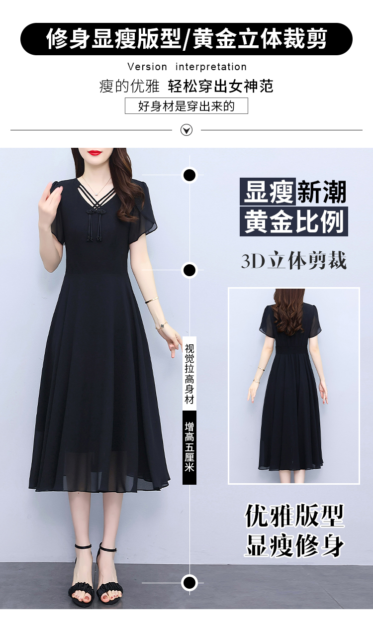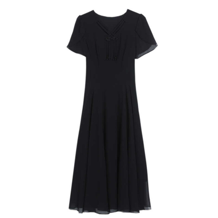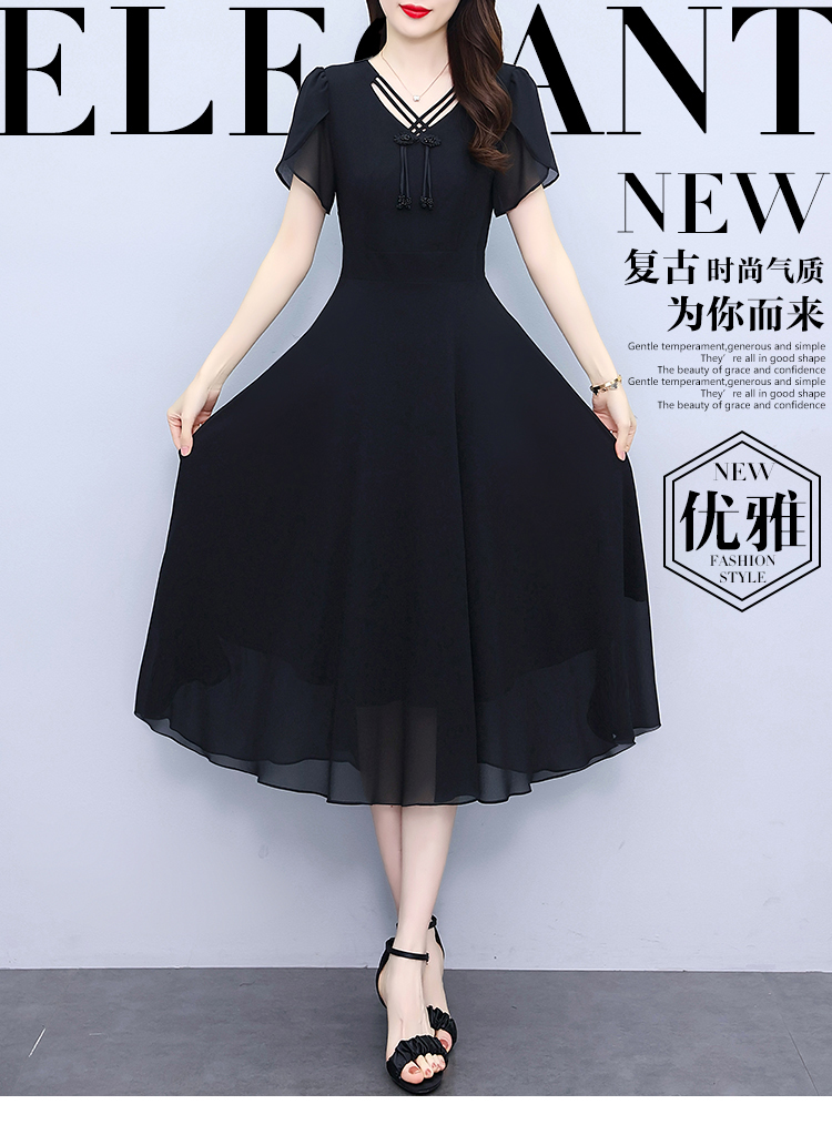 氣質雪紡黑色短袖連衣裙女2025年夏季新款媽媽顯瘦中長款優雅裙子