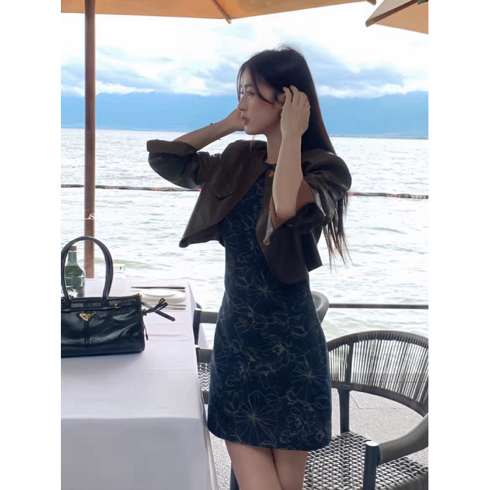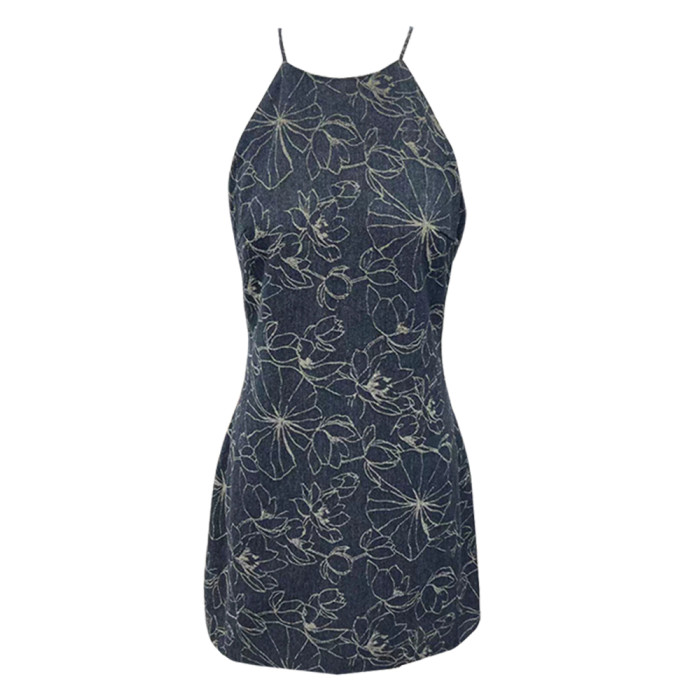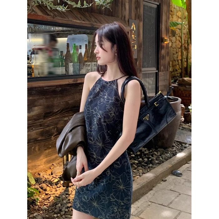 無袖掛脖吊帶連衣裙女早春小個子碎花牛仔裙短裙內搭打底裙女春秋