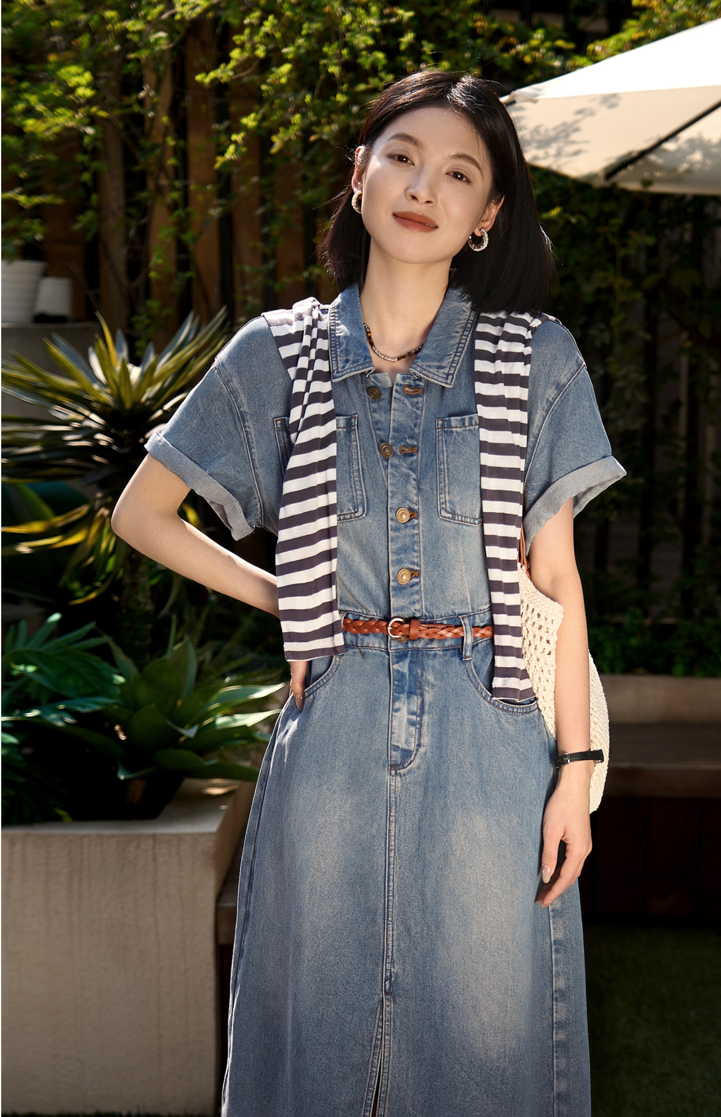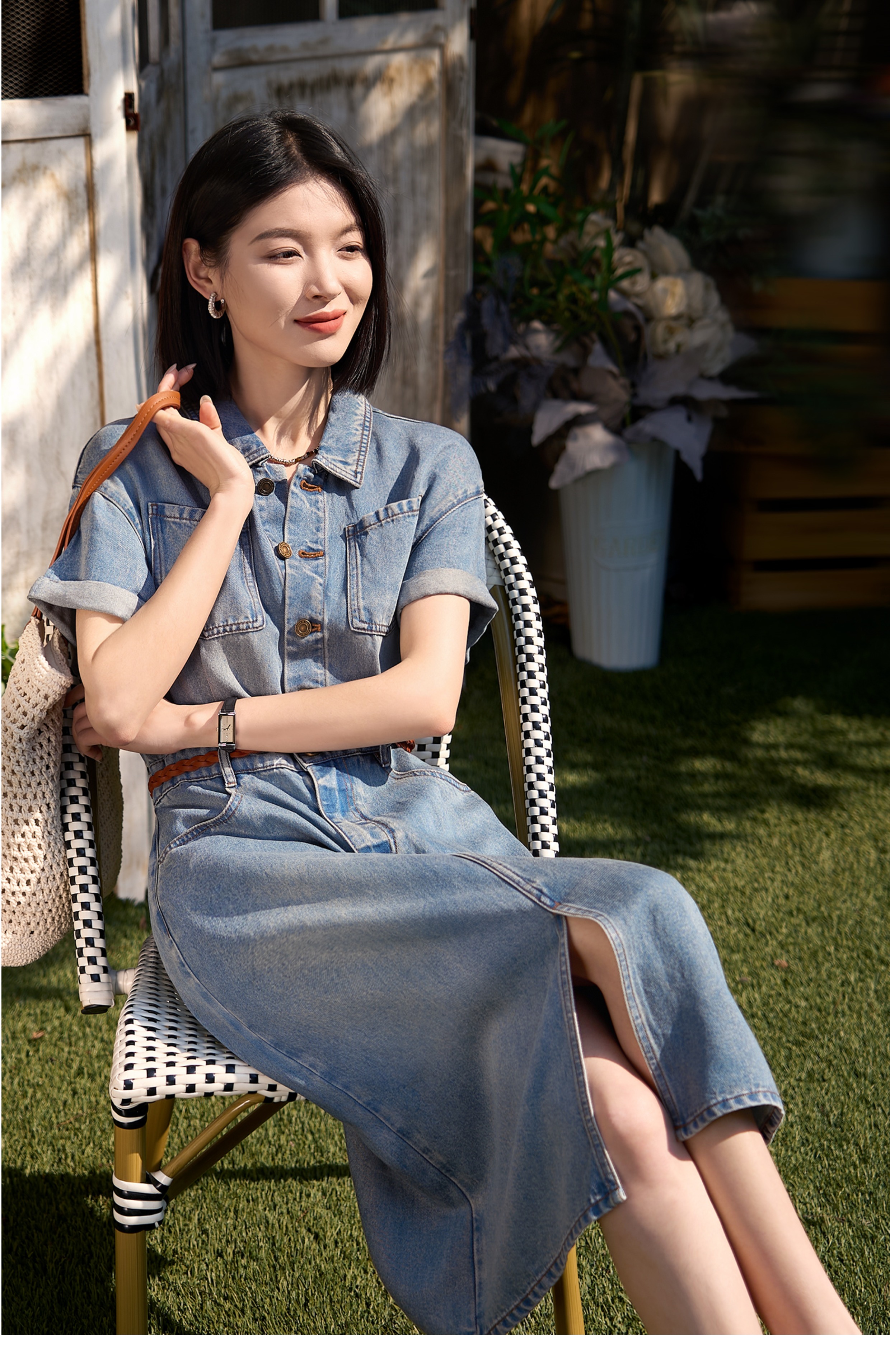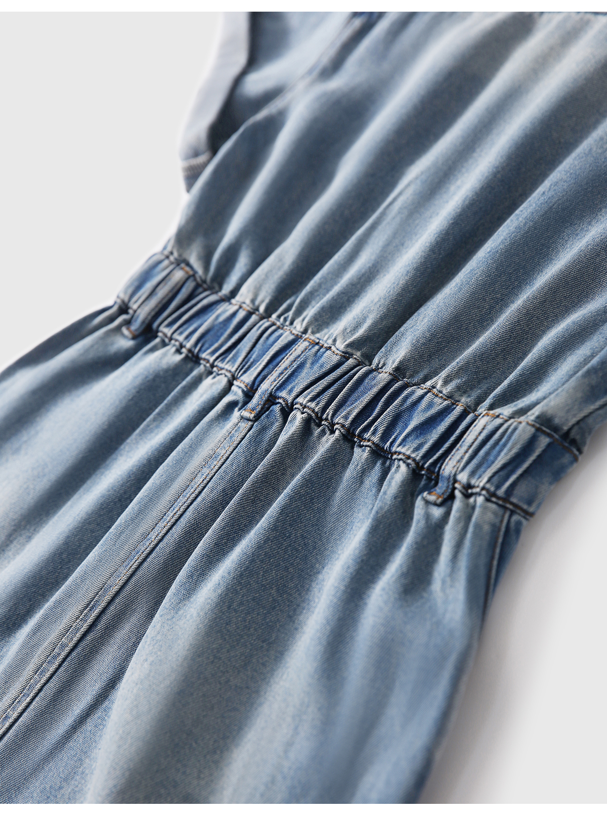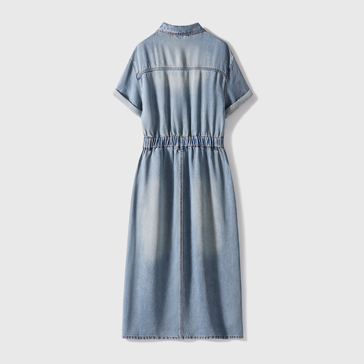 【丹甯時刻-天絲牛仔裙】清爽高腰顯瘦休閒短袖連衣裙春季新款の