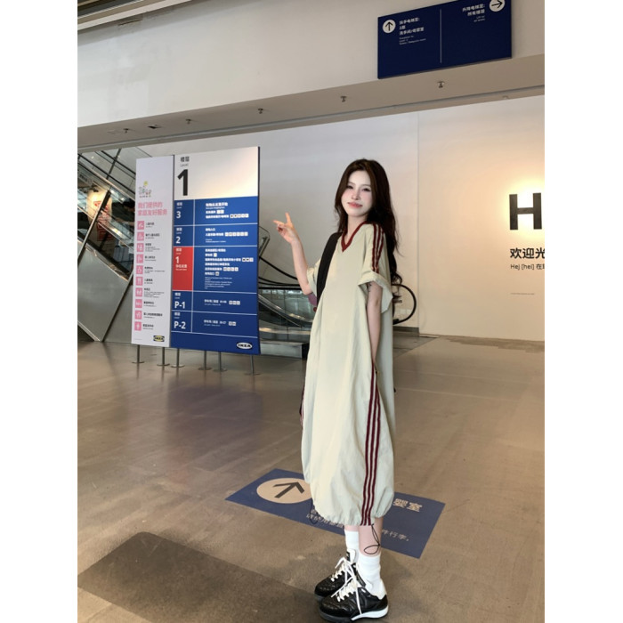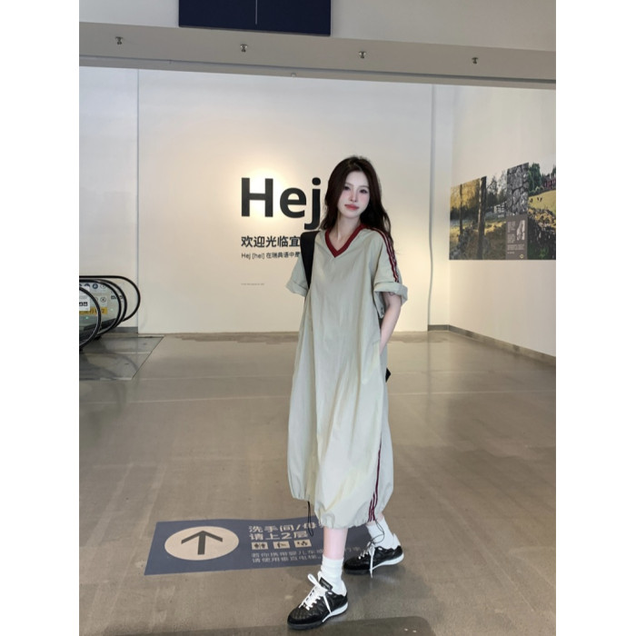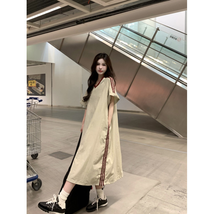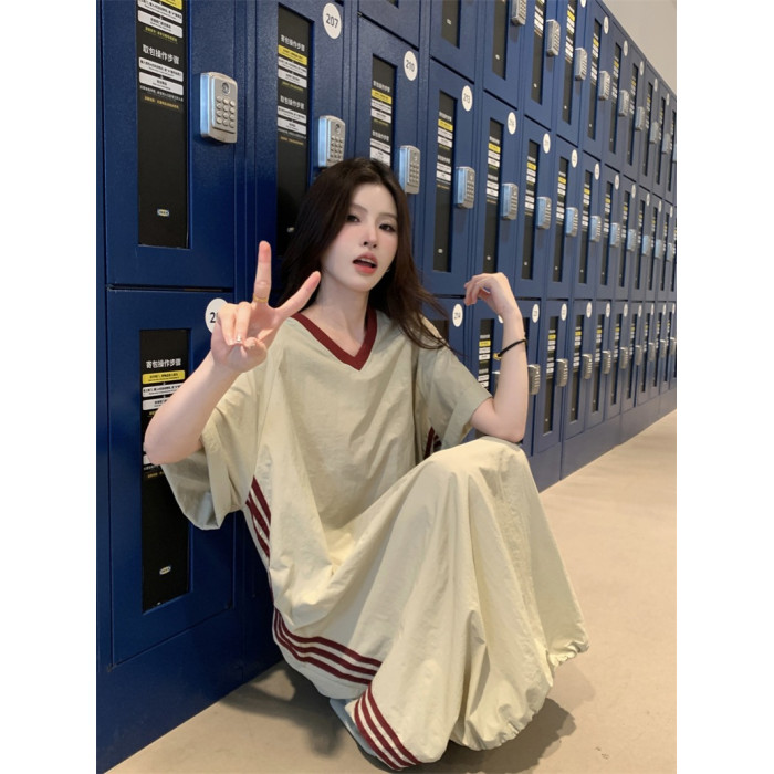 美式復古撞色杠條v領速乾短袖連衣裙女夏寬松顯瘦慵懶風抽繩長裙