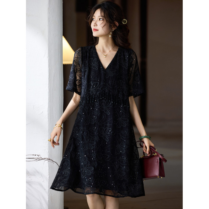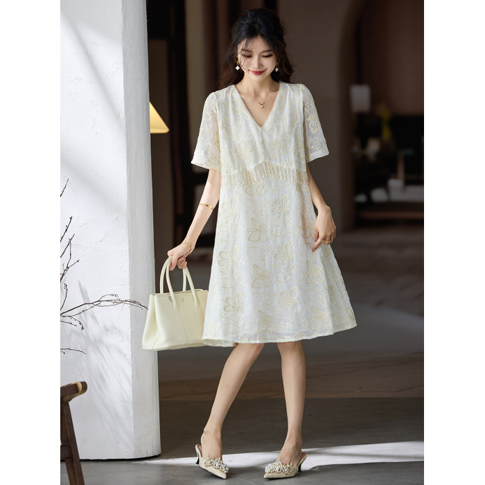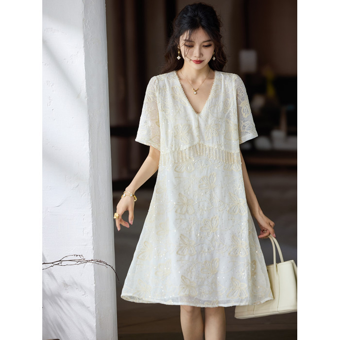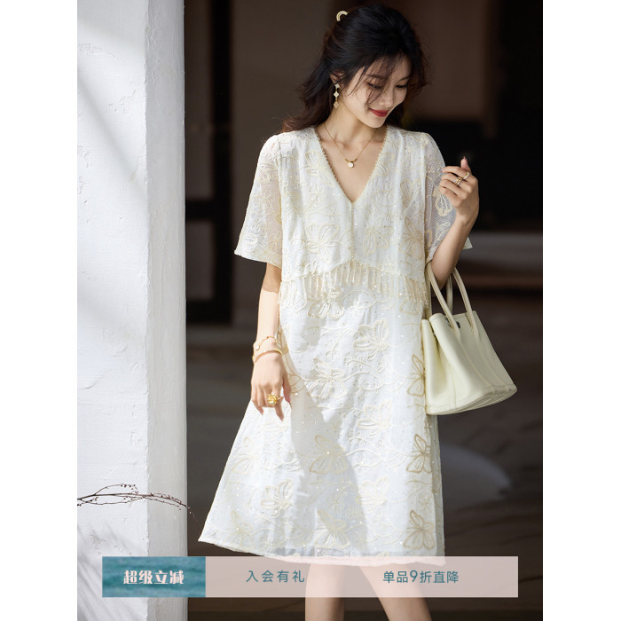 素木洋氣刺綉釘珠白色連衣裙女2025年夏季歐洲站大碼女裝新款裙子