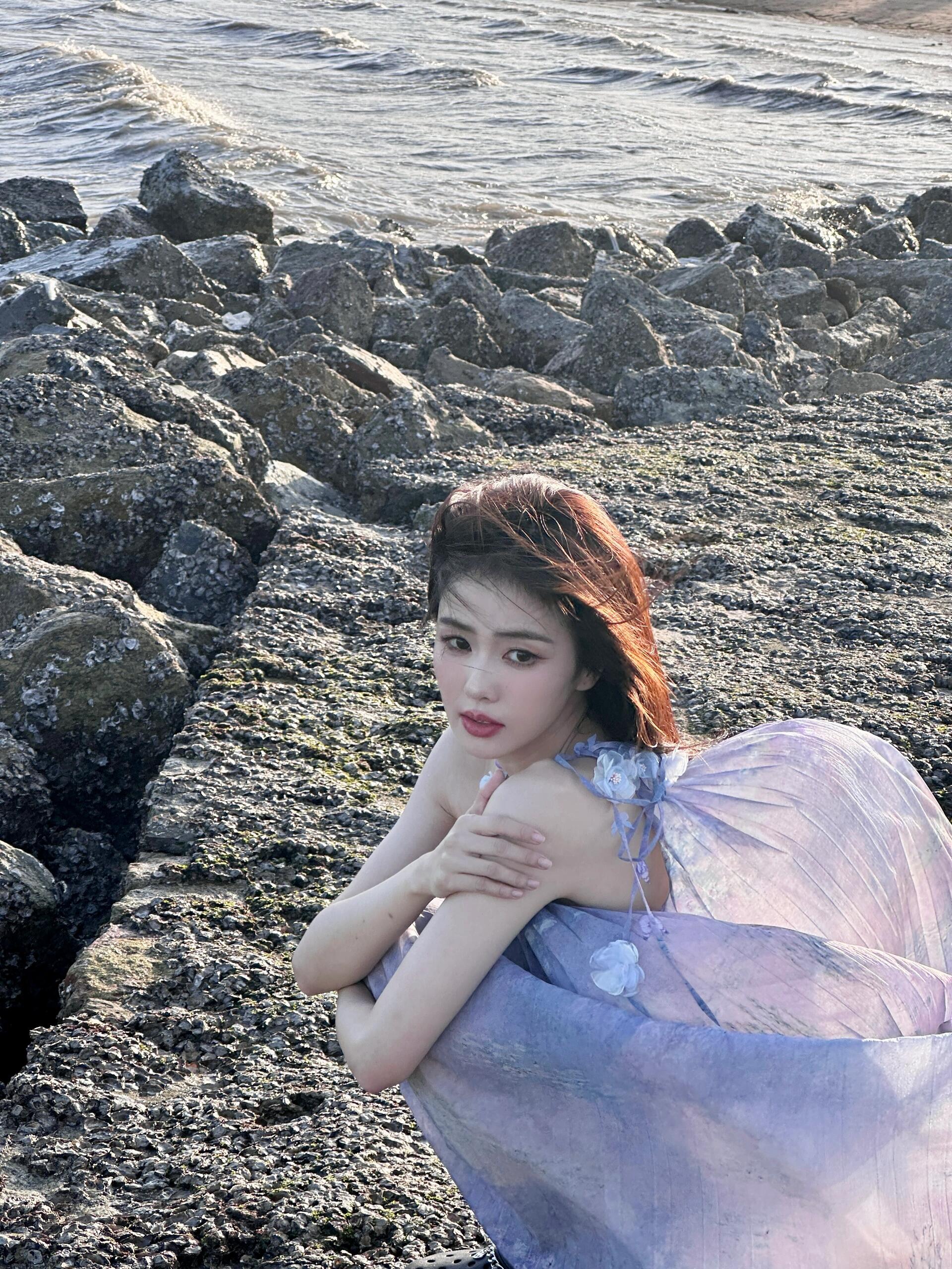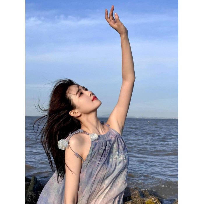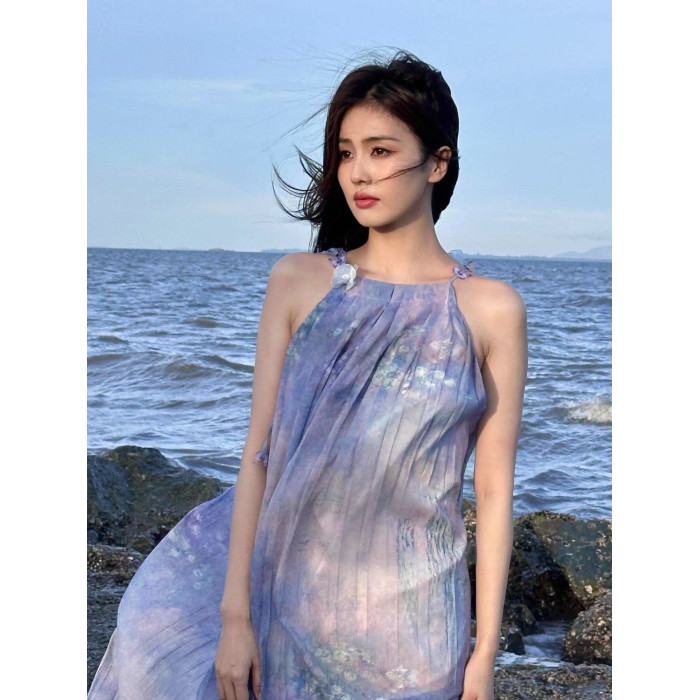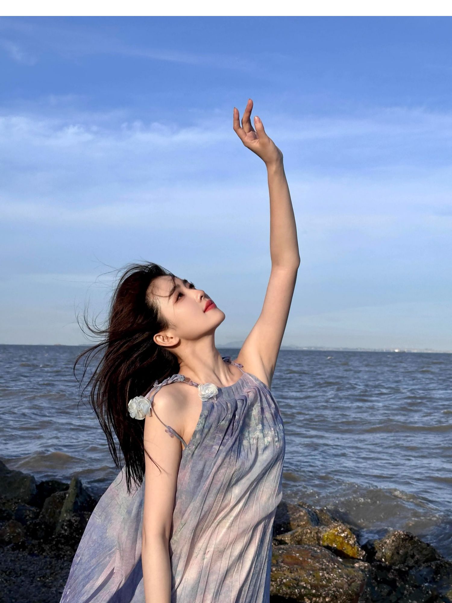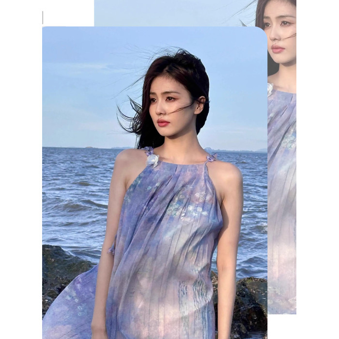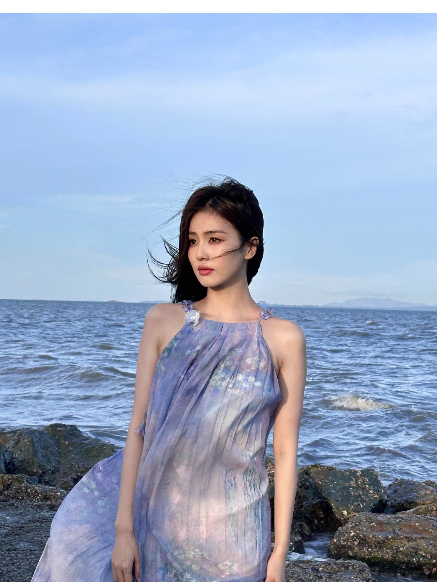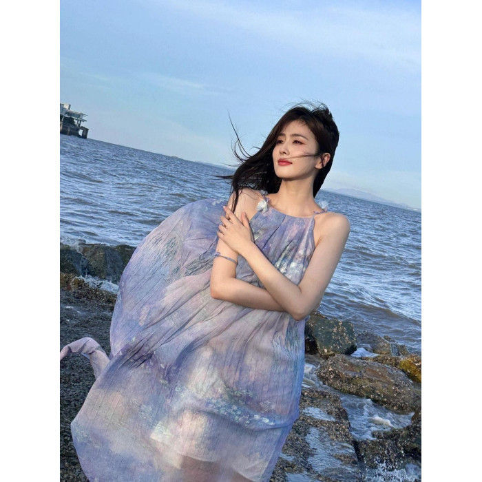 白鹿明星同款紫色海邊度假風吊帶連衣裙寬松慵懶風花朵綁帶長裙女