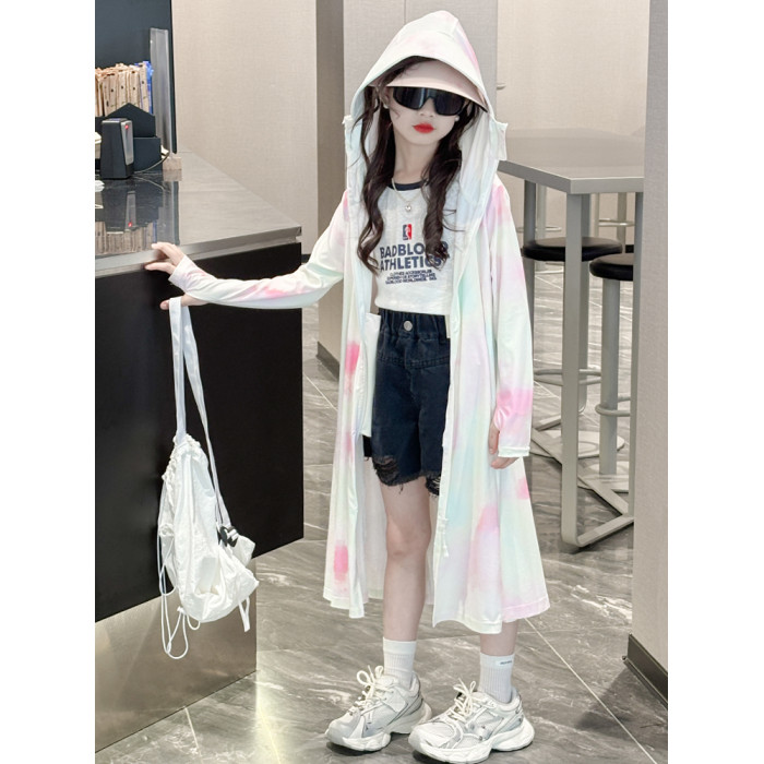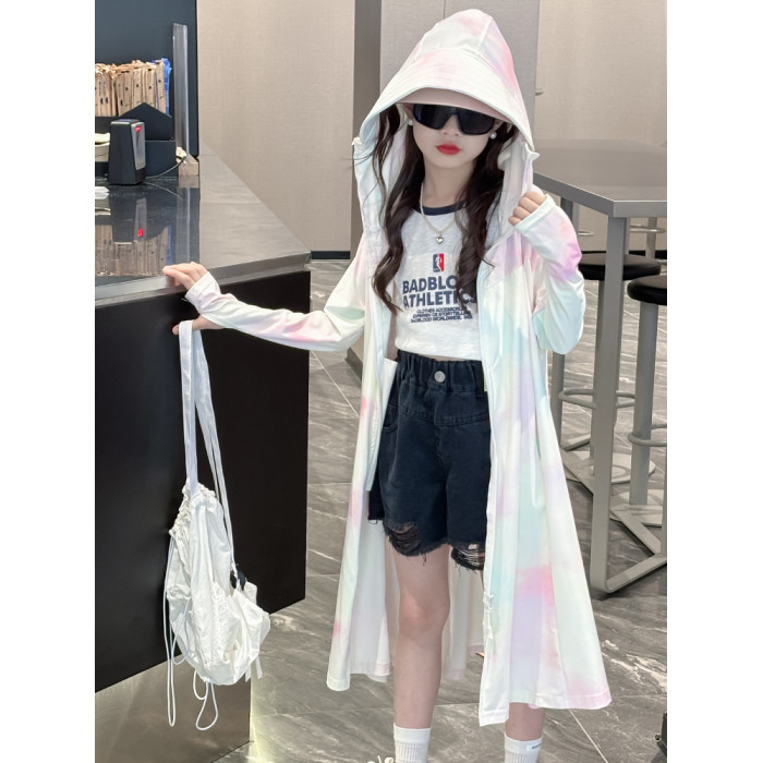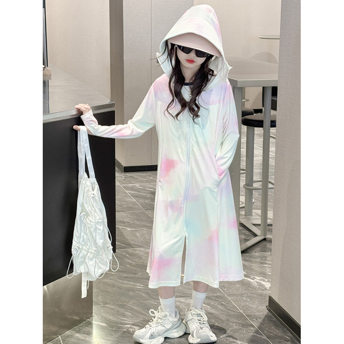 兒童防曬衣涼感冰絲女童夏天長款防曬服連帽軋染漸變色女大童外套