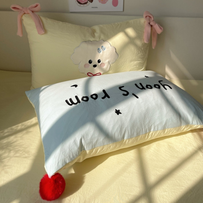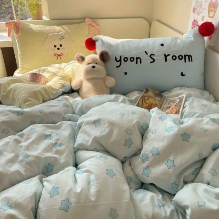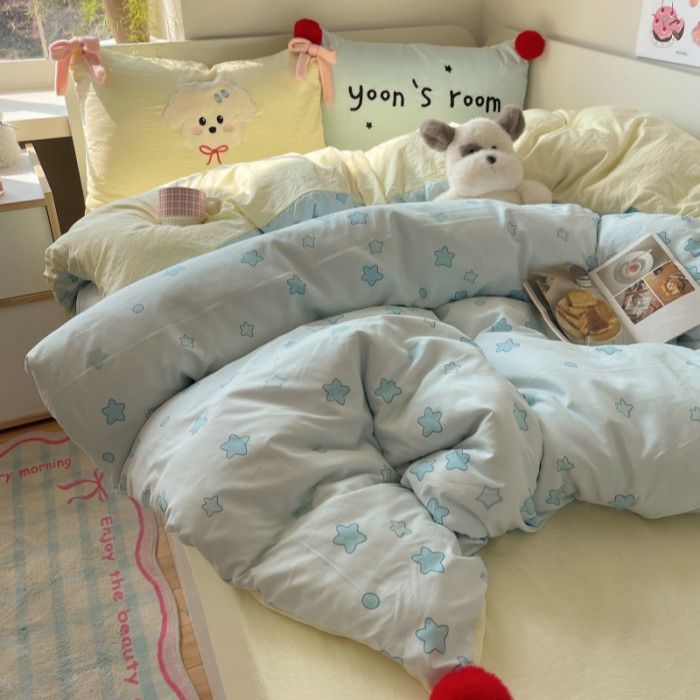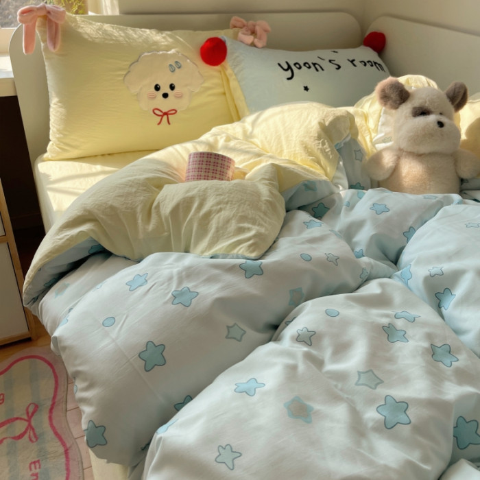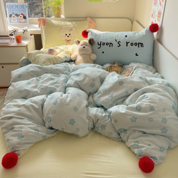 治瘉藍色星星小狗毛球款床單四件套少女柔軟水洗棉被套被單三件套