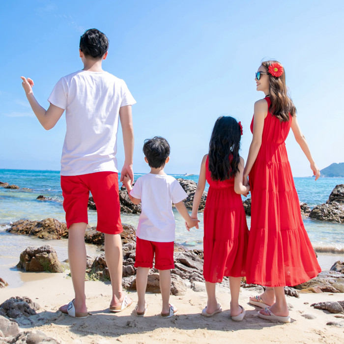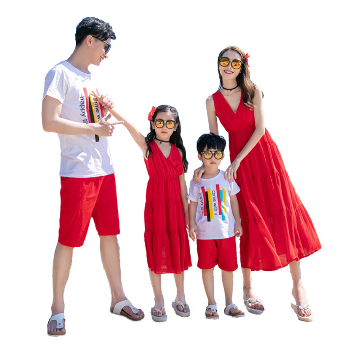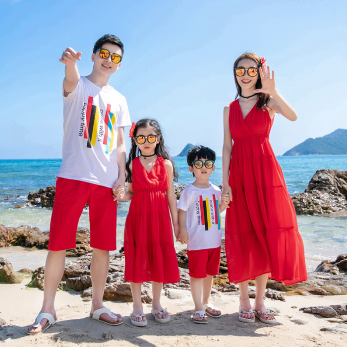 2022夏季沙灘親子裝一家三口四口海邊度假波西米亞雪紡母女連衣裙