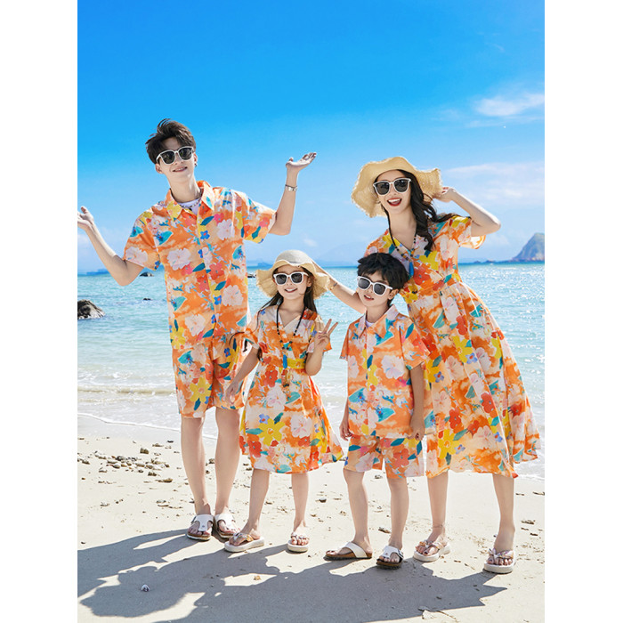 海邊親子裝夏裝一家三四口母子女連衣裙旅遊度假沙灘情侶襯衫套裝