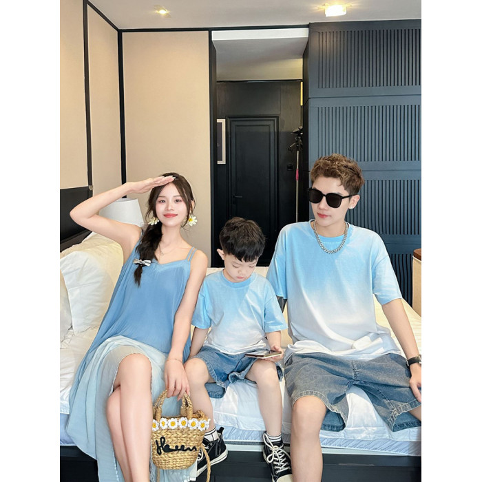 海邊度假風親子裝夏裝一家三口四口漸變藍色母子母女裝吊帶連衣裙