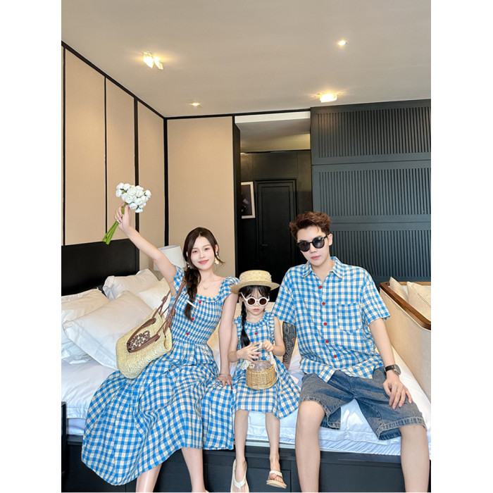 高級親子裝子一家三口夏裝母子裝母女裝小月齡格子襯衫套裝連衣裙