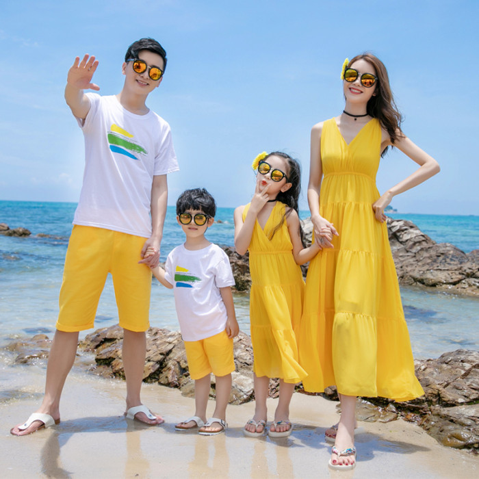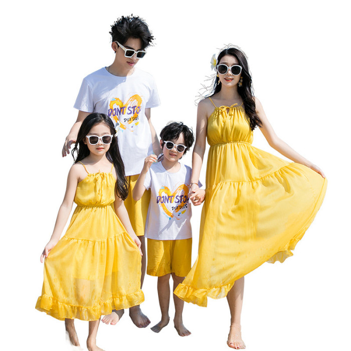 2024夏裝海邊沙灘露營度假親子裝一家三口全家裝母女吊帶連衣裙子