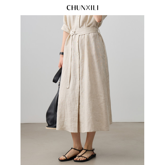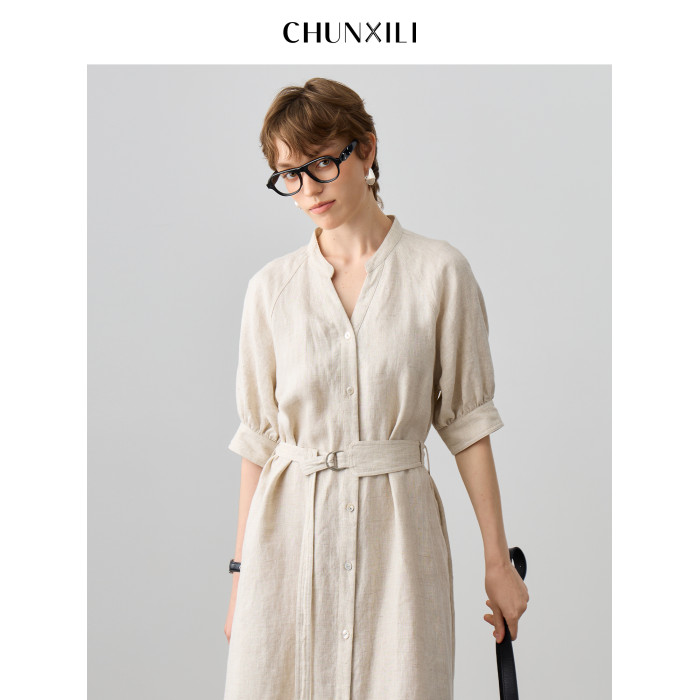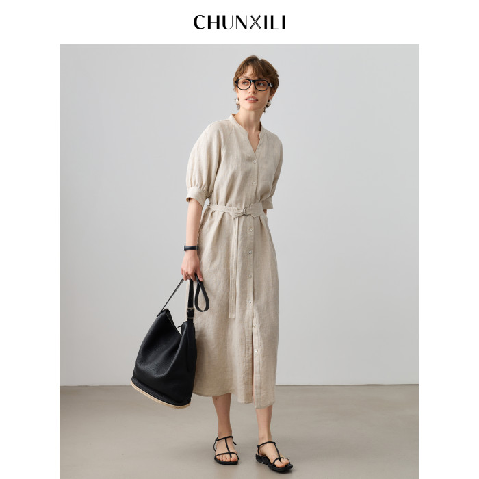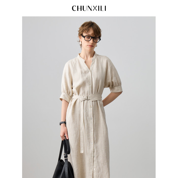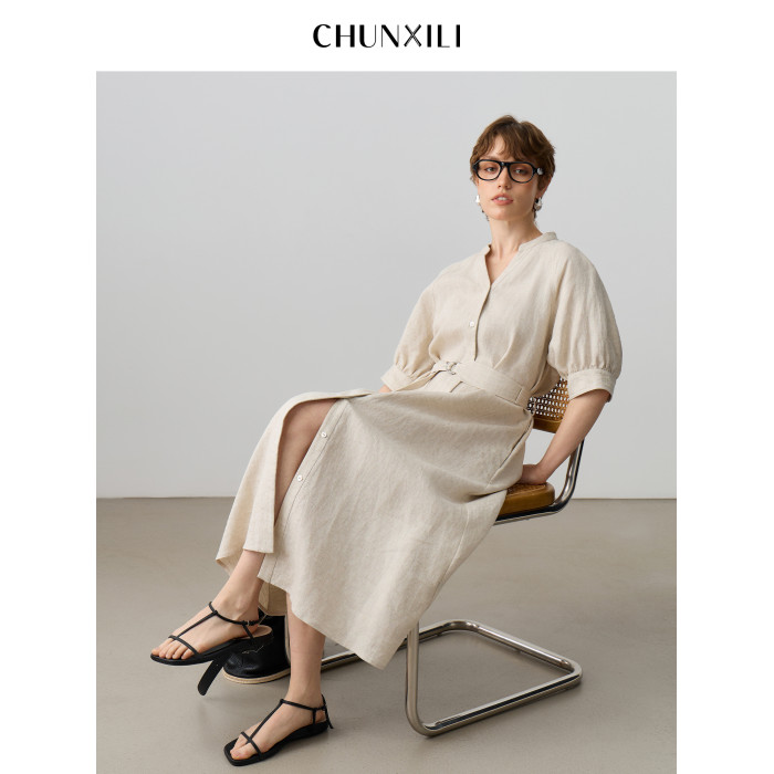 chunxili/春熙裡 V領極簡 老錢風 100亞麻氣質帶腰帶 風衣連衣裙