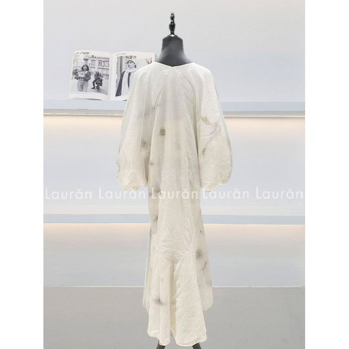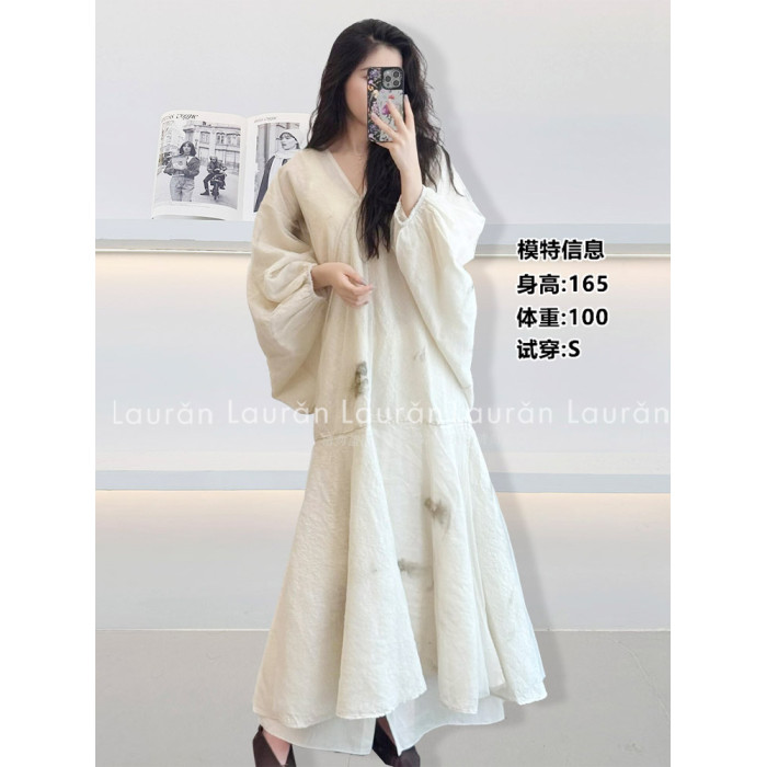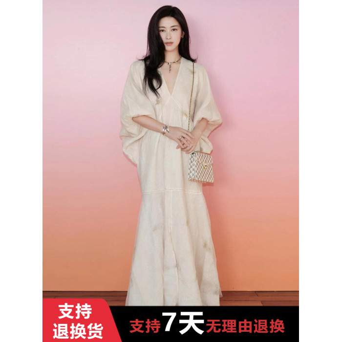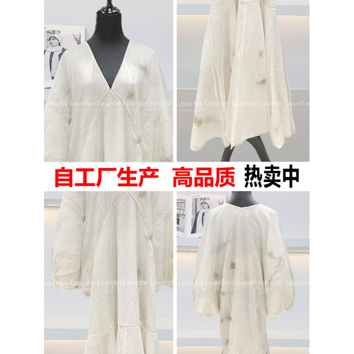 硃珠同款新中式v領雙層紗印花連衣裙女寬松顯瘦復古氣質度假長裙