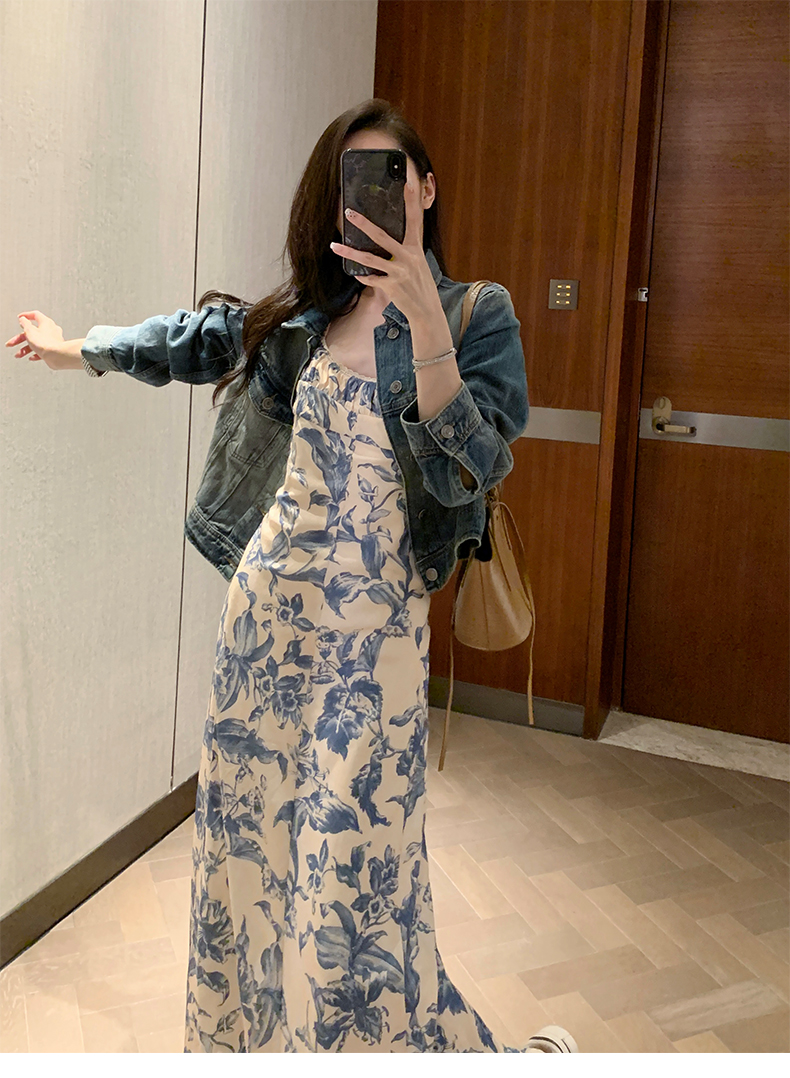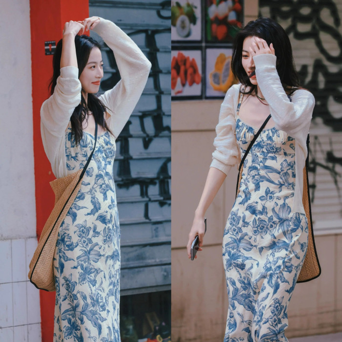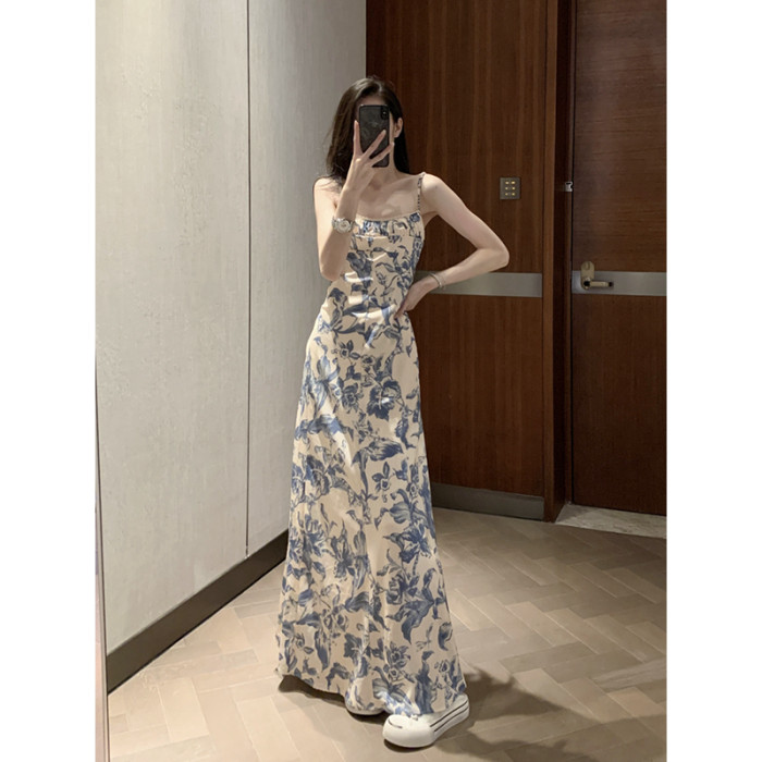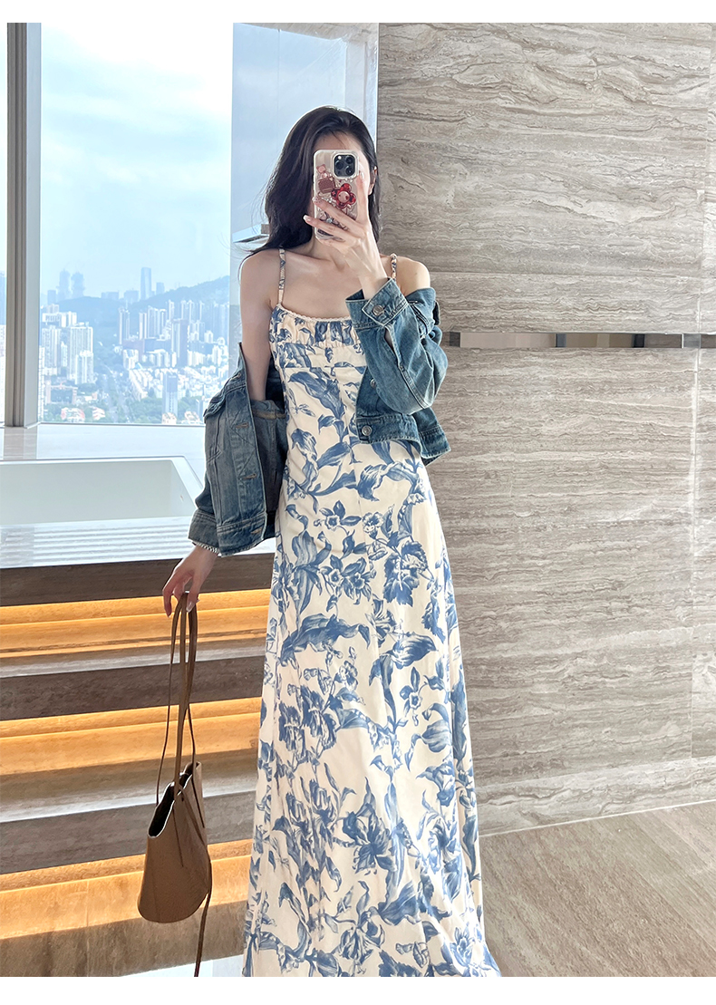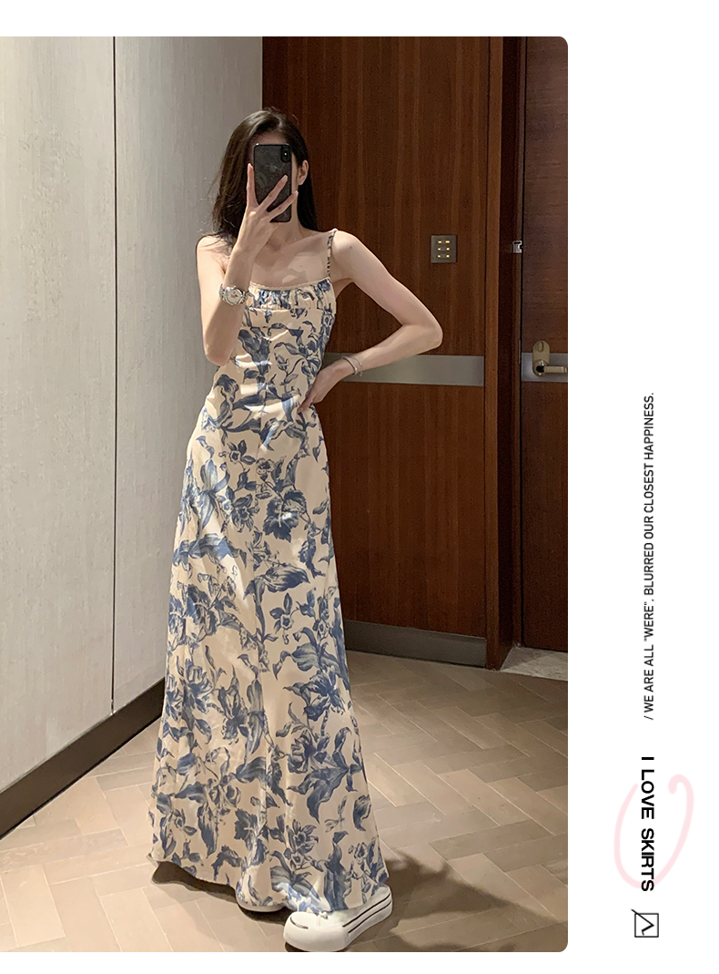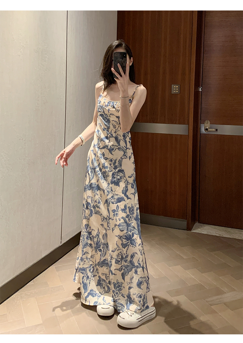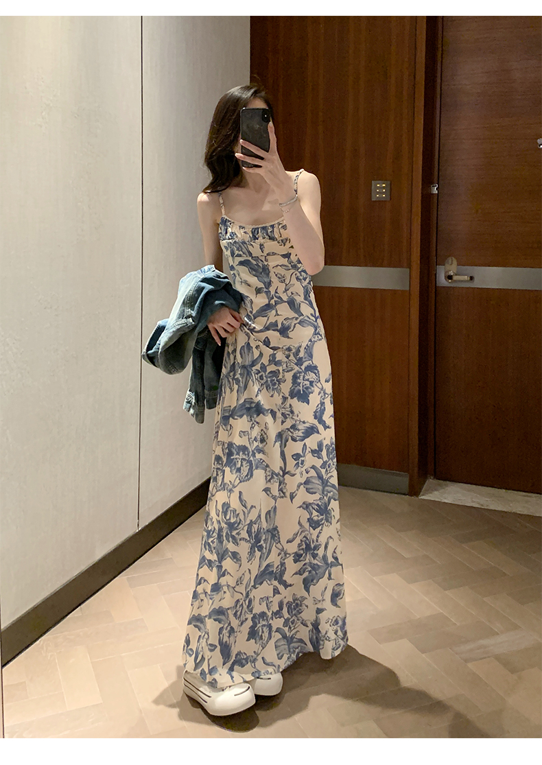周雨彤同款女裝度假風少女感氣質藍色碎花吊帶連衣裙長裙打底裙