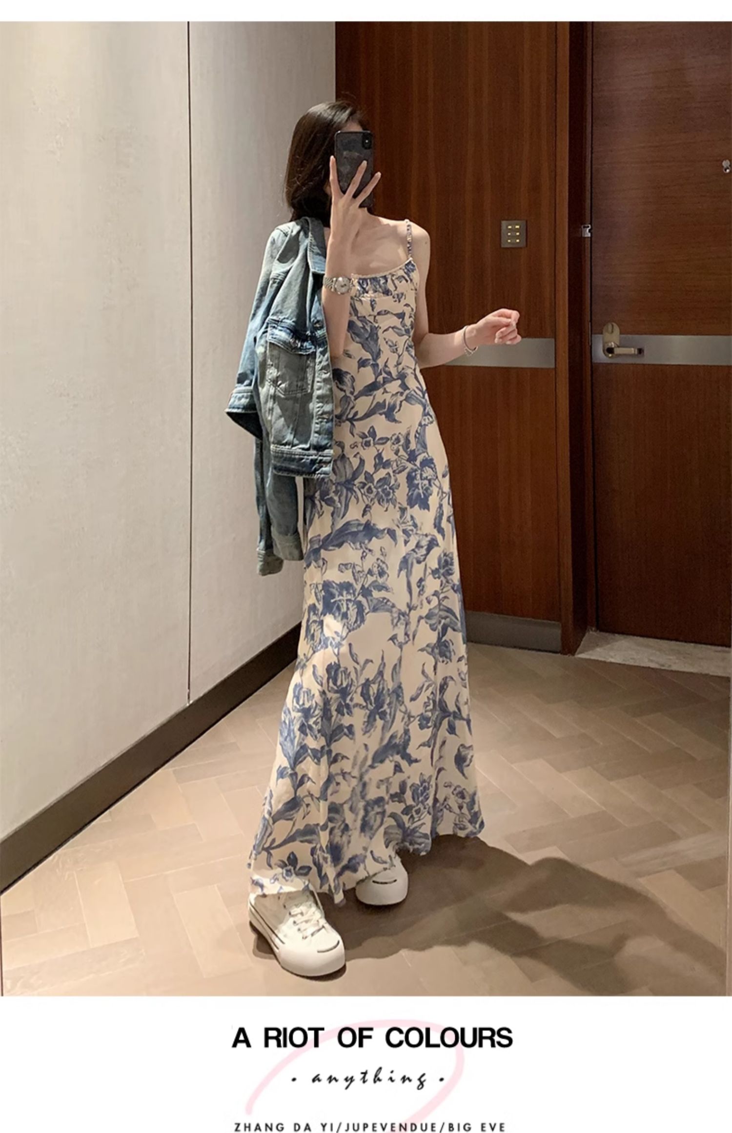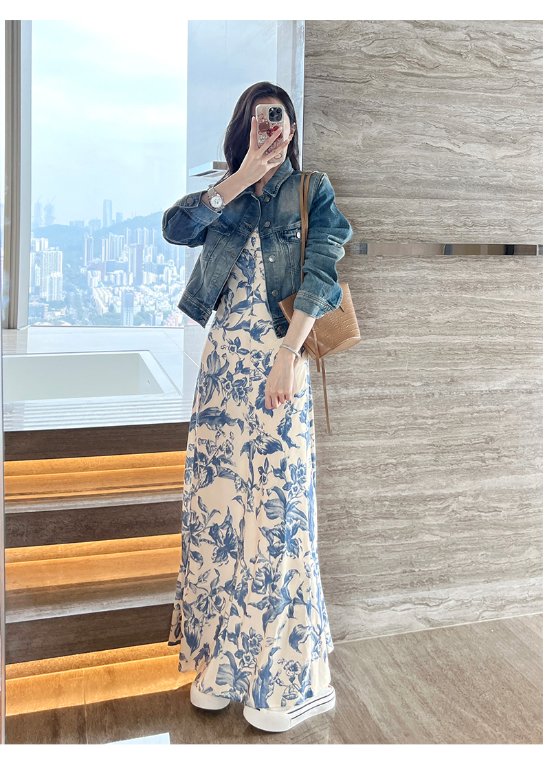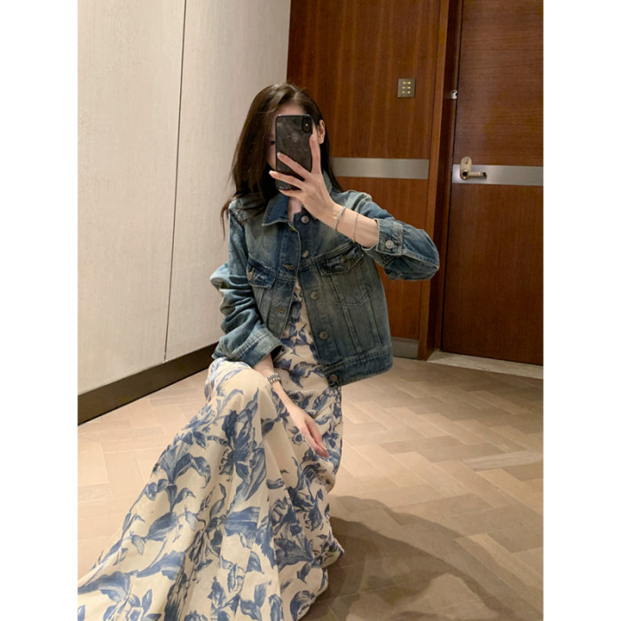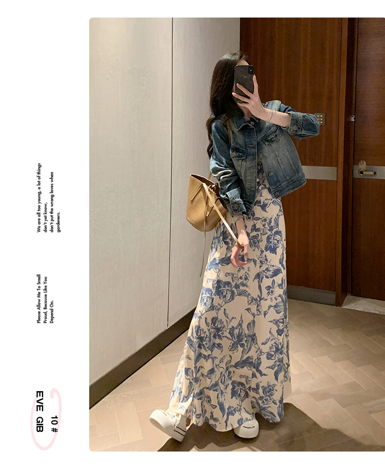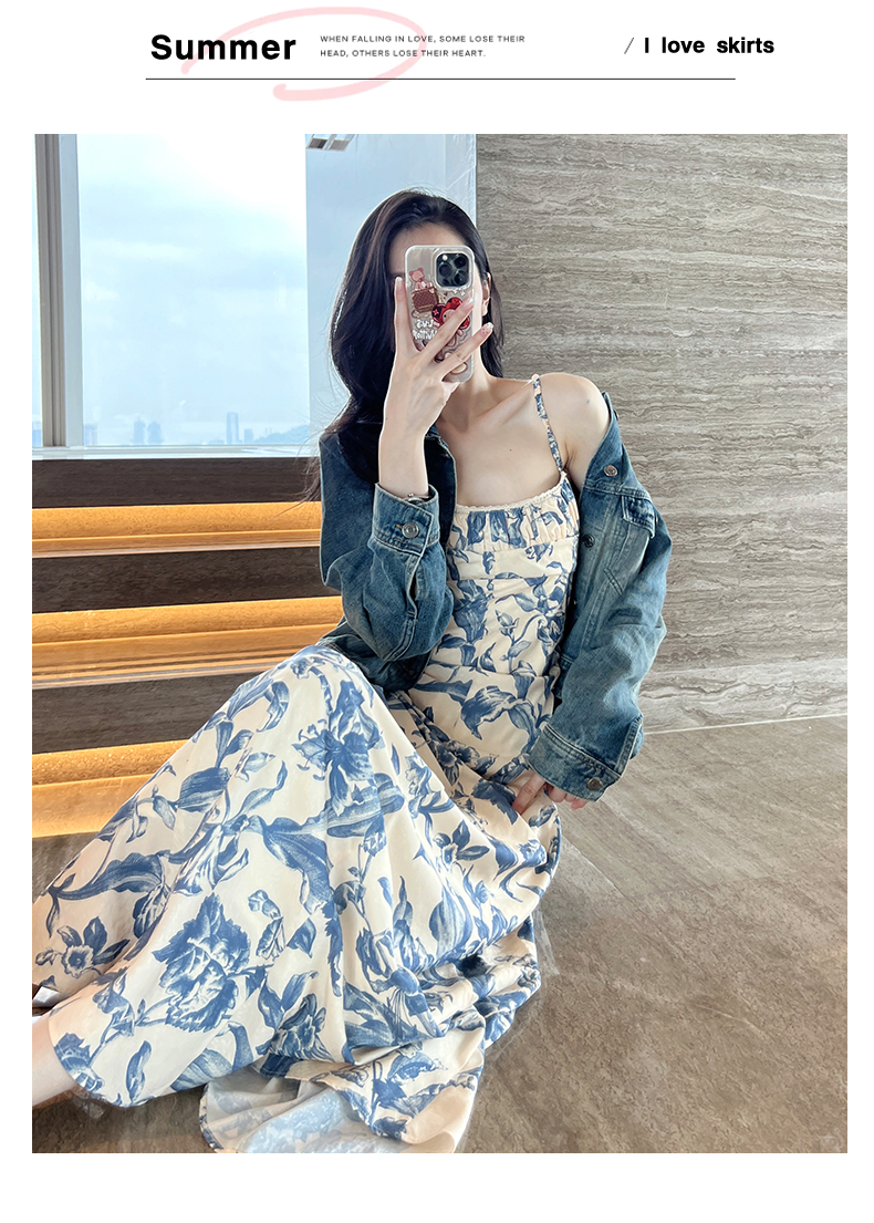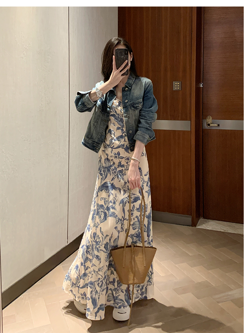 周雨彤同款女裝度假風少女感氣質藍色碎花吊帶連衣裙長裙打底裙