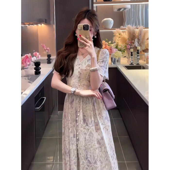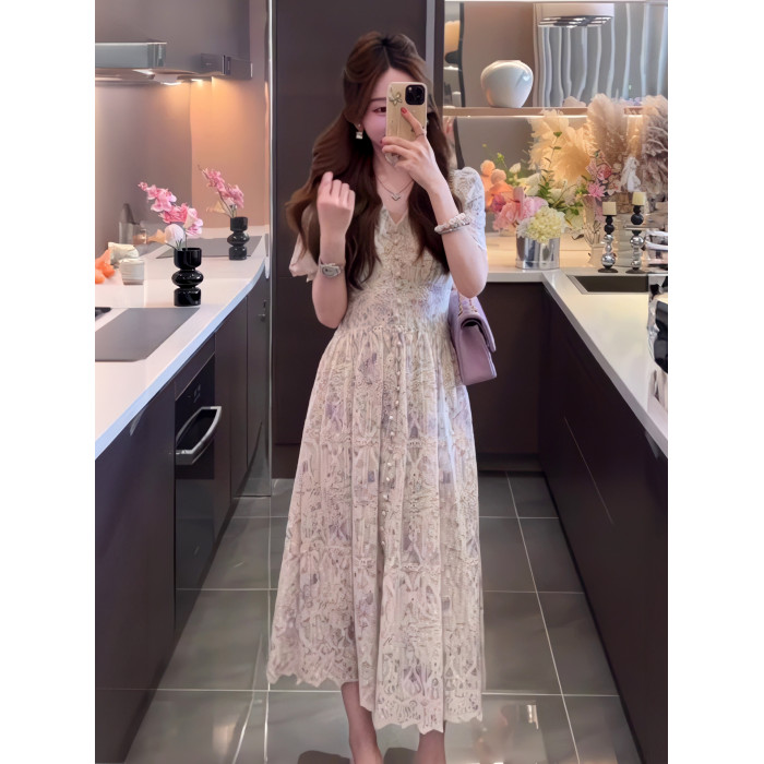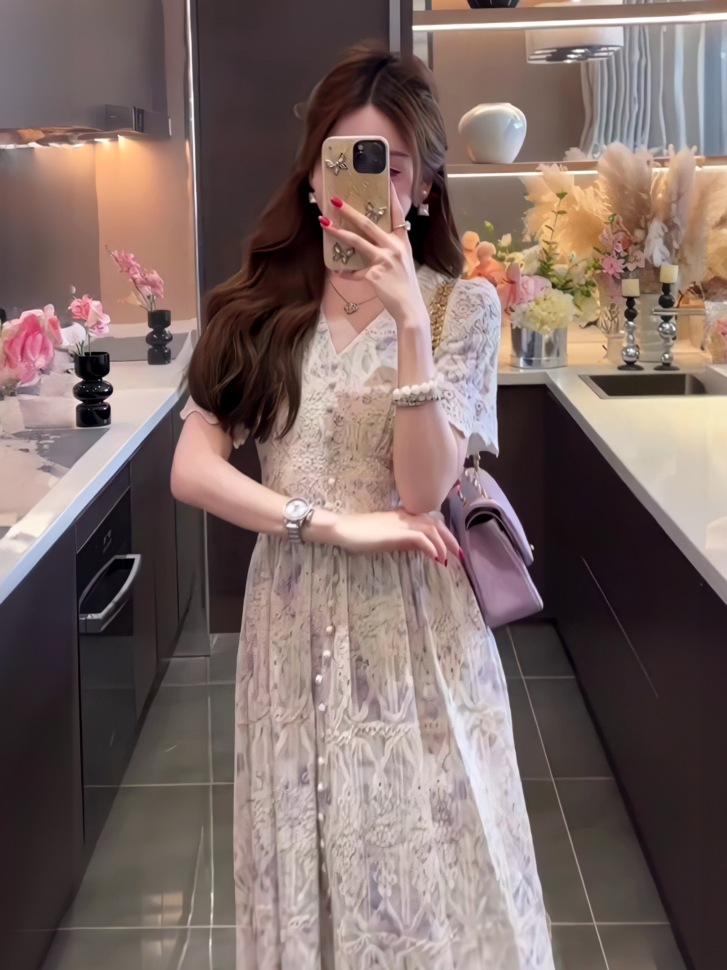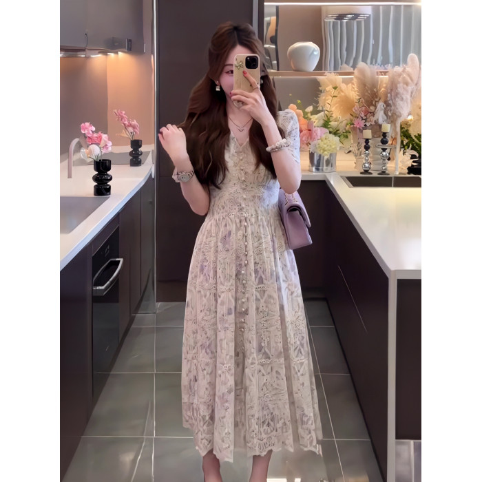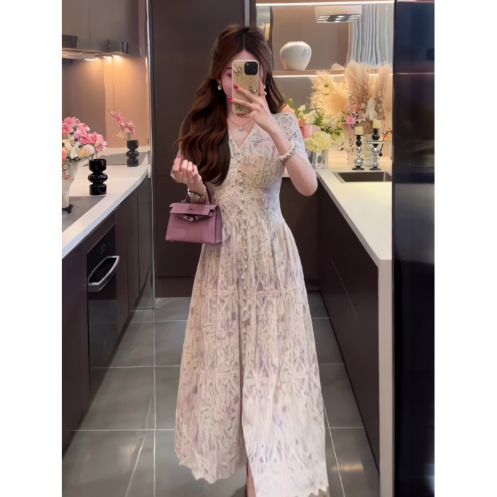 法式浪漫重工設計V領短袖連衣裙女夏季新款時尚輕奢收腰顯瘦上衣