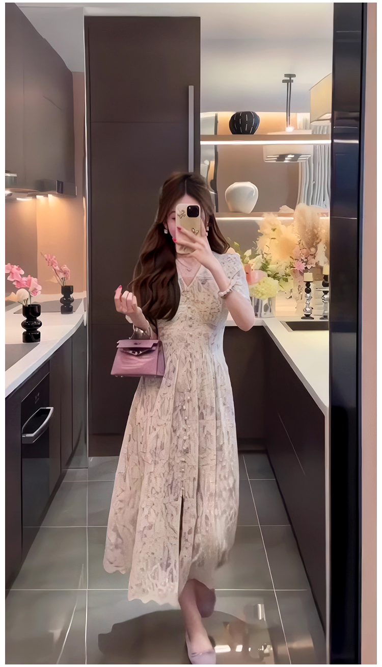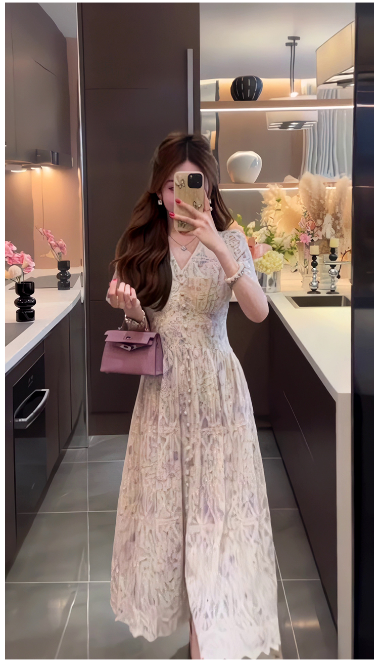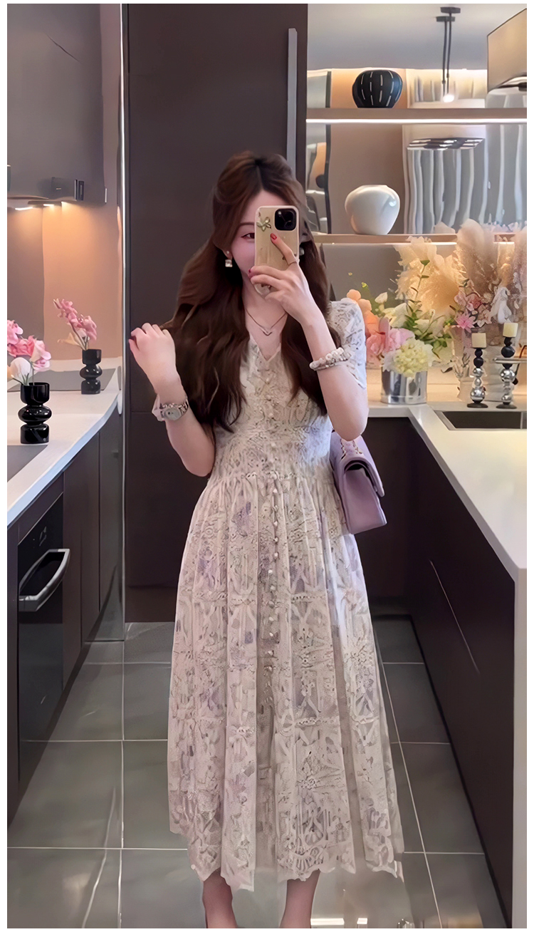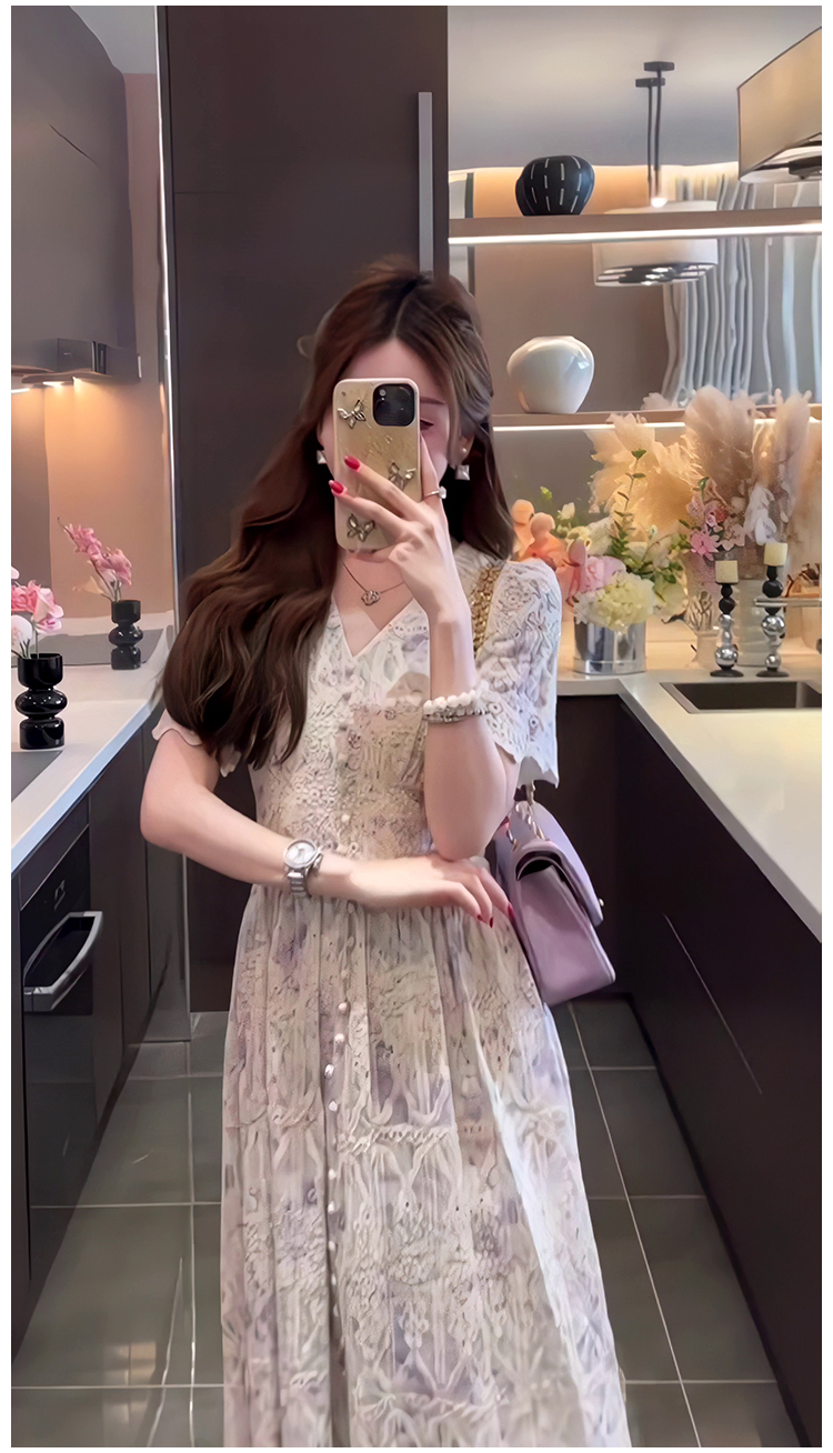 法式浪漫重工設計V領短袖連衣裙女夏季新款時尚輕奢收腰顯瘦上衣